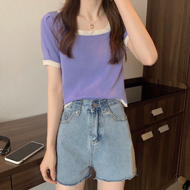 夏の新しいシックなスクエアネックTシャツ薄片半袖アイスシルクニットセーター女性のスーパーヒョンヤスタイルショートトップイン サマー 夏物 スクウェア 7460079946484596 | framboise21