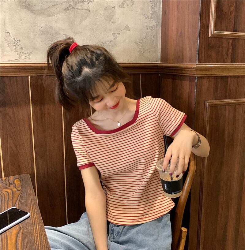 フロントショルダーストライプスクエアネック半袖Tシャツレディースサマーデザインニッチスリムフィットスリムトップ2022新しいTシャツ 夏物 スクウェア 7460066685649777 | framboise21