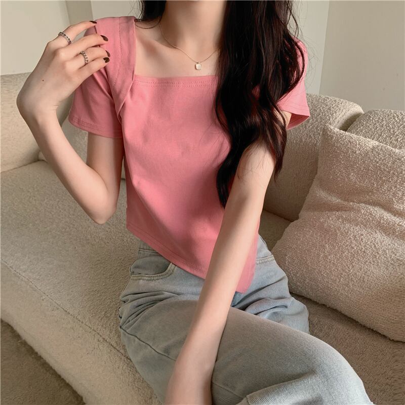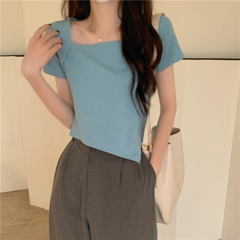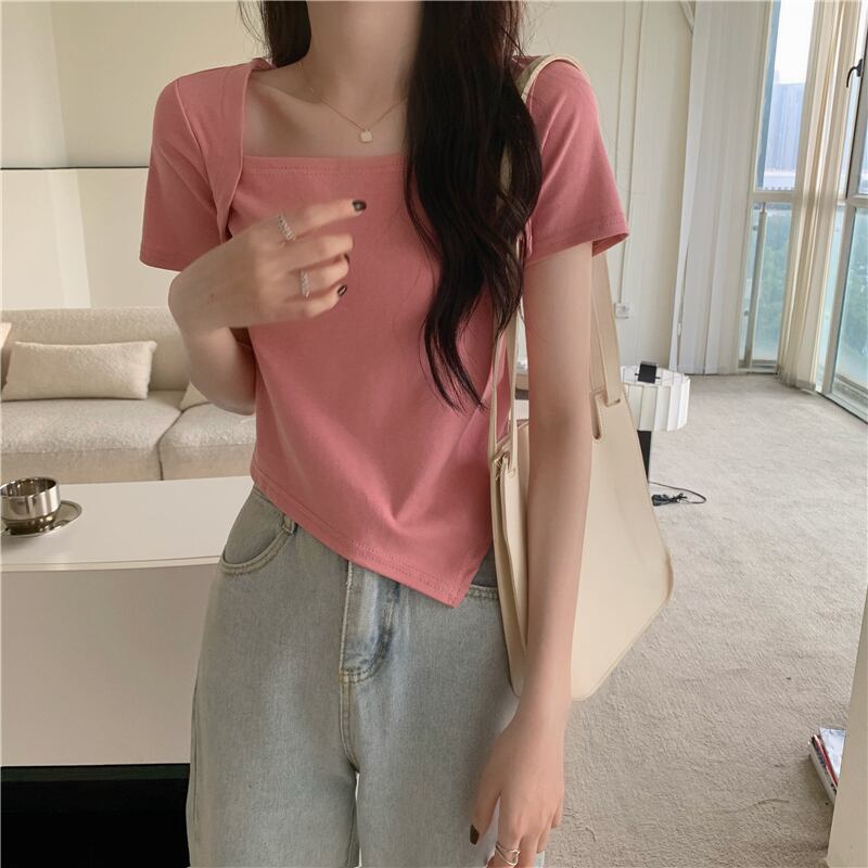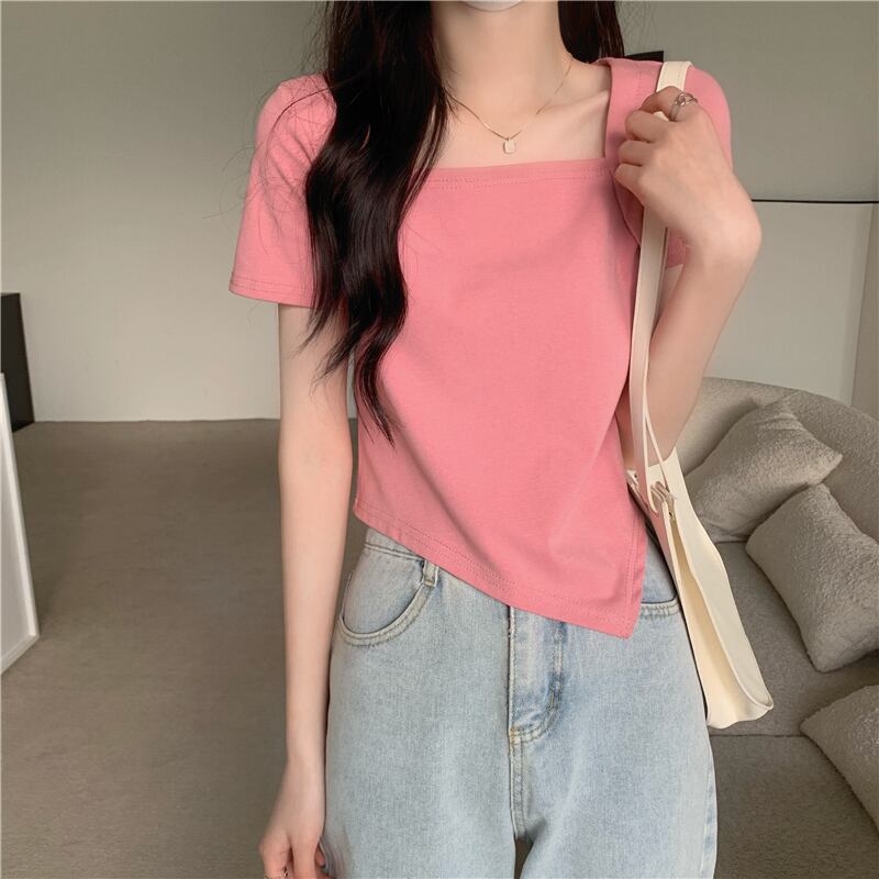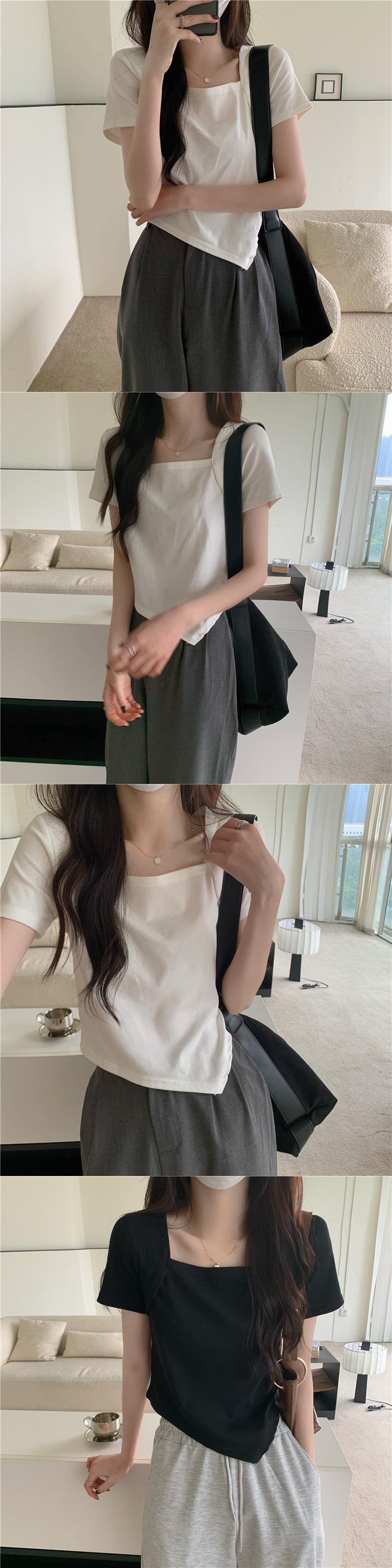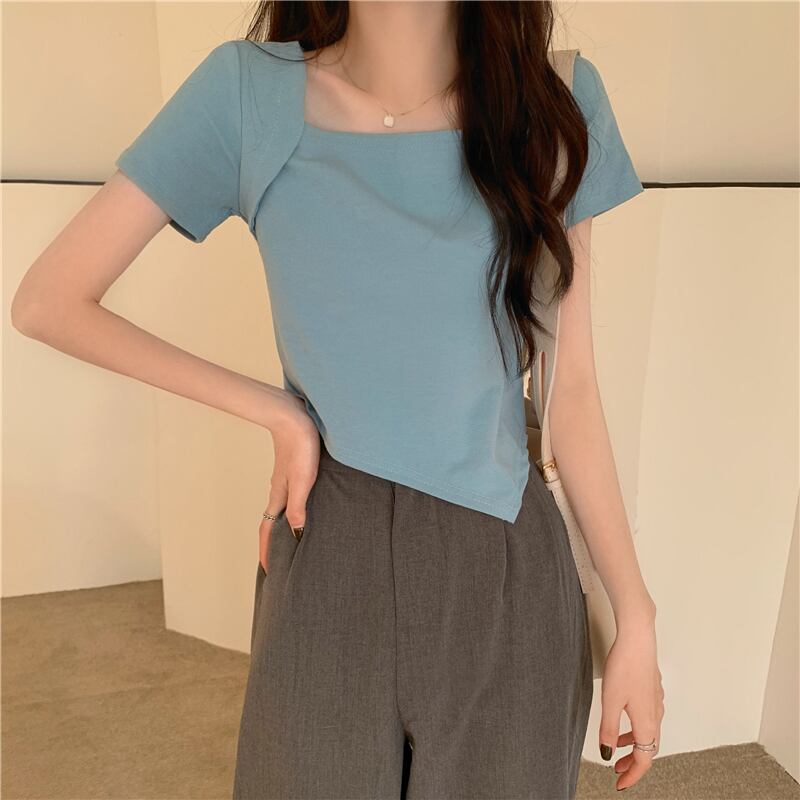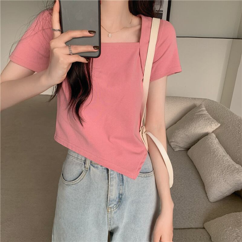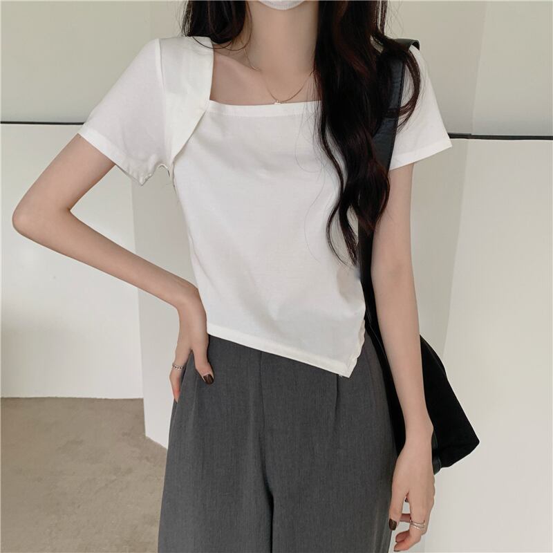 ホワイトスクエアカラー不規則な半袖Tシャツ女性の夏夏フロントショルダーTシャツデザインニッチ純綿ショートトップ コットン サマー 夏物 ピュア スクウェア 7460069586638241 | framboise21