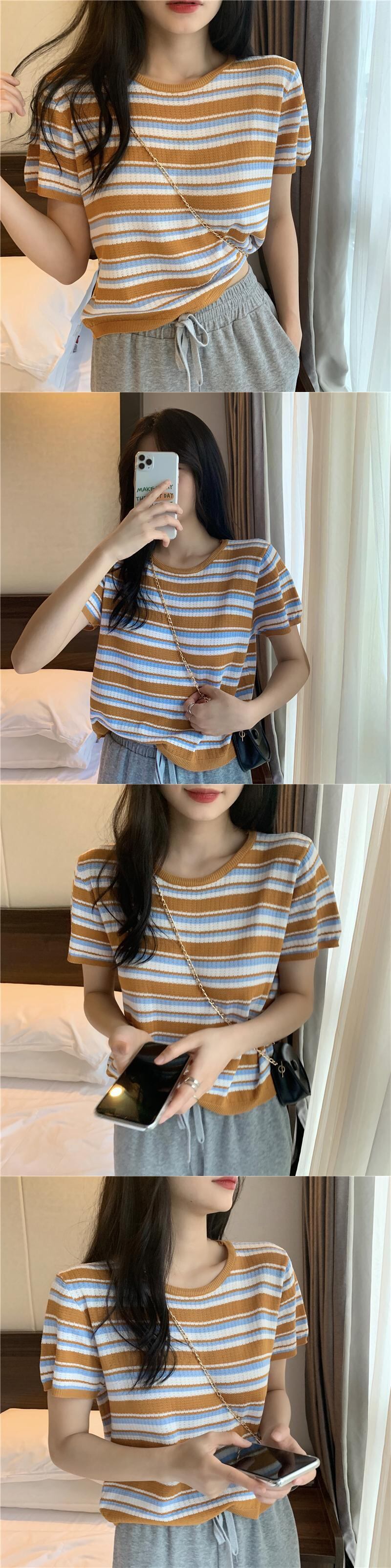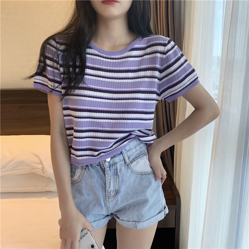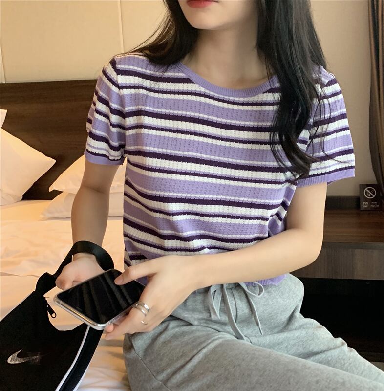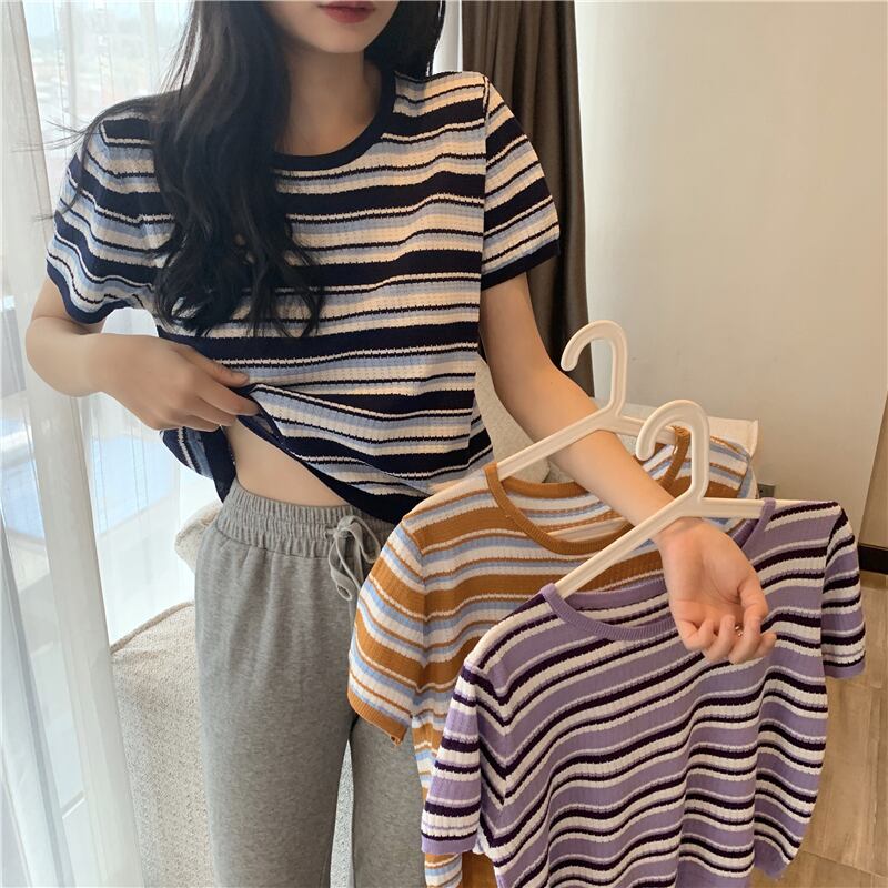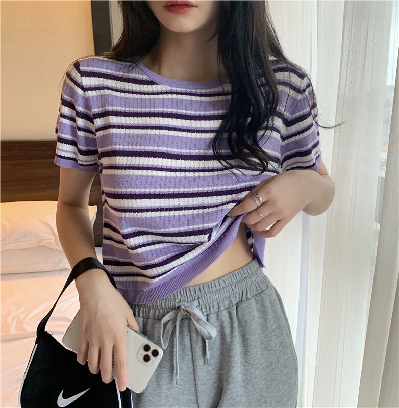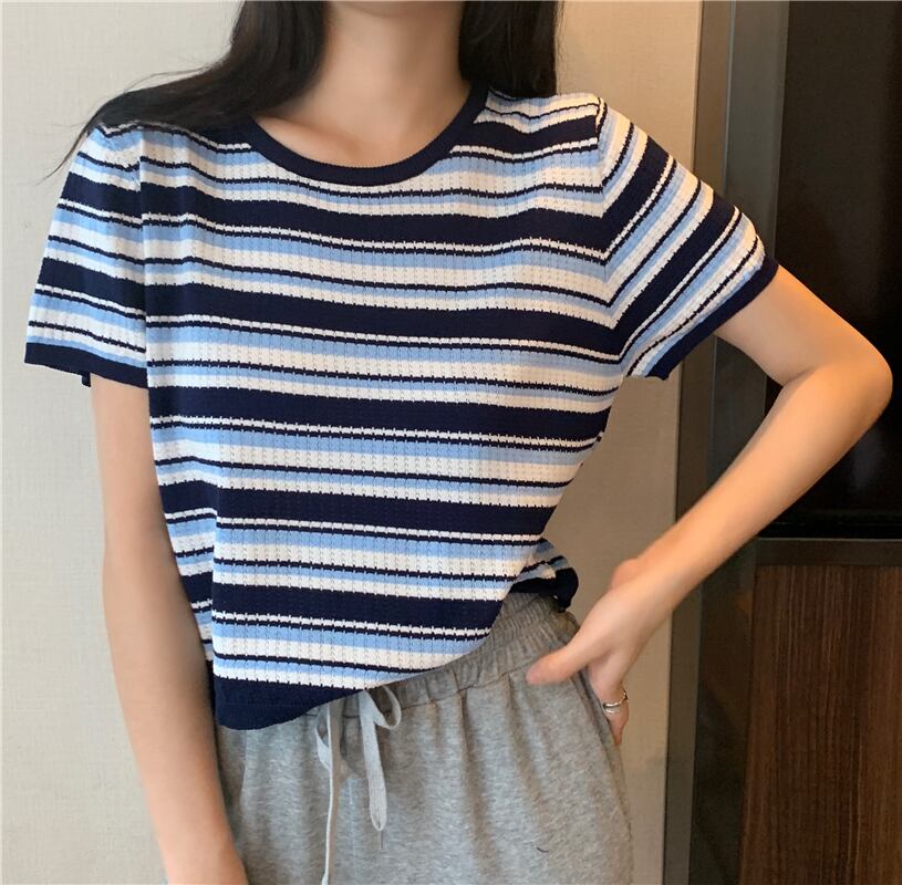 ニットストライプ半袖Tシャツレディース2022年夏新作デザインニッチハイウエストルーズアイスシルクショートトップ ハイウェスト サマー 夏物 7460080268951341 | framboise21