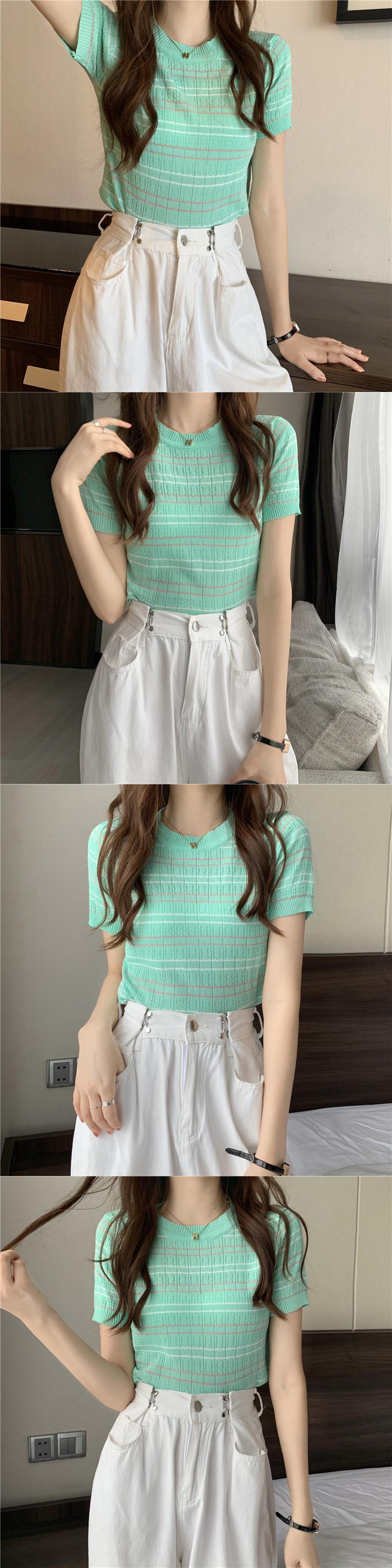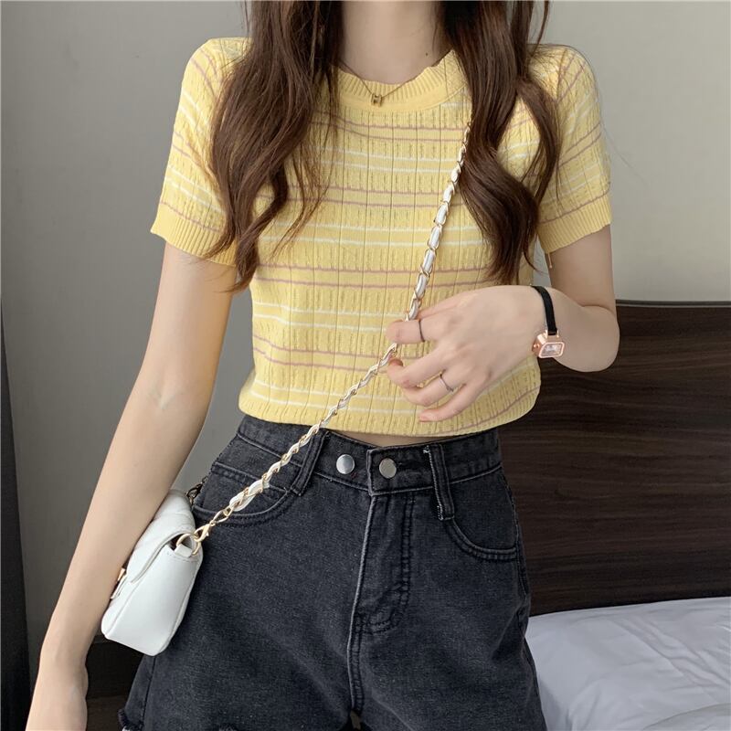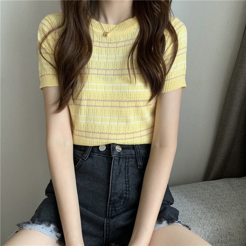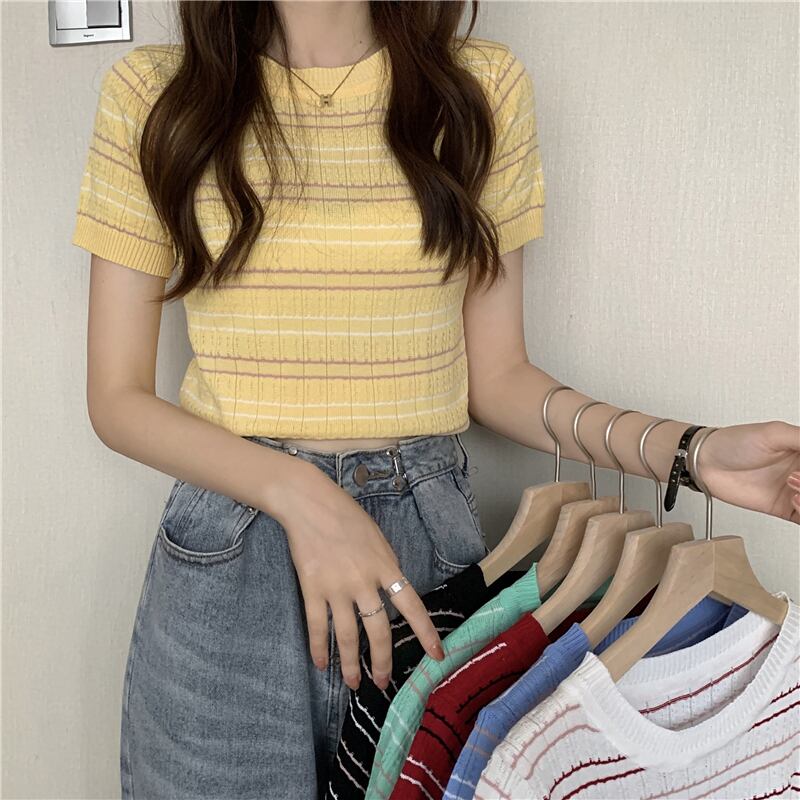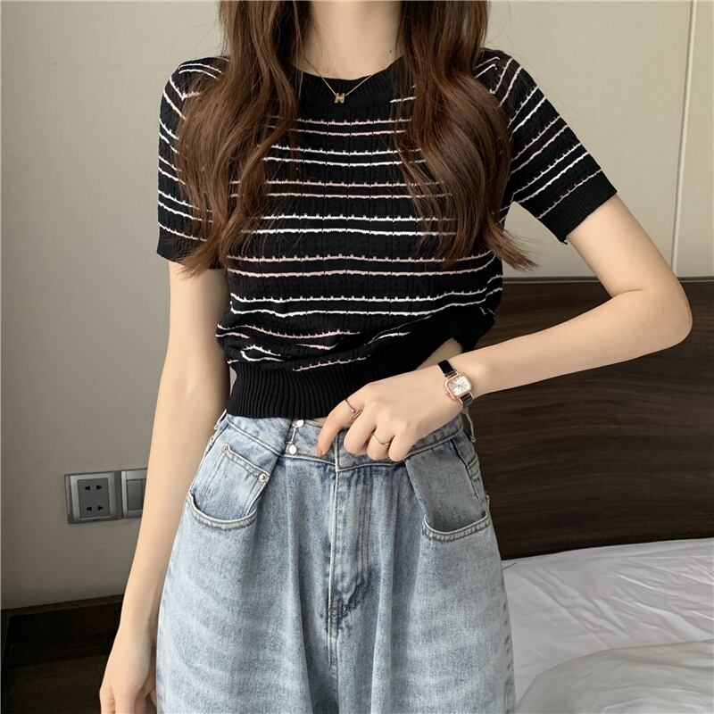 ストライプ半袖Tシャツレディース2022年夏ニューウエスタンスタイルショートスリムラウンドネックニットTシャツアイスシルクトップトレンディ サマー 夏物 Oネック 7460010219342501 | framboise21