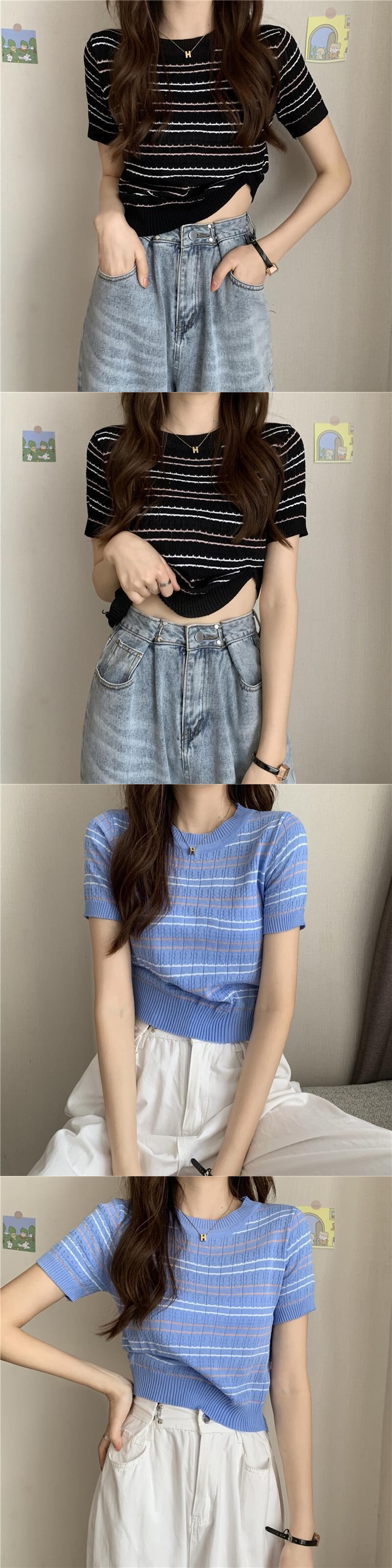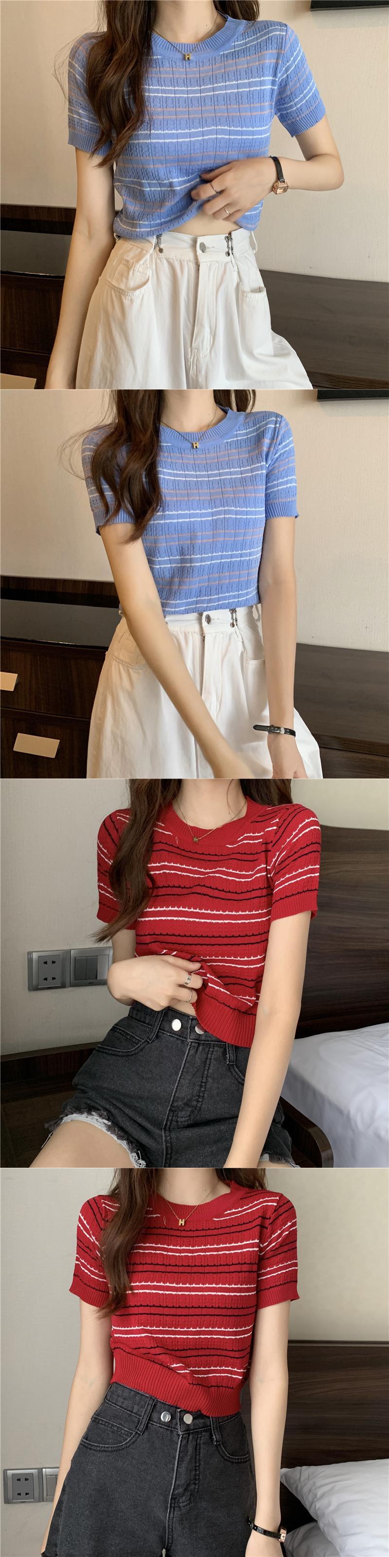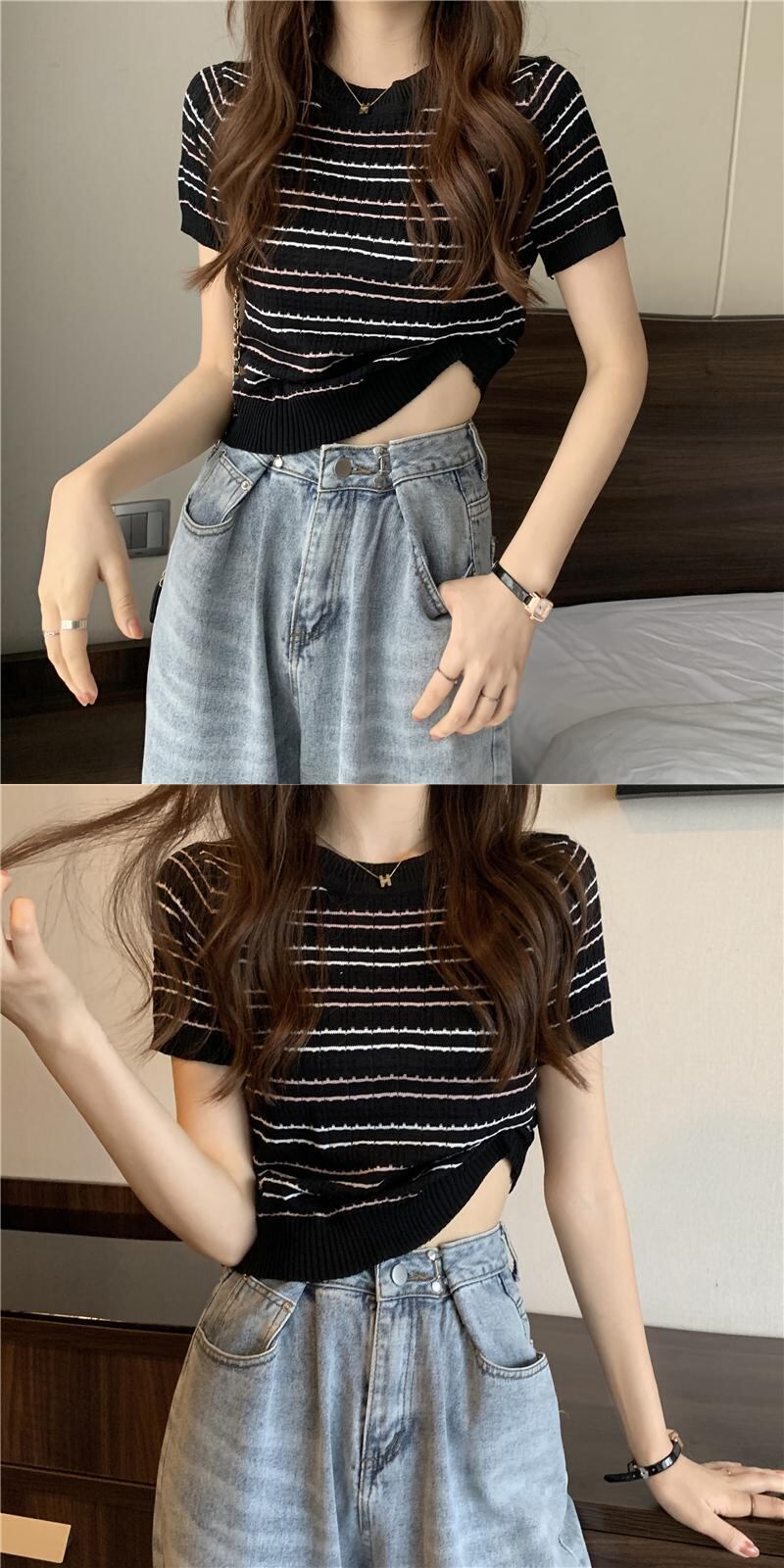 ストライプ半袖Tシャツレディース2022年夏ニューウエスタンスタイルショートスリムラウンドネックニットTシャツアイスシルクトップトレンディ サマー 夏物 Oネック 7460010219342501 | framboise21