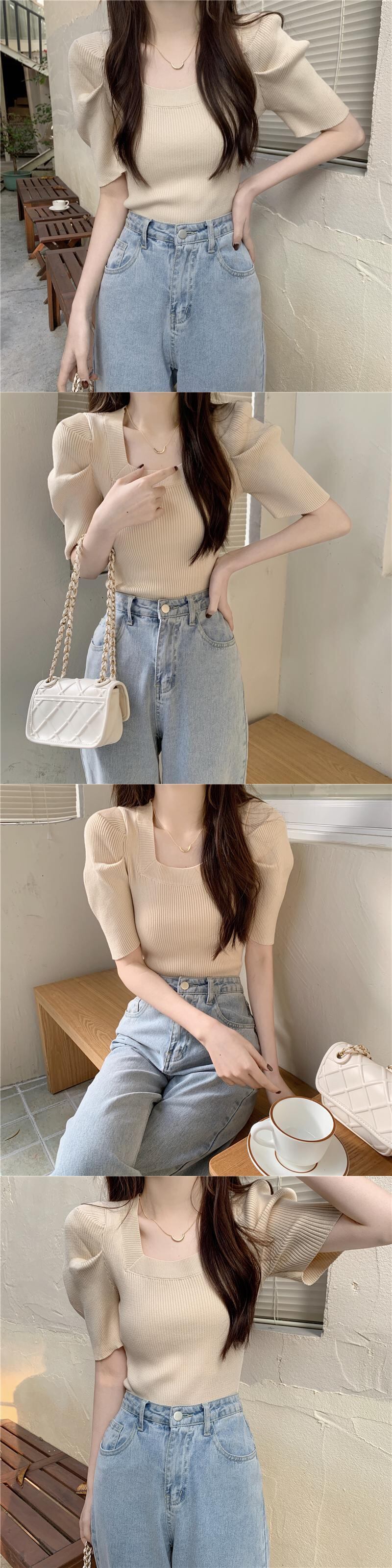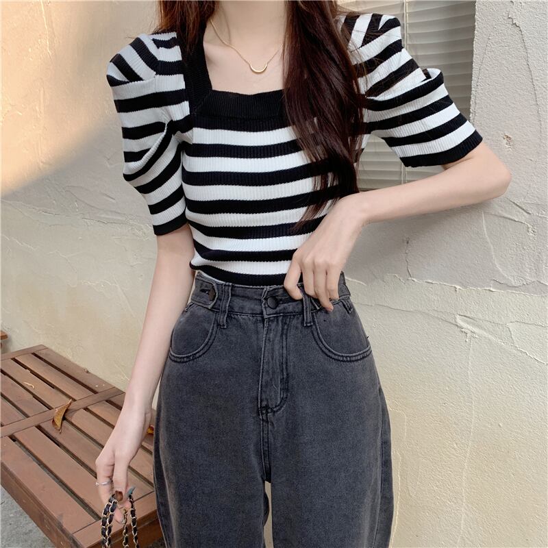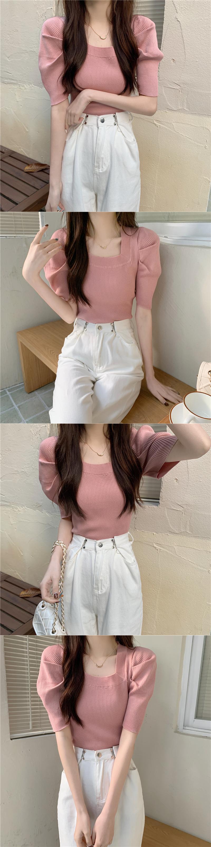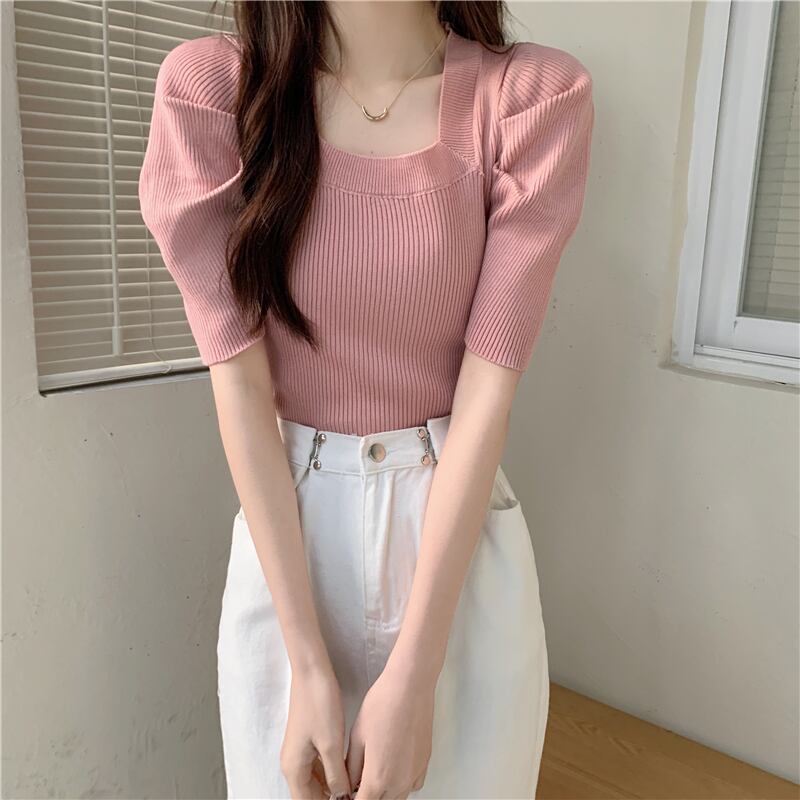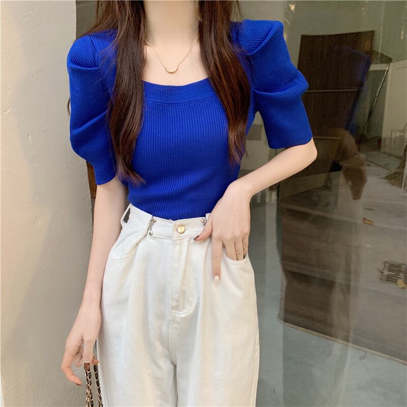 ニットウェア半袖Tシャツ女性の2022年の新しい夏の薄いパフスリーブは小さなフランスの正方形の襟のトップをデザインします サマー 夏物 スクウェア 7460035483334883 | framboise21