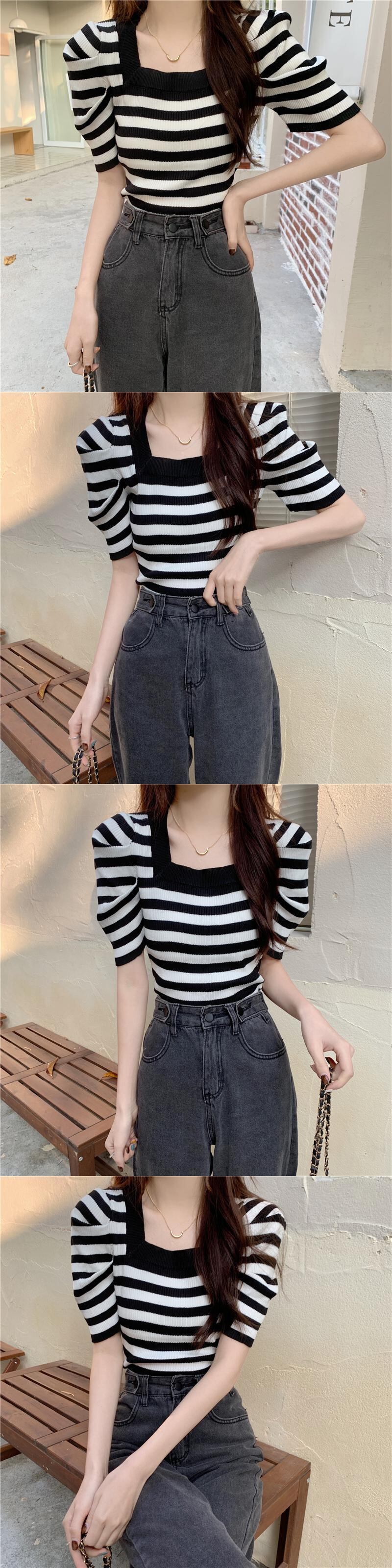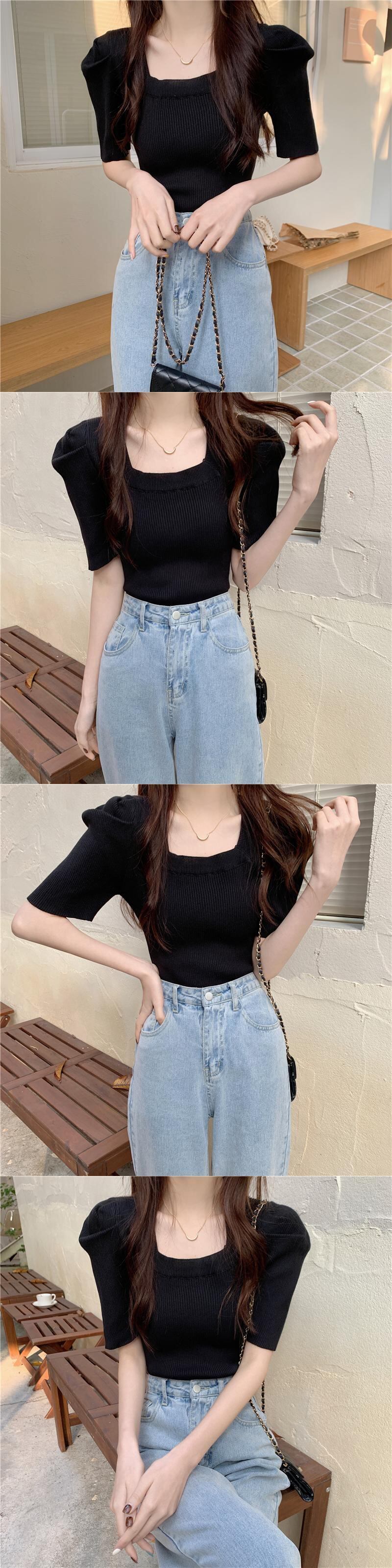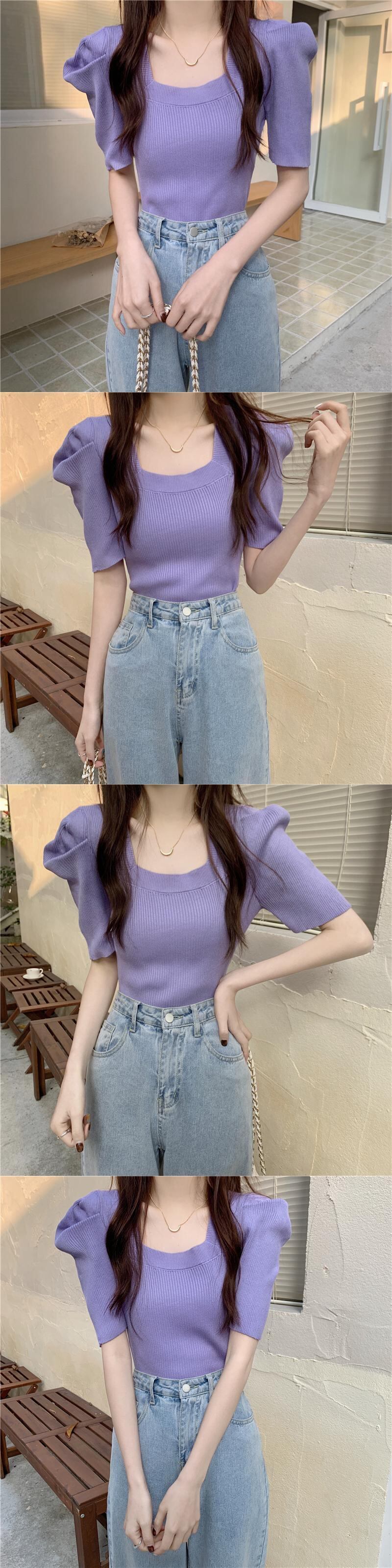ニットウェア半袖Tシャツ女性の2022年の新しい夏の薄いパフスリーブは小さなフランスの正方形の襟のトップをデザインします サマー 夏物 スクウェア 7460035483334883 | framboise21