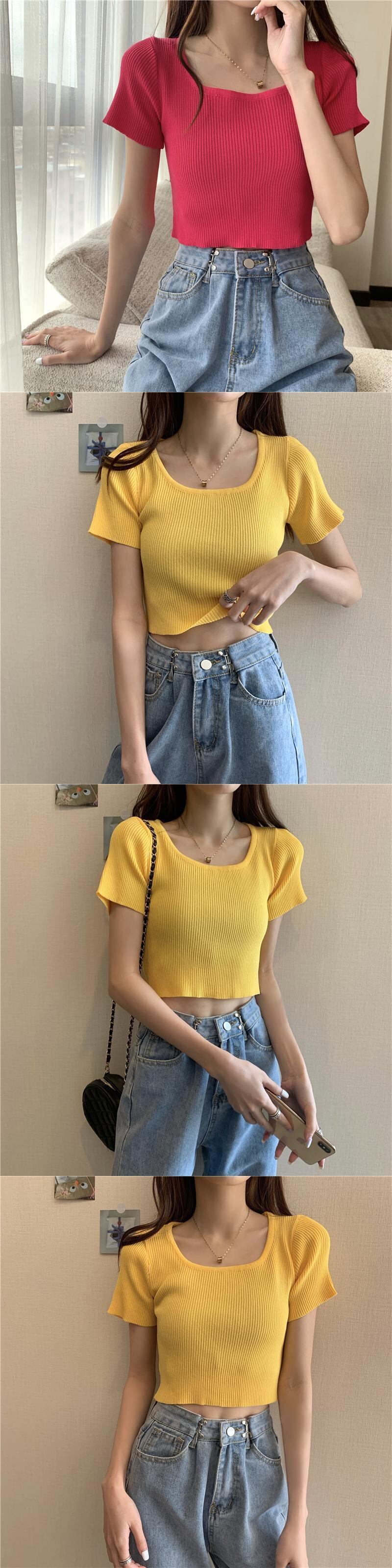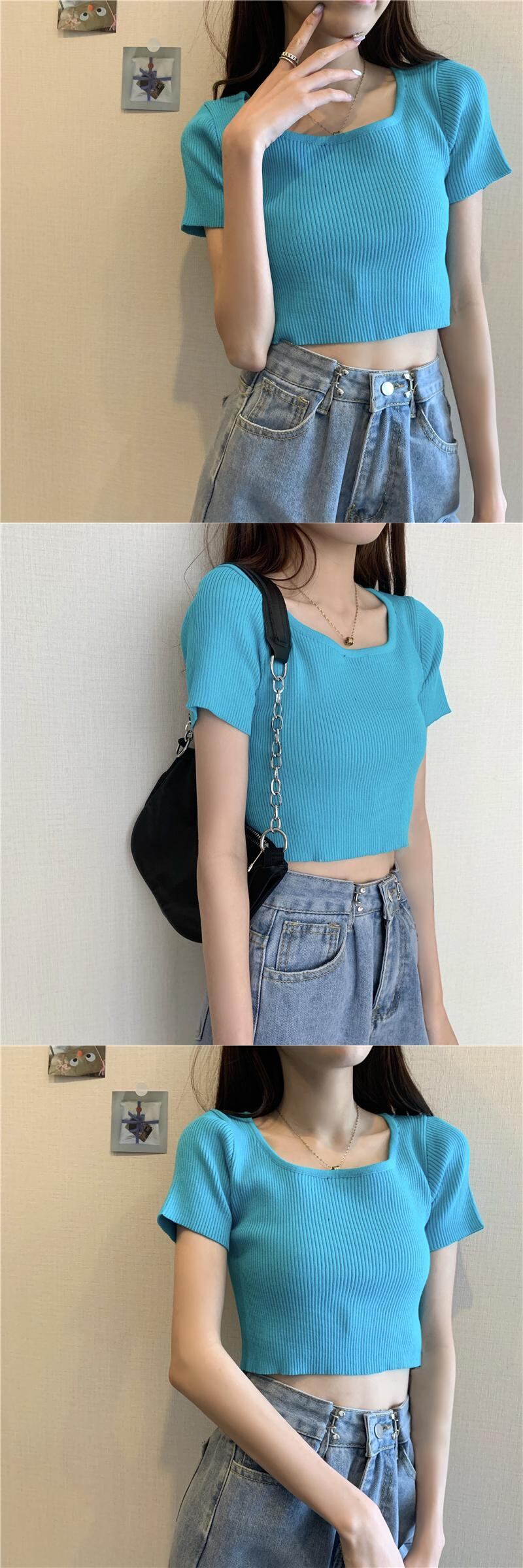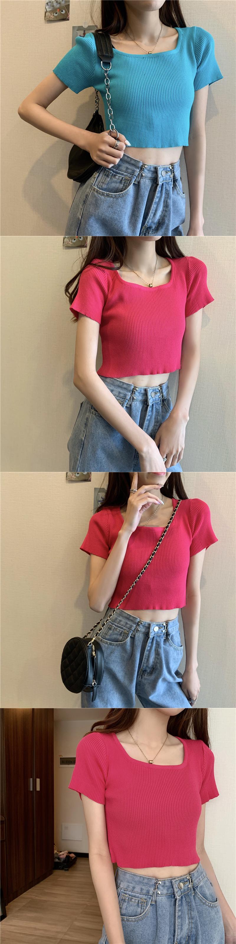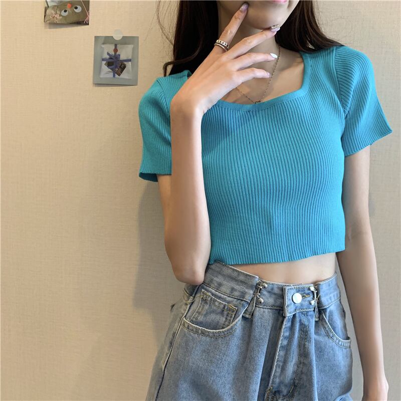 半袖のスクエアネックニットセーターの女性の夏のファッションのエインスタイルの小さな男は、内側と外側に短いへそ底のトップスを着ています ショート サマー 夏物 スクウェア 7460089765030599 | framboise21
