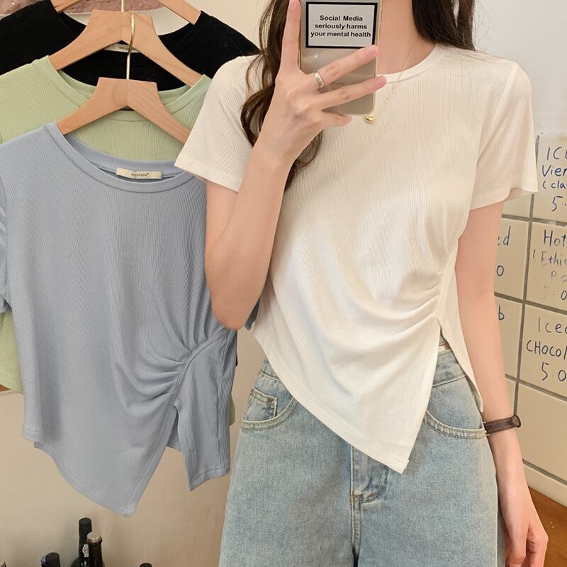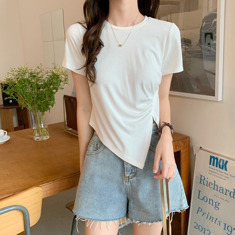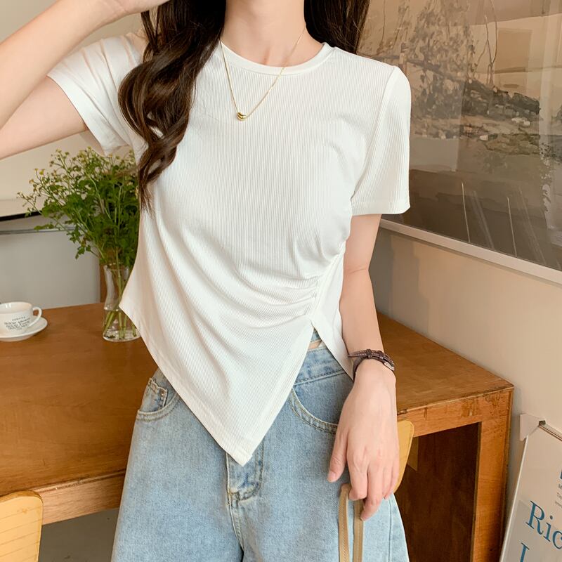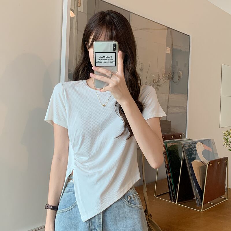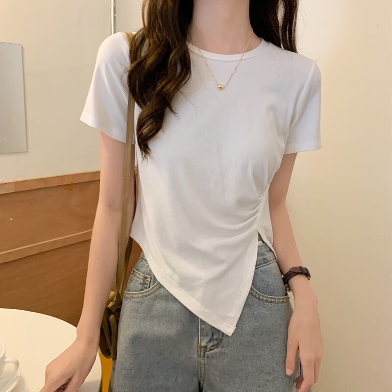 純綿の不規則な半袖Tシャツ女性の夏の薄いセクションのウエストと薄い白いスプリットトップTシャツの潮 ショート ホワイト コットン サマー 夏物 7460055663679569 | framboise21