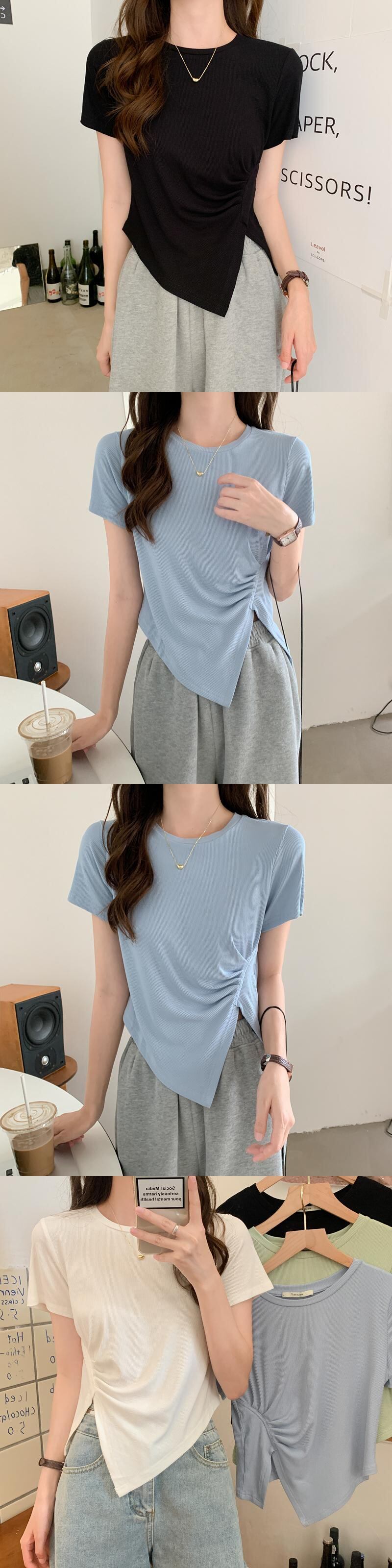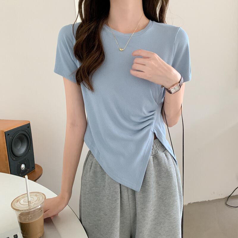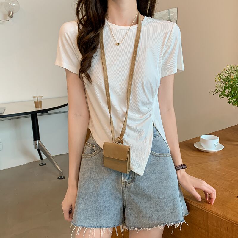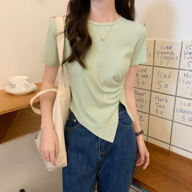 純綿の不規則な半袖Tシャツ女性の夏の薄いセクションのウエストと薄い白いスプリットトップTシャツの潮 ショート ホワイト コットン サマー 夏物 7460055663679569 | framboise21