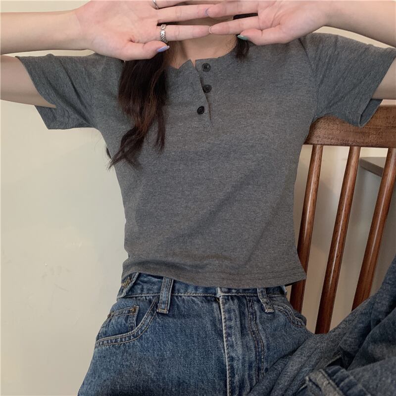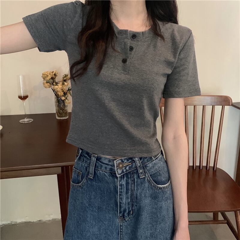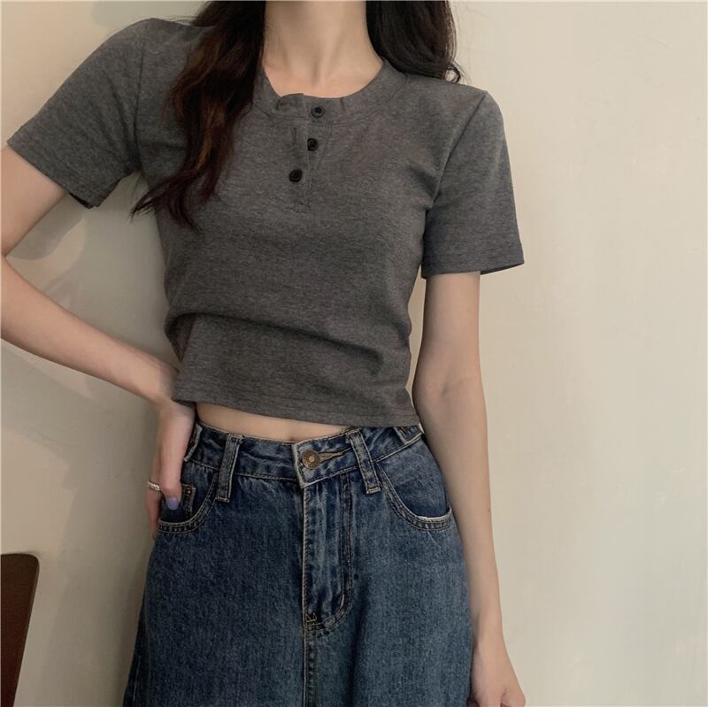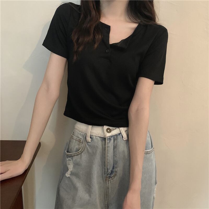 2022年新夏デザインセンスニッチボタン半袖TシャツレディースハイウエストショートボトミングシャツTシャツトップ ハイウェスト サマー 夏物 7460058424225070 | framboise21