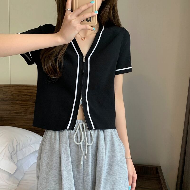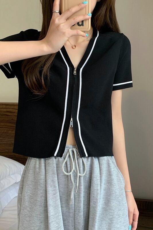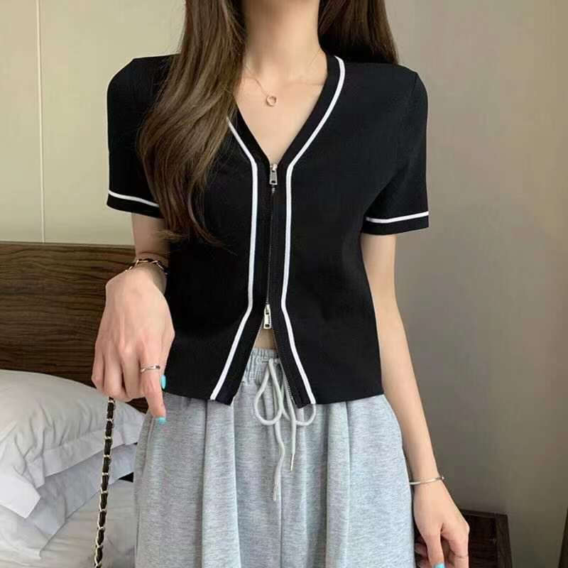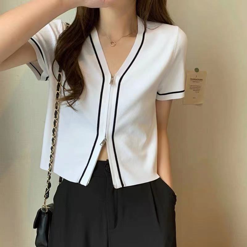 ジッパーbmショートトップハイウエストアイスシルクVネック半袖Tシャツレディースデザインセンスニッチサマーネーブルニットセーター ハイウェスト 夏物 7460056056125792 | framboise21