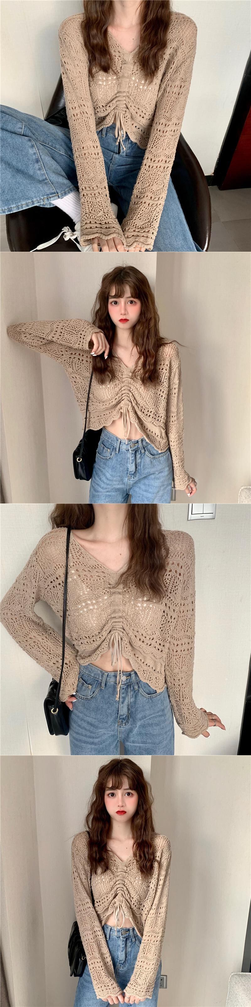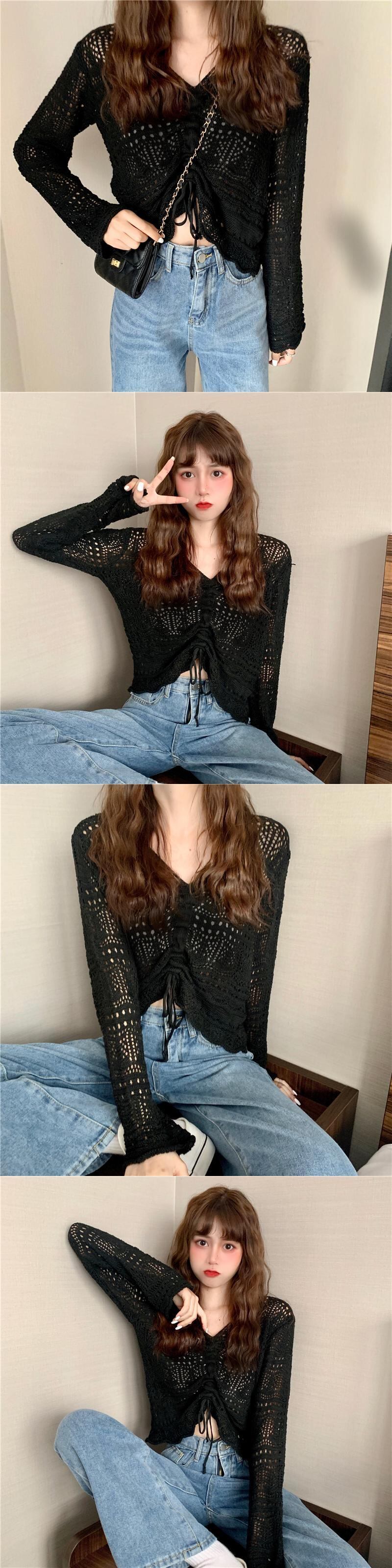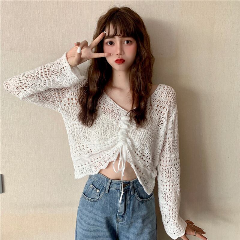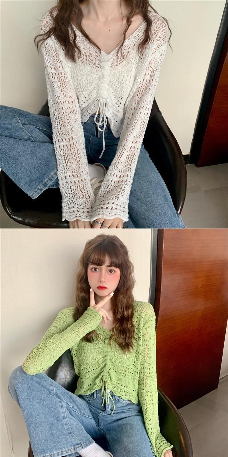 Vネックドローストリングデザイン感のあるニッチ中空ホワイトアイスシルクニットカーディガンレディースサマーショート長袖日焼け止めトップ ロング 夏物 7460095352250414 | framboise21