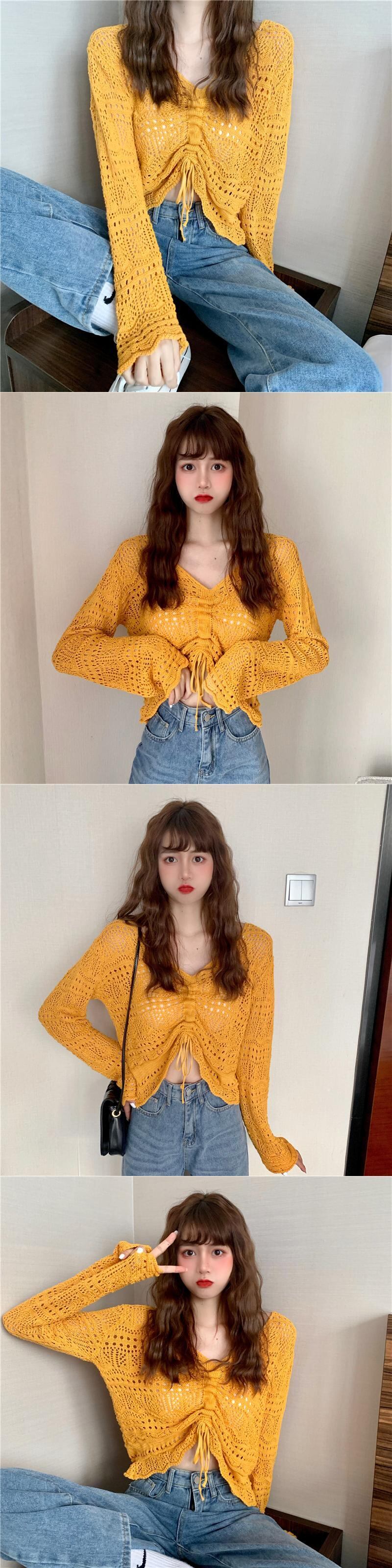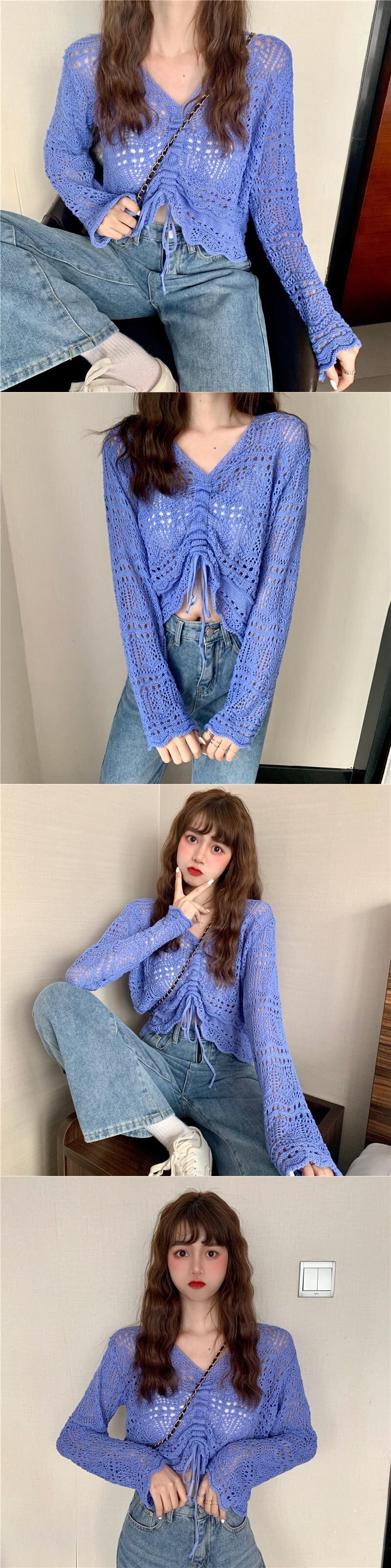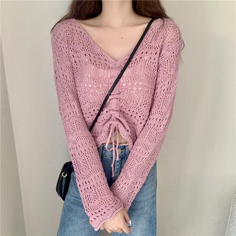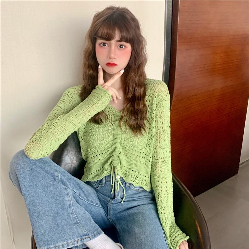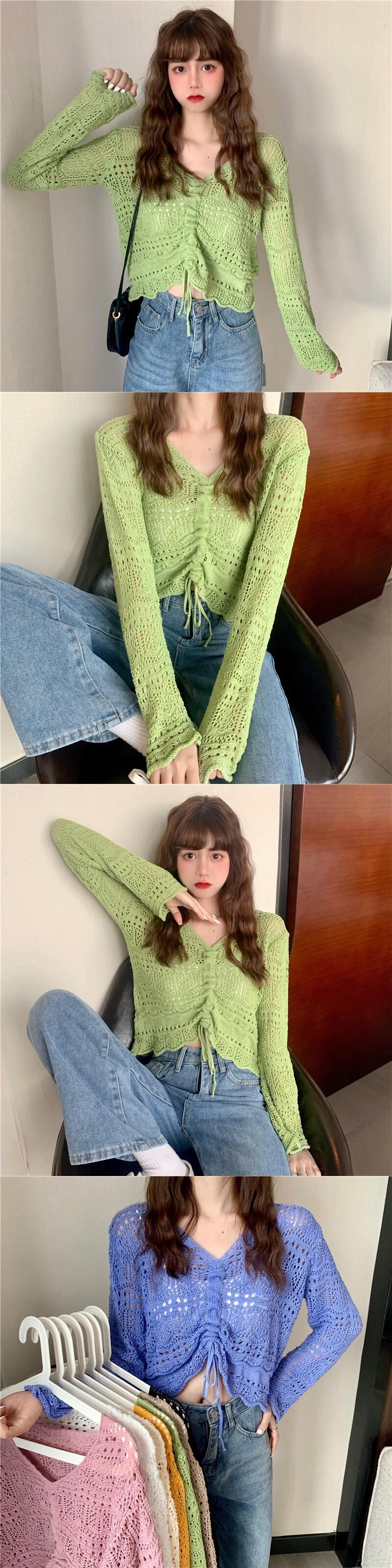Vネックドローストリングデザイン感のあるニッチ中空ホワイトアイスシルクニットカーディガンレディースサマーショート長袖日焼け止めトップ ロング 夏物 7460095352250414 | framboise21