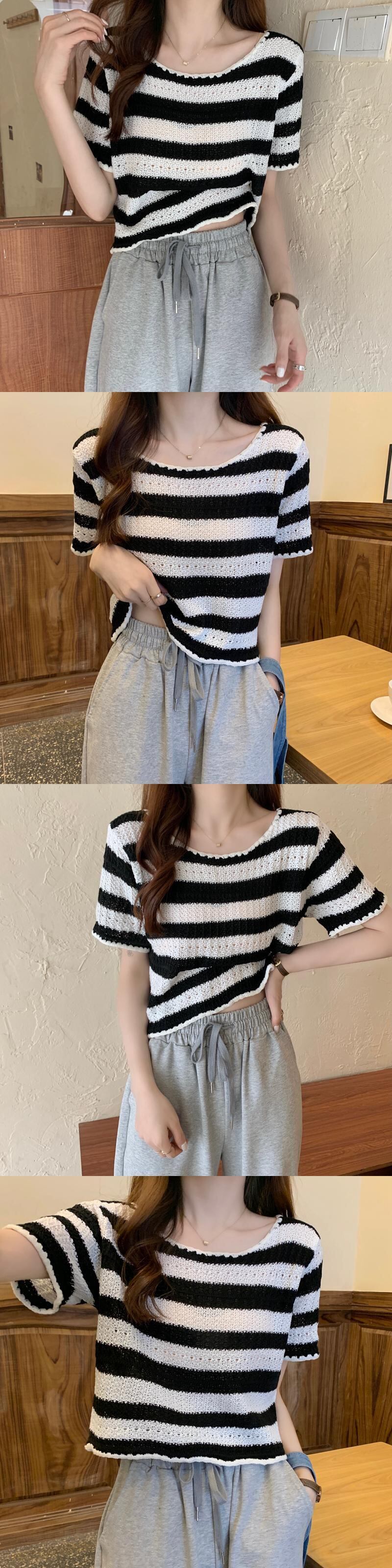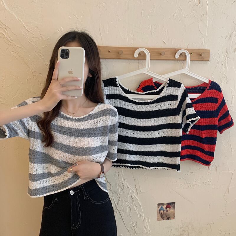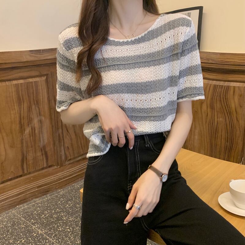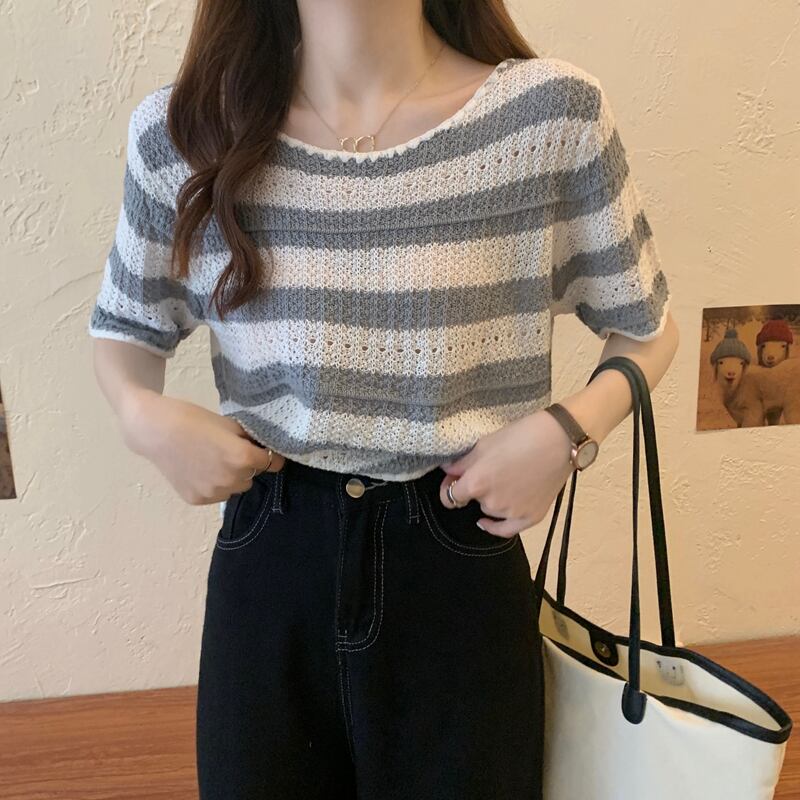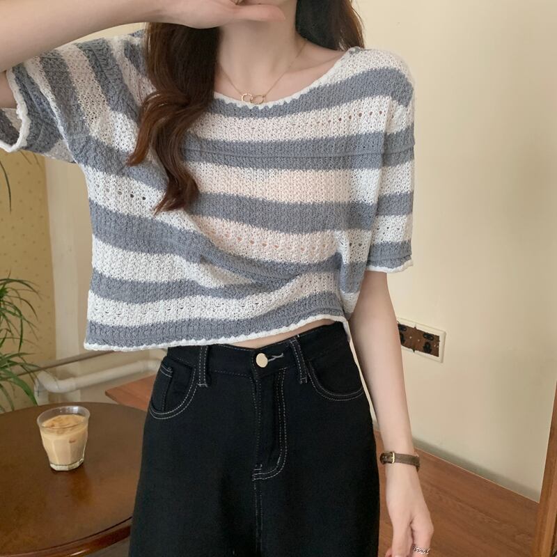 ストライプニット薄手の半袖Tシャツレディースインスティッド春夏新バージョンラウンドネックショートトップハイウエストパンツ ハイウェスト スプリング 春物 サマー 夏物 Oネック 7460014763675217 | framboise21
