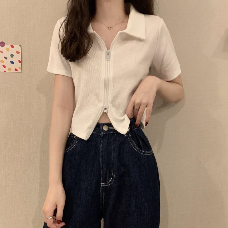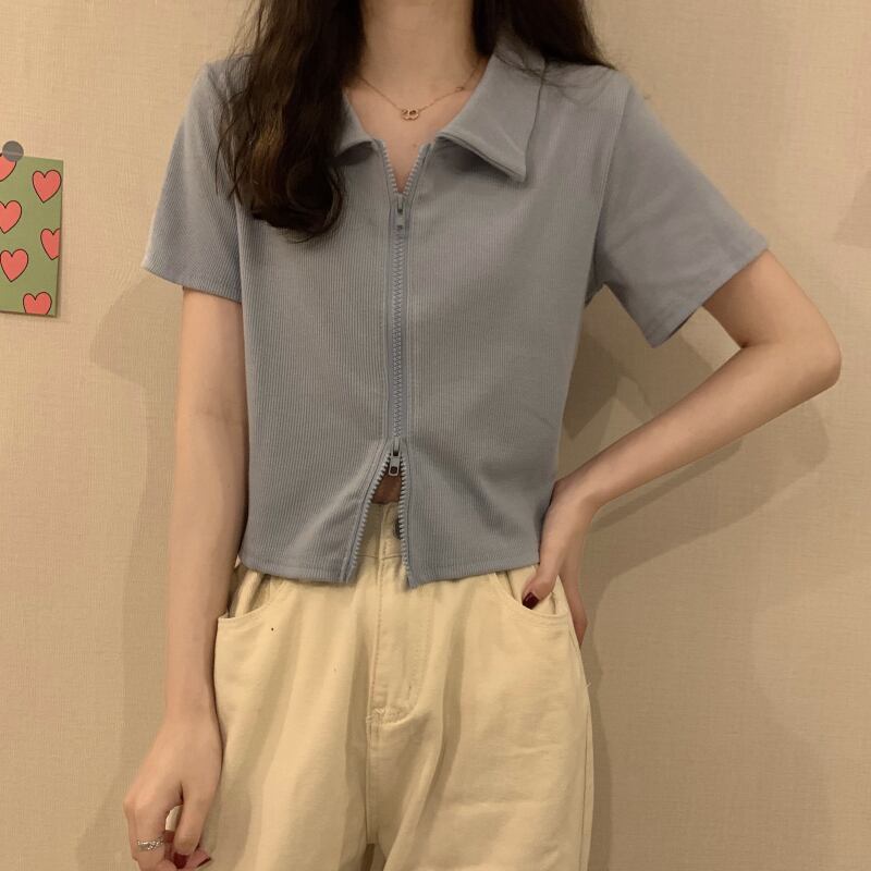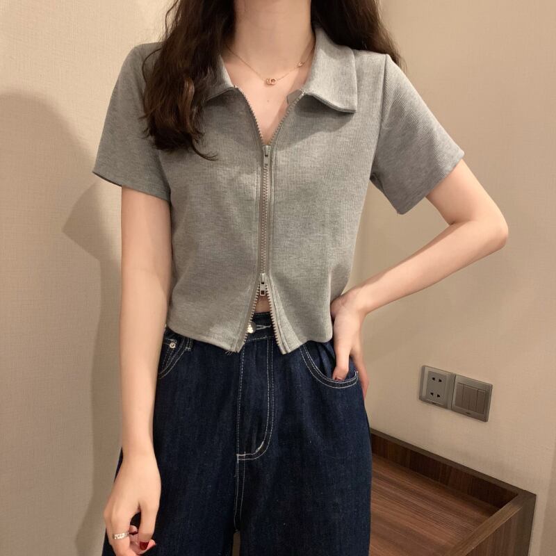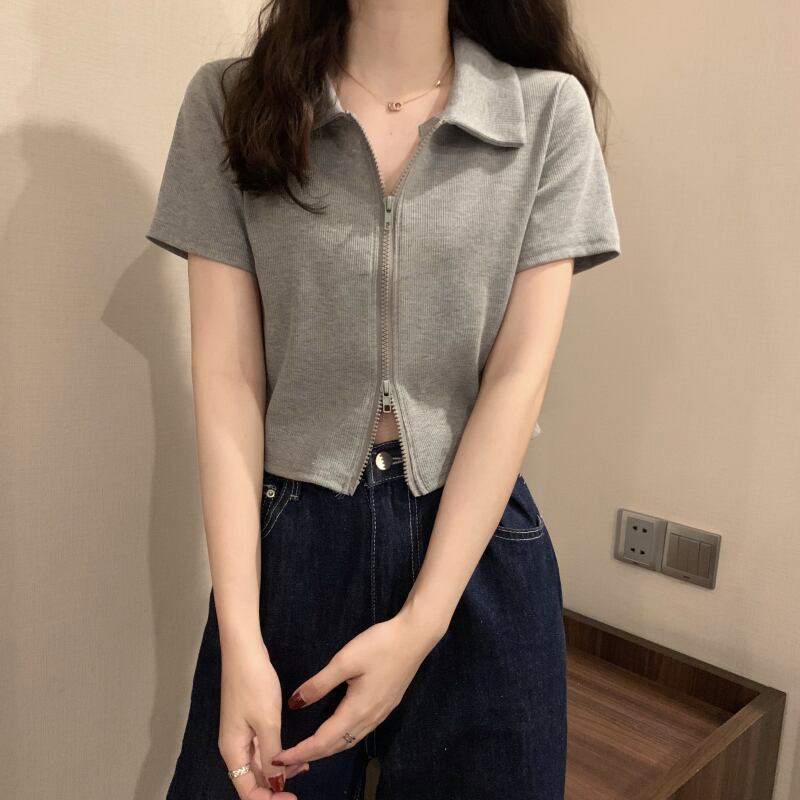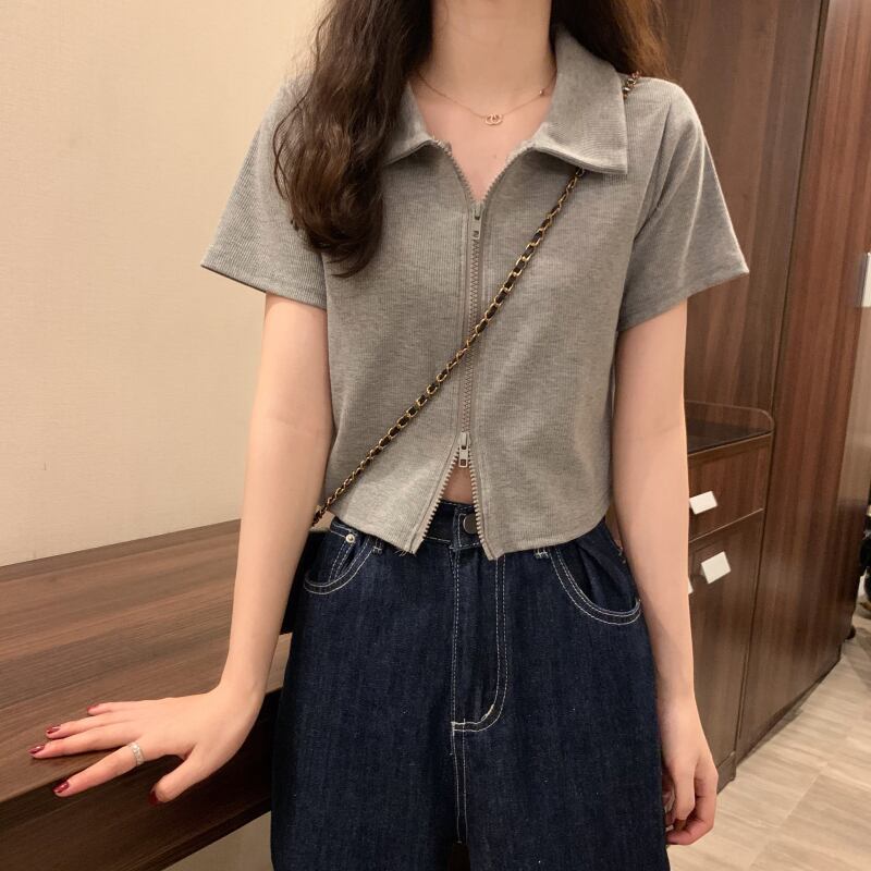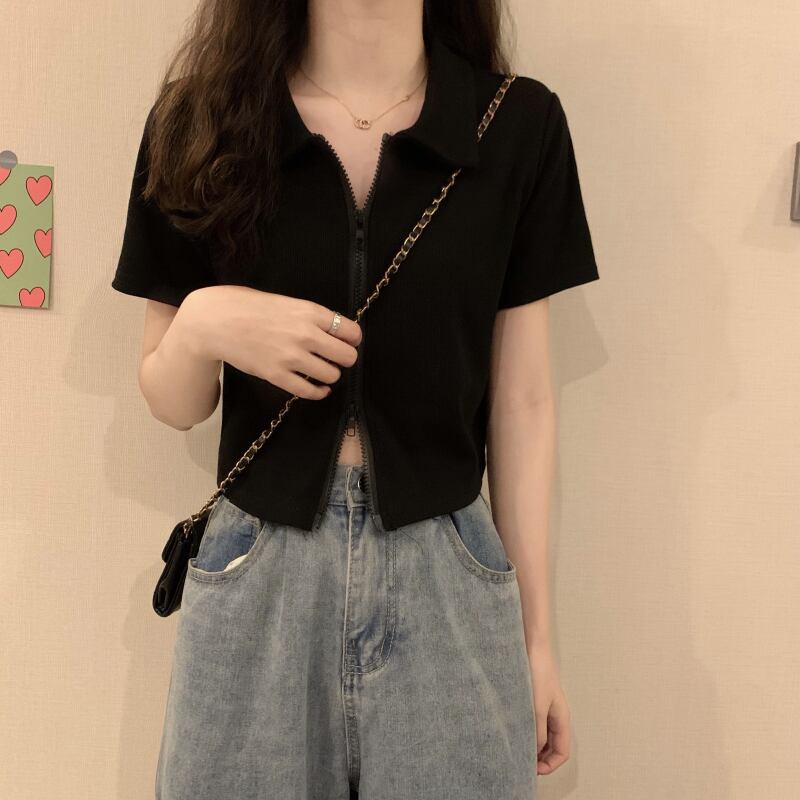ショートトップダブルジッパーアイスシルクニットカーディガンハイウエストシンバージョンルーズポロカラー半袖Tシャツレディースサマー ハイウェスト ハーフスリーブ 夏物 746001287846963 | framboise21