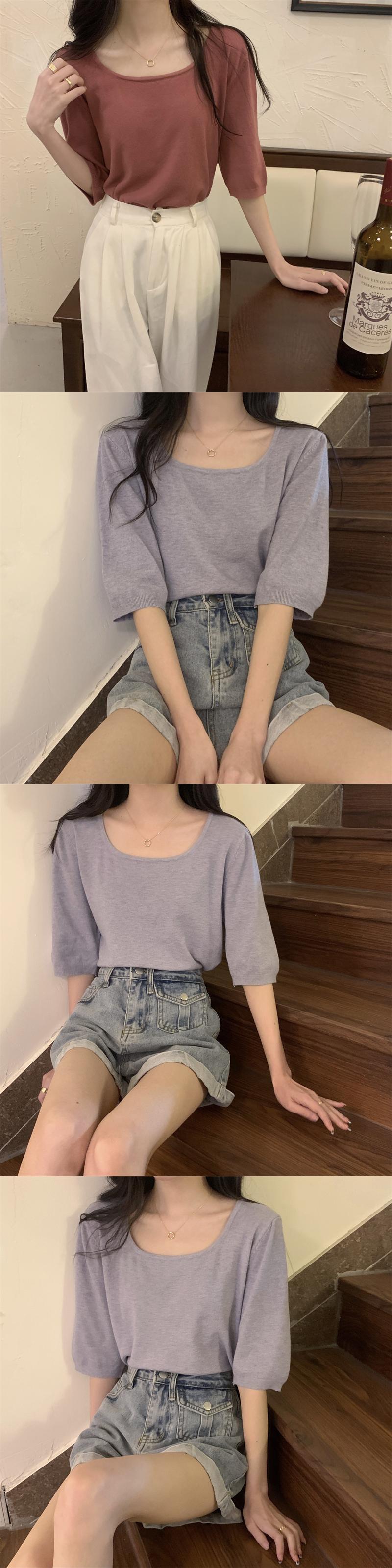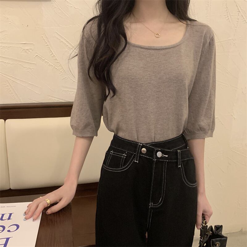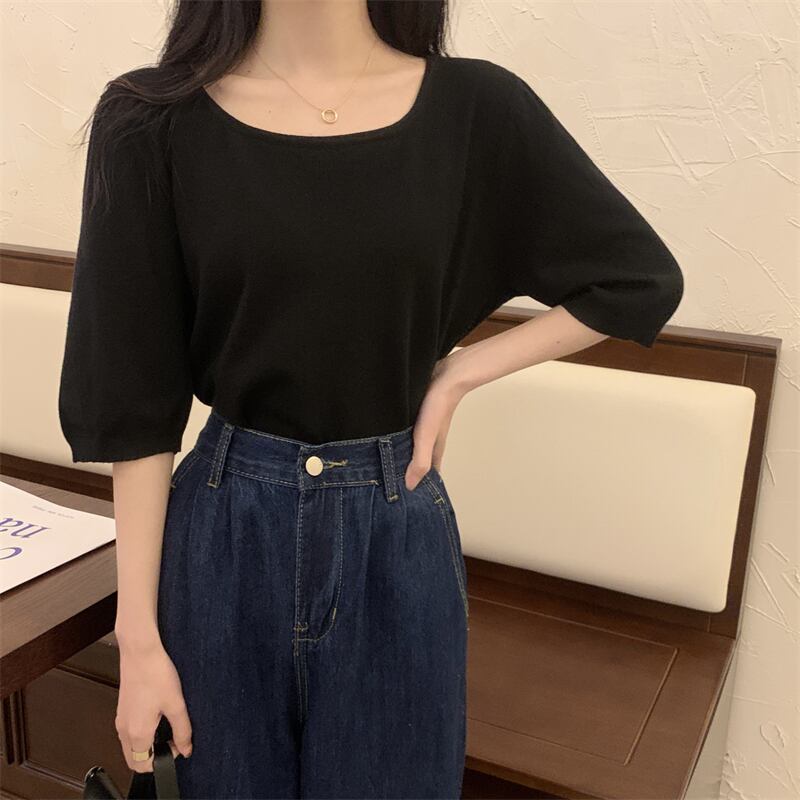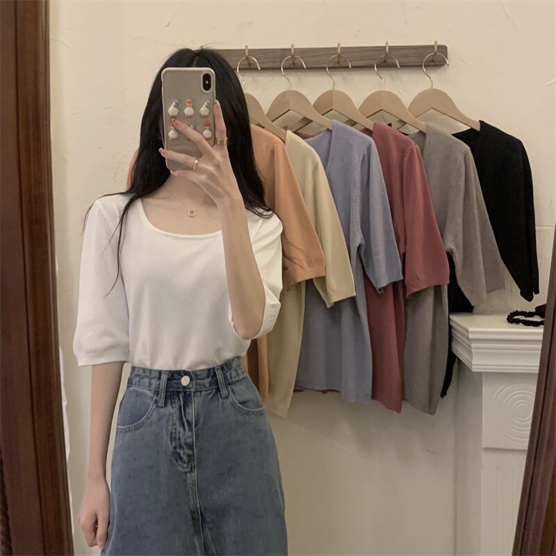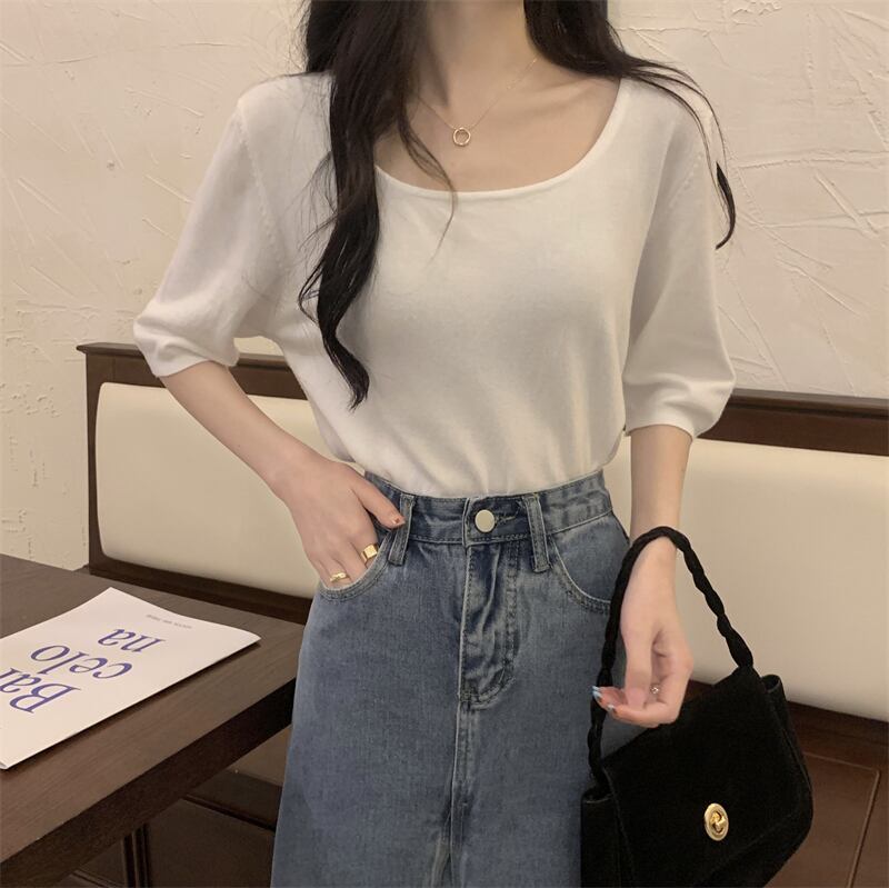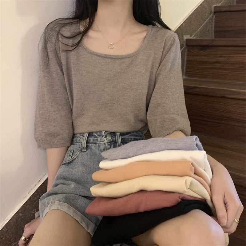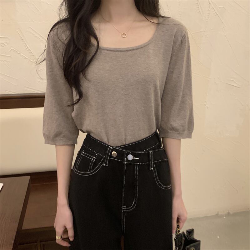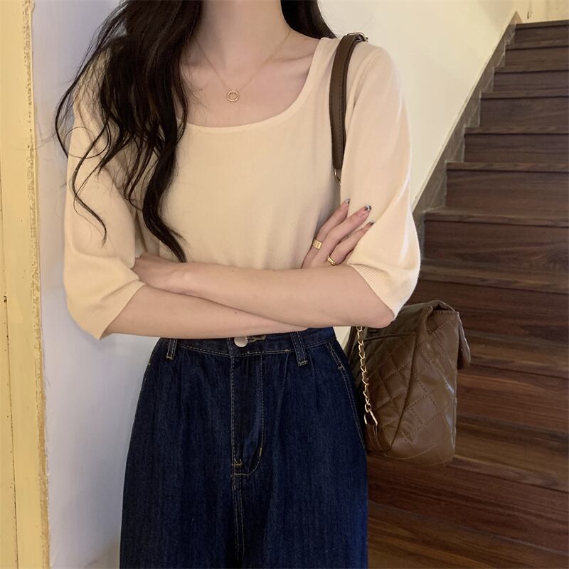 スクエアネックアイスシルクニットフロントショルダー半袖Tシャツ女性の2022年夏ルーズで薄いミッドスリーブトップ、ワイドレッグパンツ サマー 夏物 スクウェア 746001007075612 | framboise21