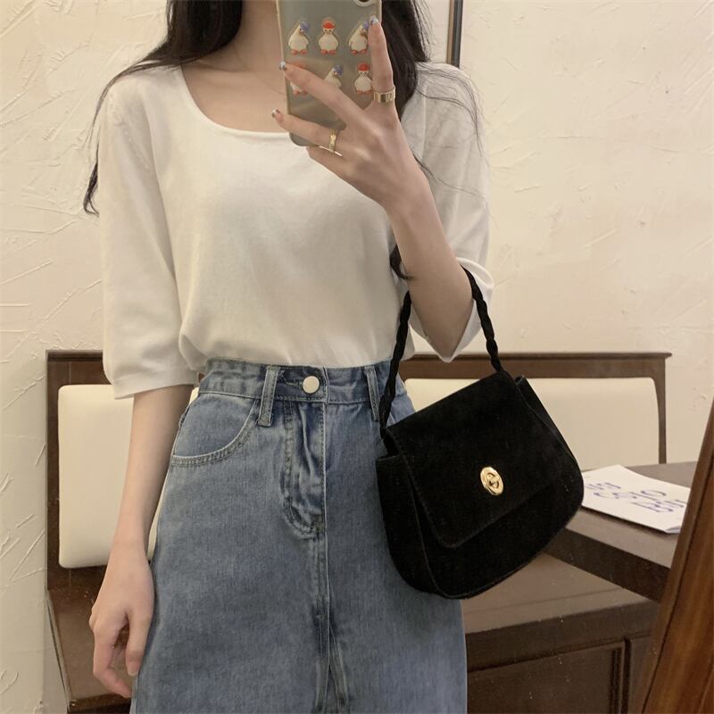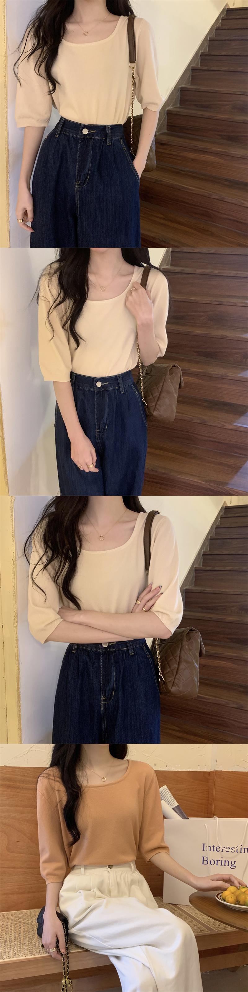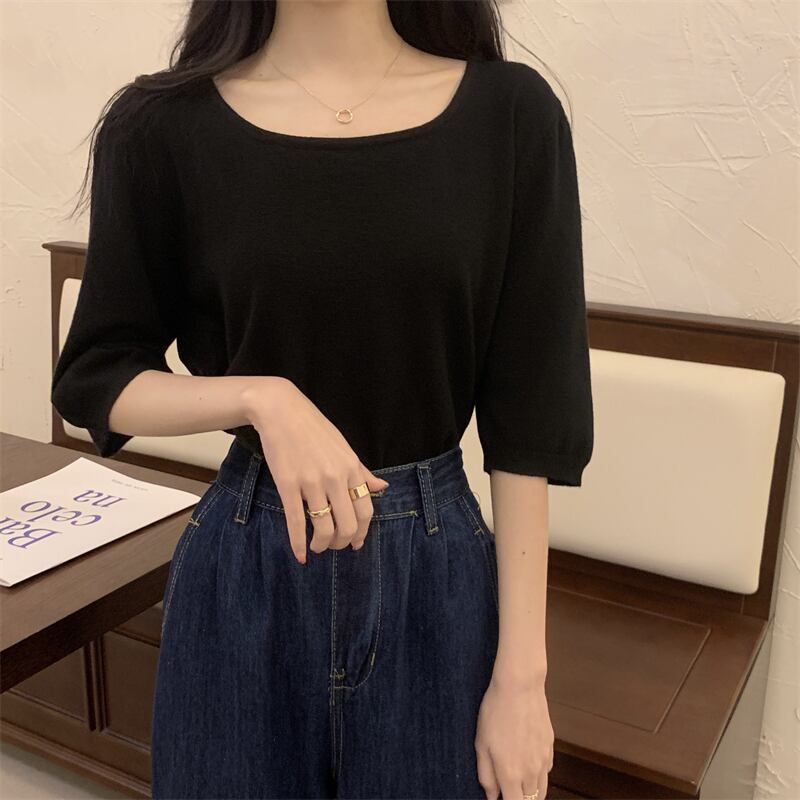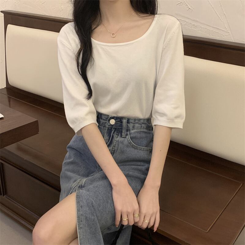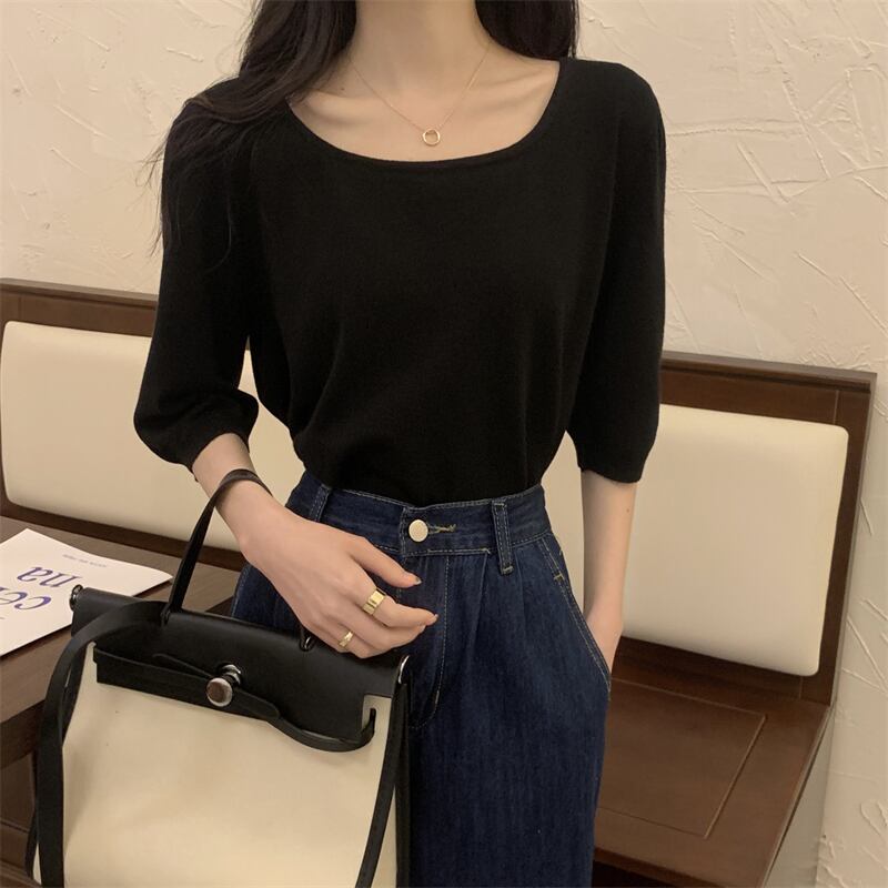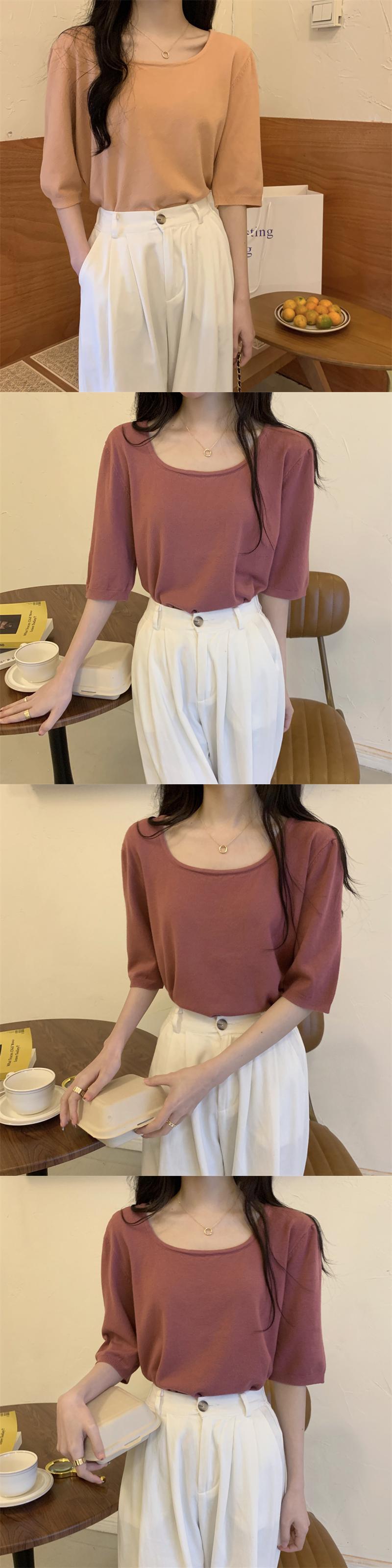 スクエアネックアイスシルクニットフロントショルダー半袖Tシャツ女性の2022年夏ルーズで薄いミッドスリーブトップ、ワイドレッグパンツ サマー 夏物 スクウェア 746001007075612 | framboise21