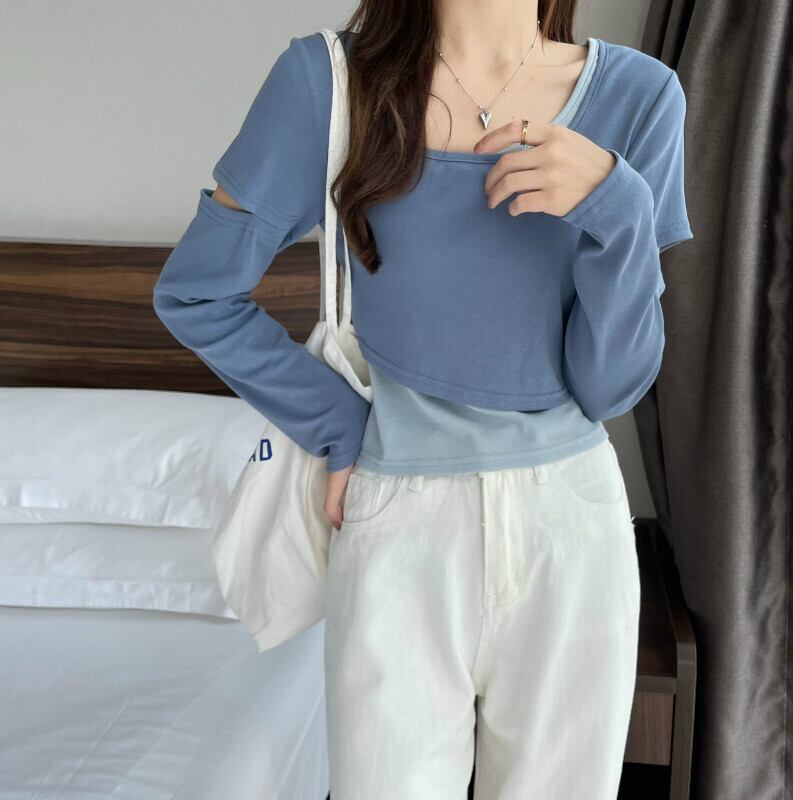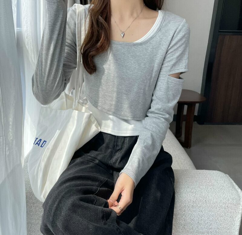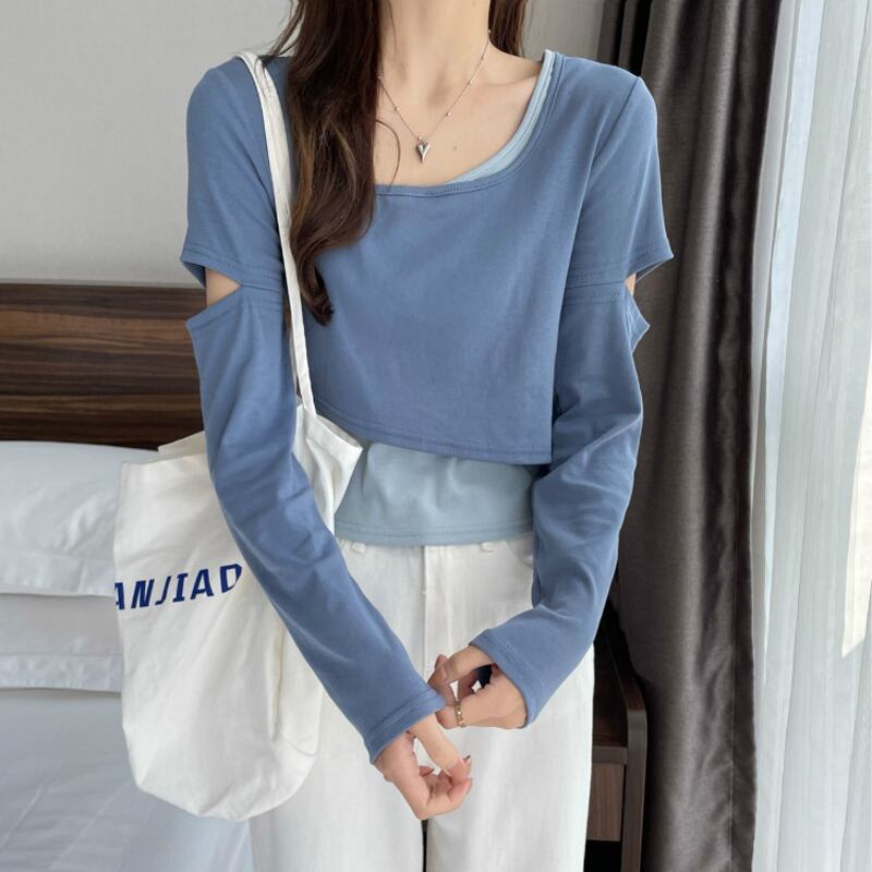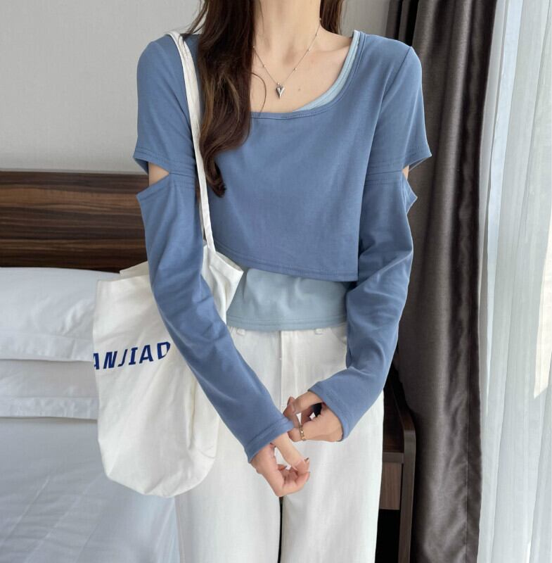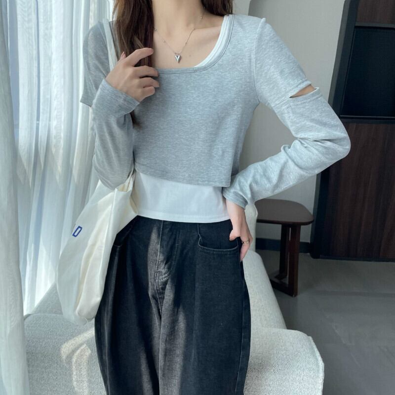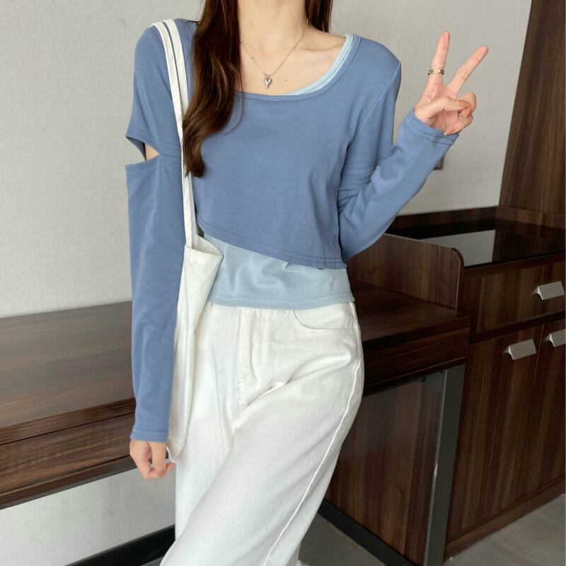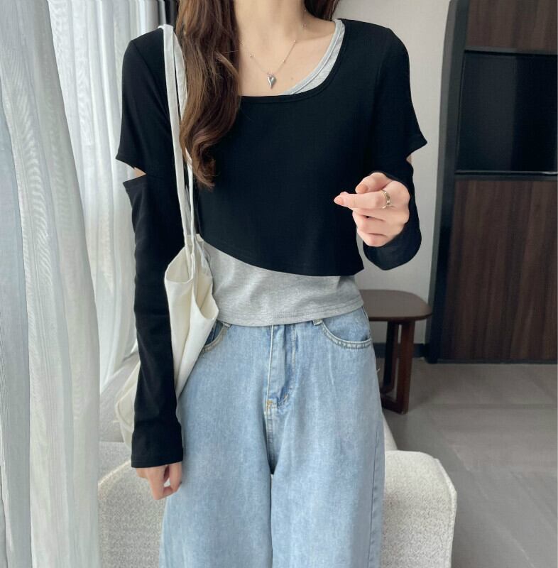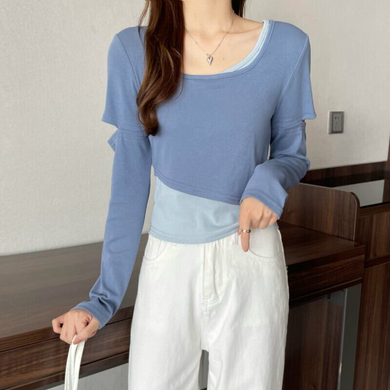 インターネットセレブのデザインセンスのショートフェイクツーピースTシャツ女性の早春バージョンは、ラウンドネックの長袖トップトレンディなインの内側と外側に着用することができます ロング スプリング 春物 Oネック 7460038719243425 | framboise21