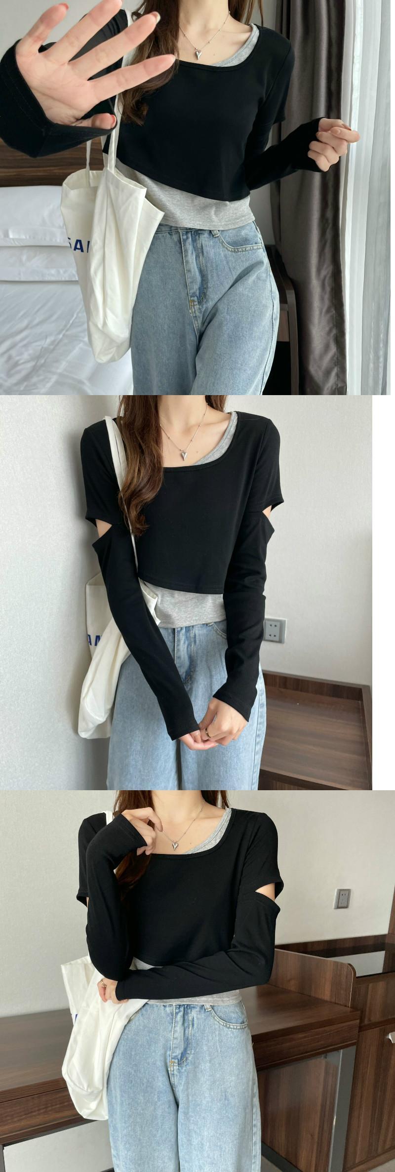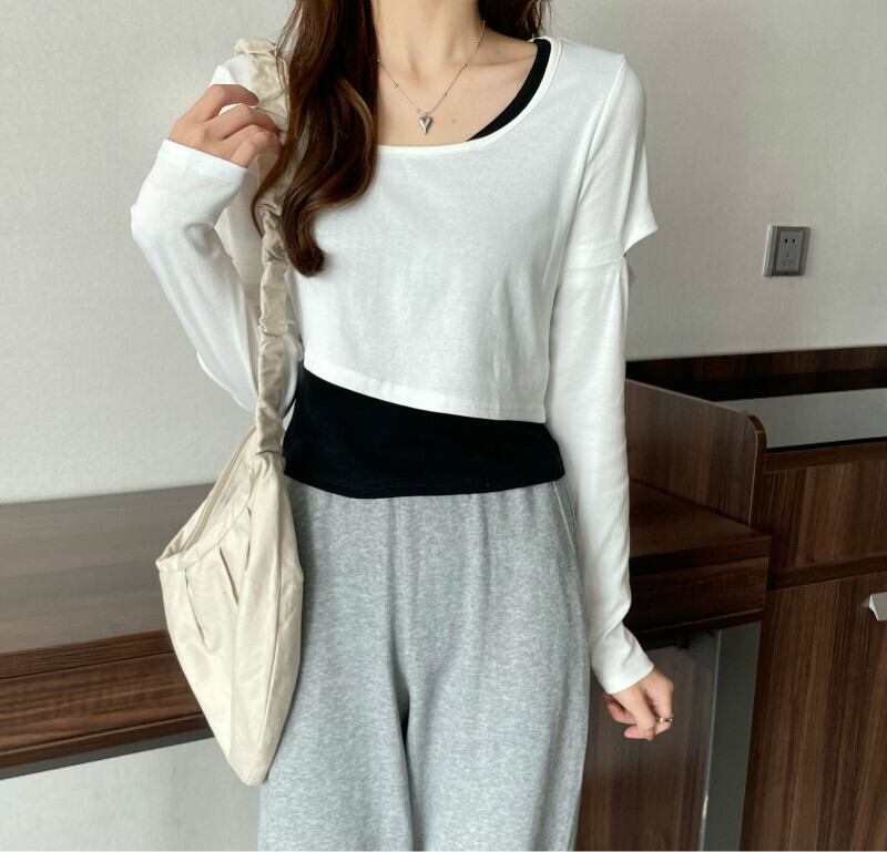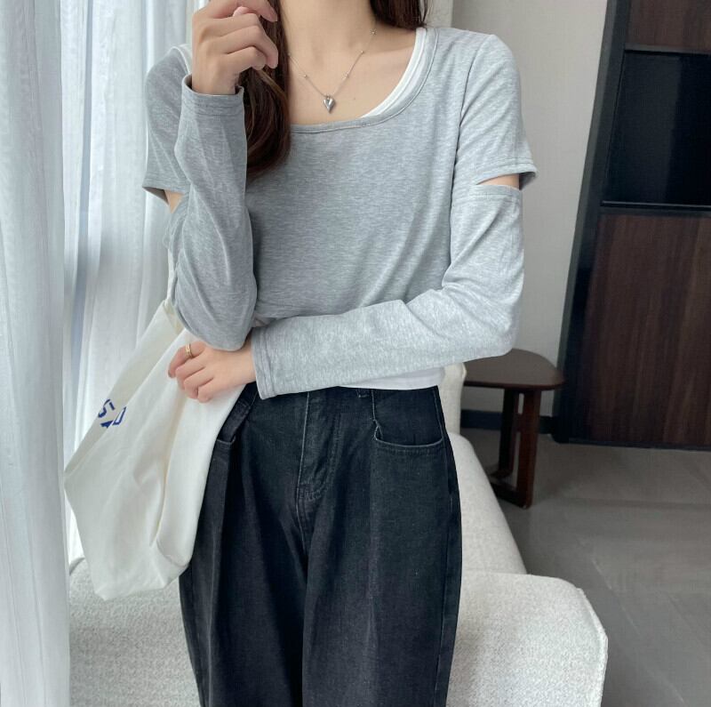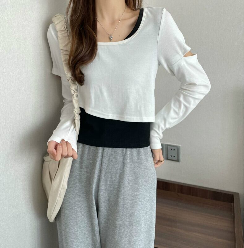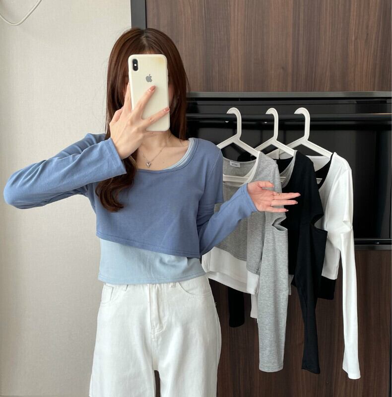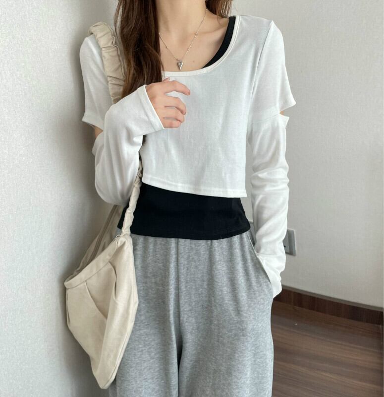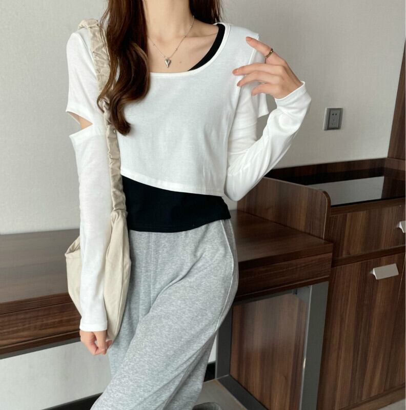 インターネットセレブのデザインセンスのショートフェイクツーピースTシャツ女性の早春バージョンは、ラウンドネックの長袖トップトレンディなインの内側と外側に着用することができます ロング スプリング 春物 Oネック 7460038719243425 | framboise21