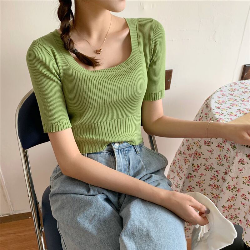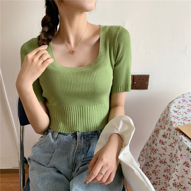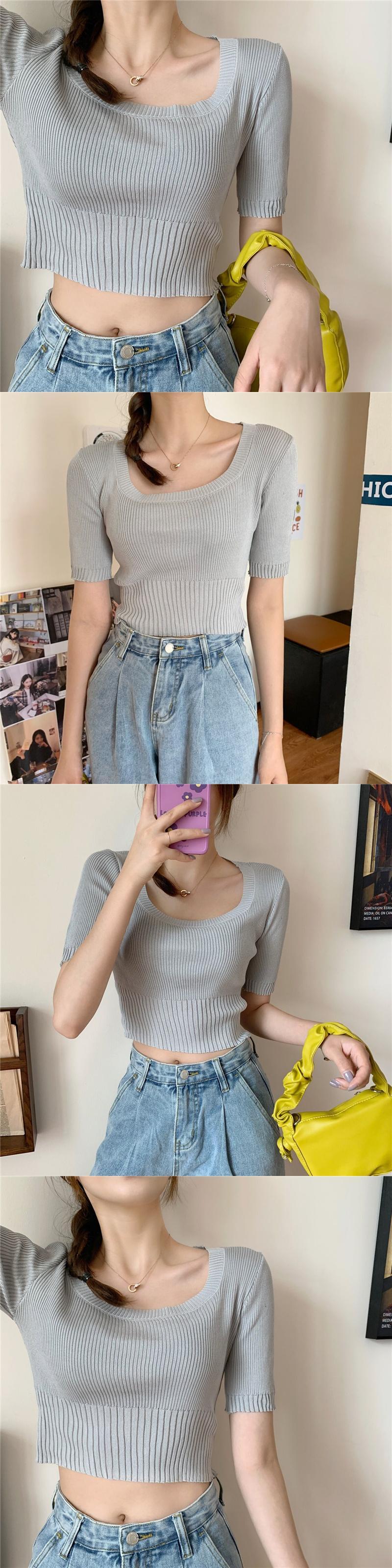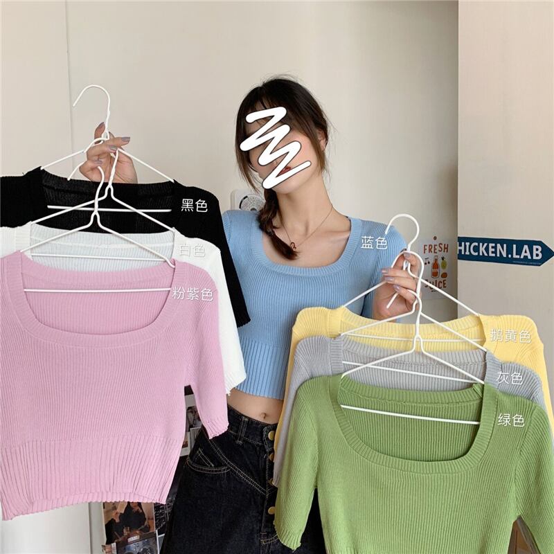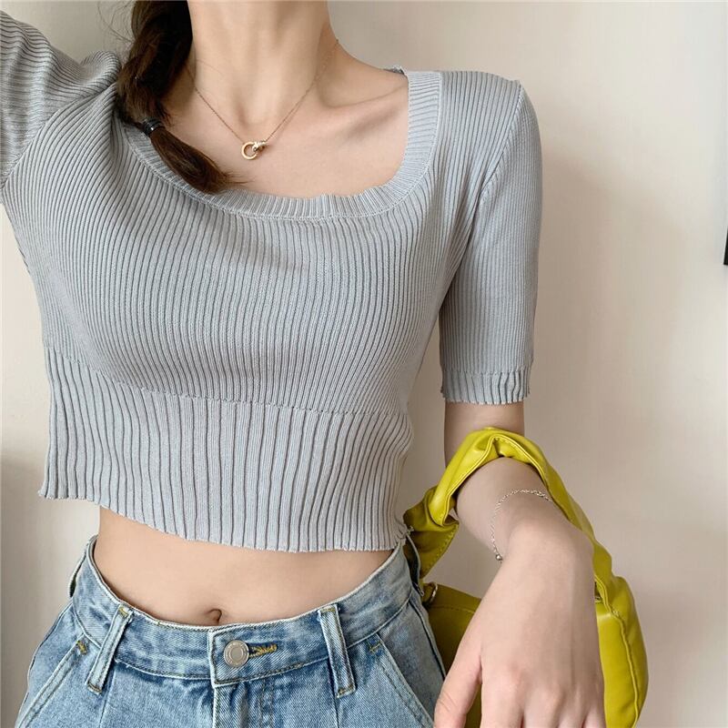 レトロな半袖Tシャツ女性の2022年夏の新しいセクシーなショートニットグレーパフスリーブスクエアカラー上半袖 ハーフスリーブ サマー 夏物 スクウェア 7460040116298994 | framboise21