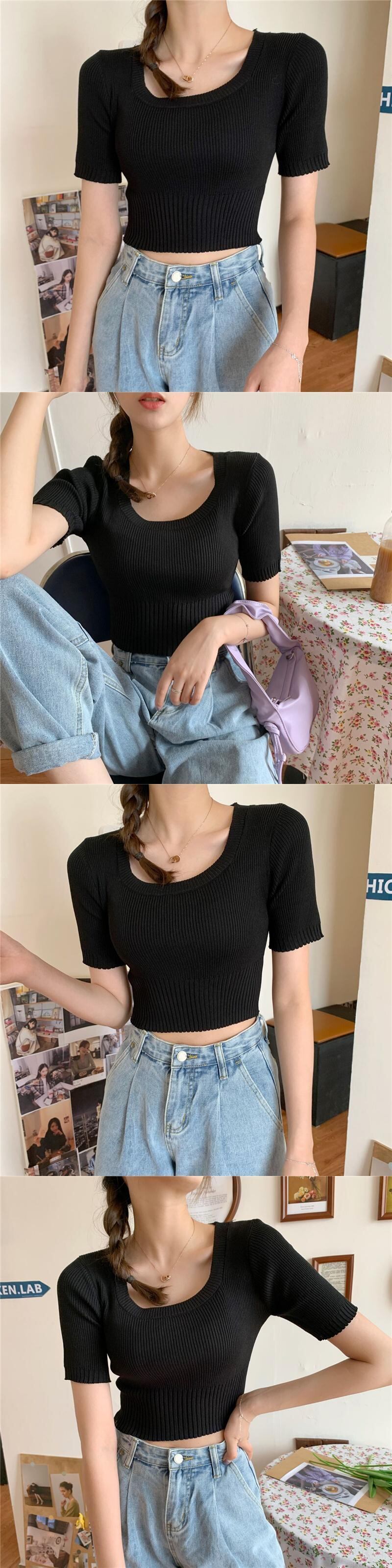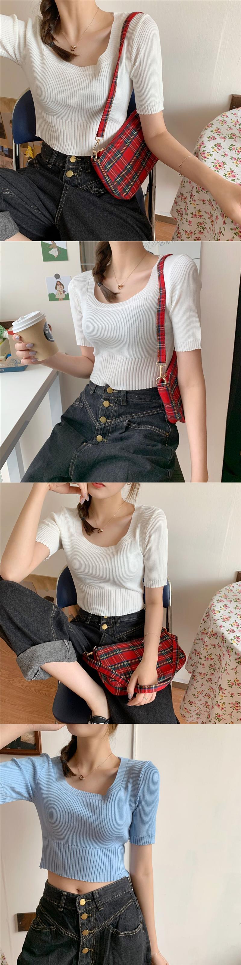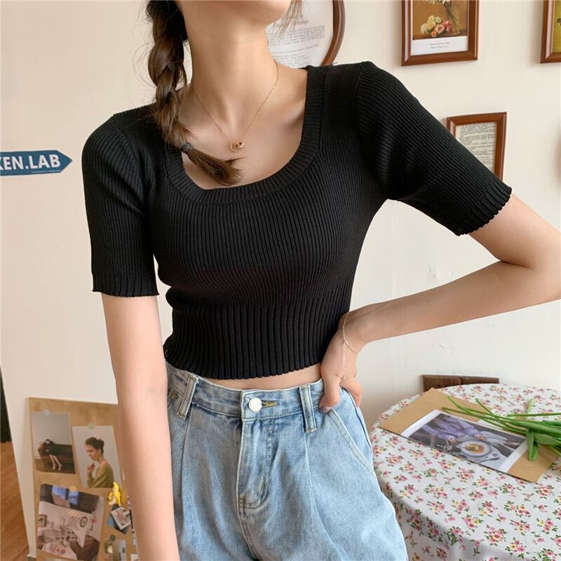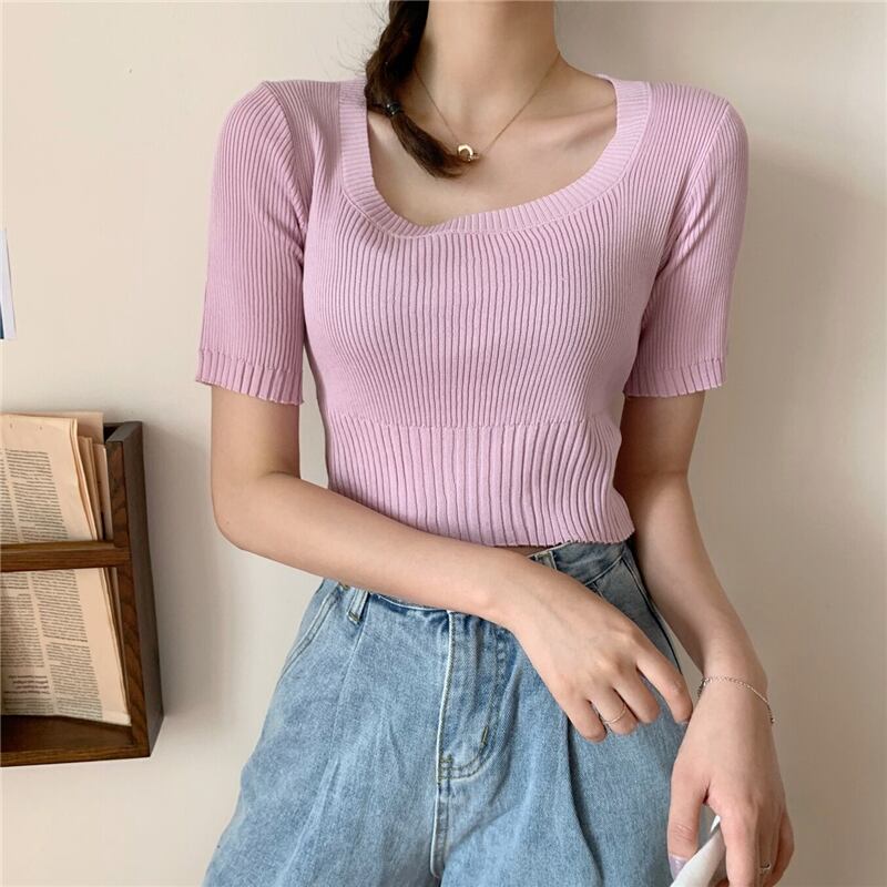 レトロな半袖Tシャツ女性の2022年夏の新しいセクシーなショートニットグレーパフスリーブスクエアカラー上半袖 ハーフスリーブ サマー 夏物 スクウェア 7460040116298994 | framboise21