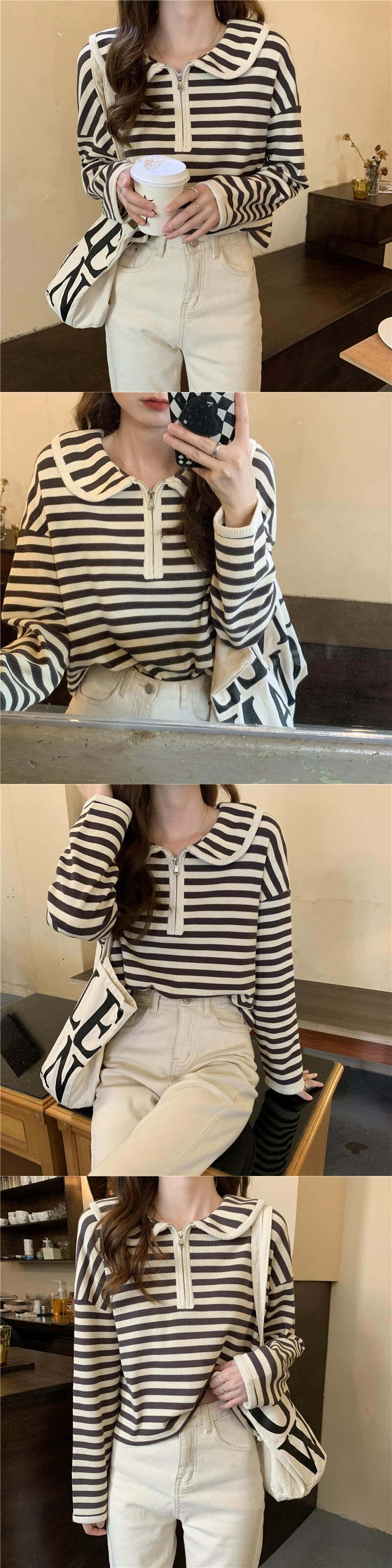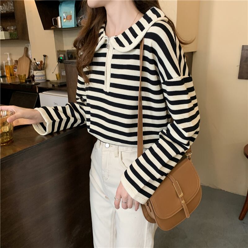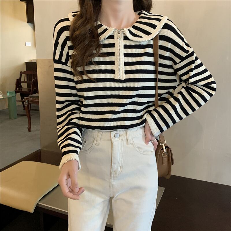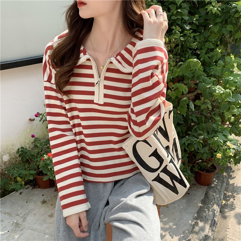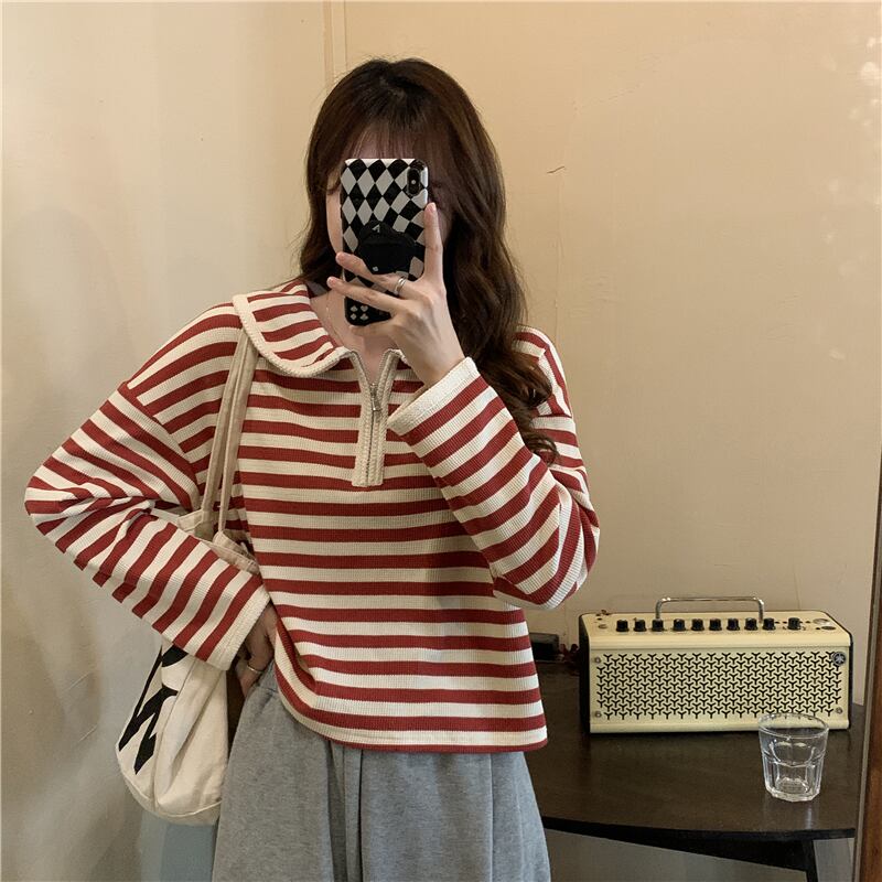 ドールカラーデザインニッチハーフジッパーストライプセーターレディース早春・秋薄切片小短切片ルーズトップ ショート スプリング 春物 オータム 秋物 7460018796953385 | framboise21