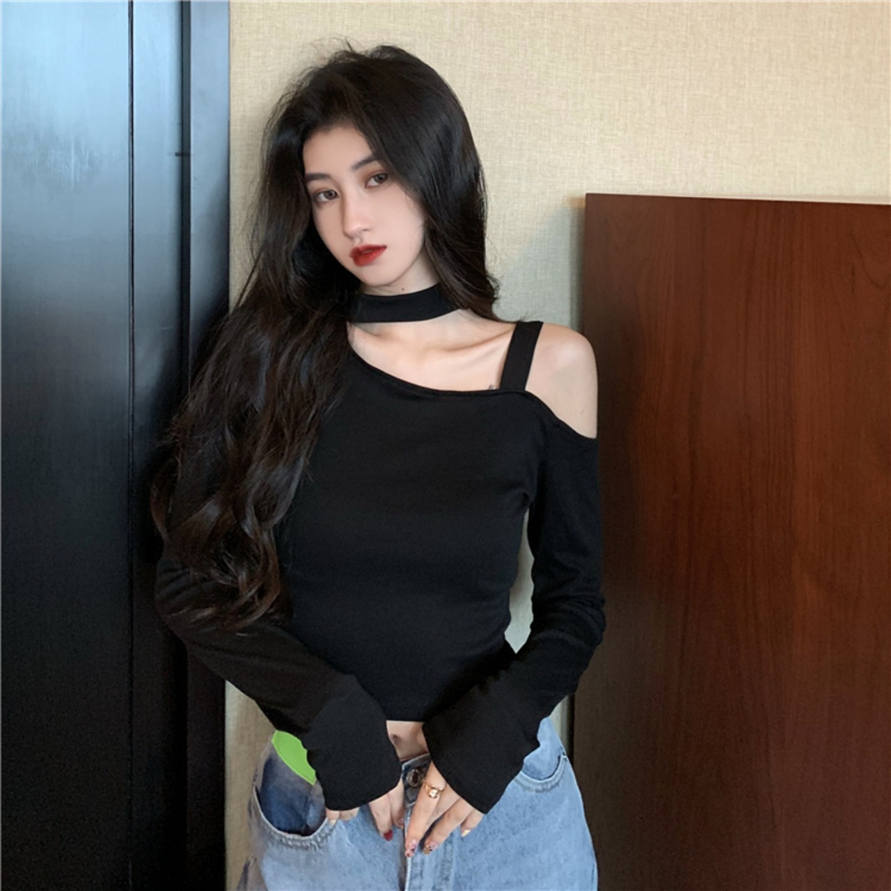 純粋な欲望の陰謀不規則なオフショルダーホルターセクシーなトップシックな長袖Tシャツボトミングシャツジャンピングドレス ロング 7460048120646113