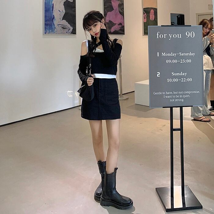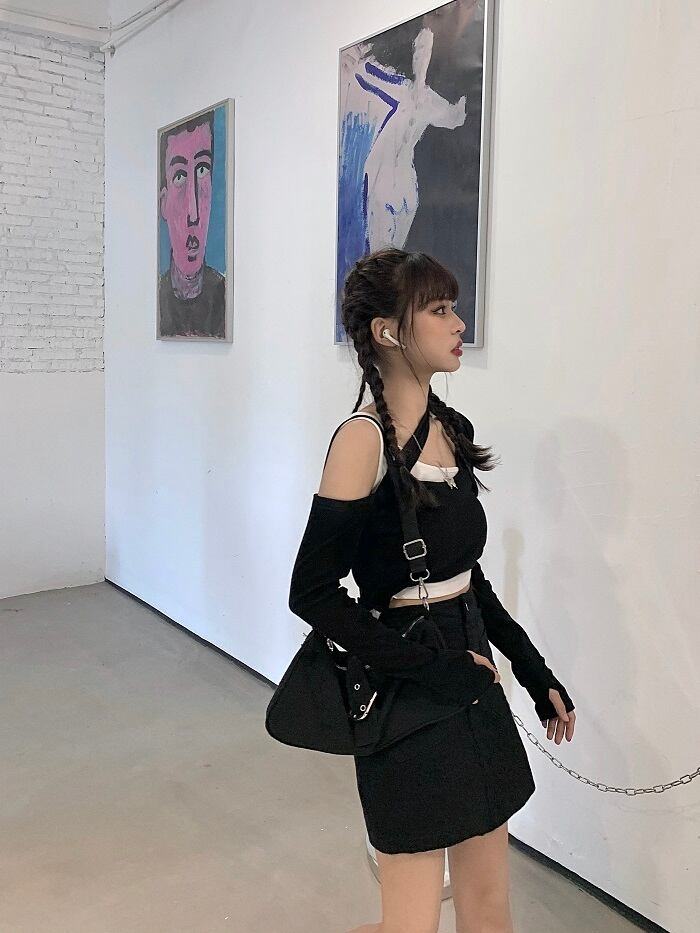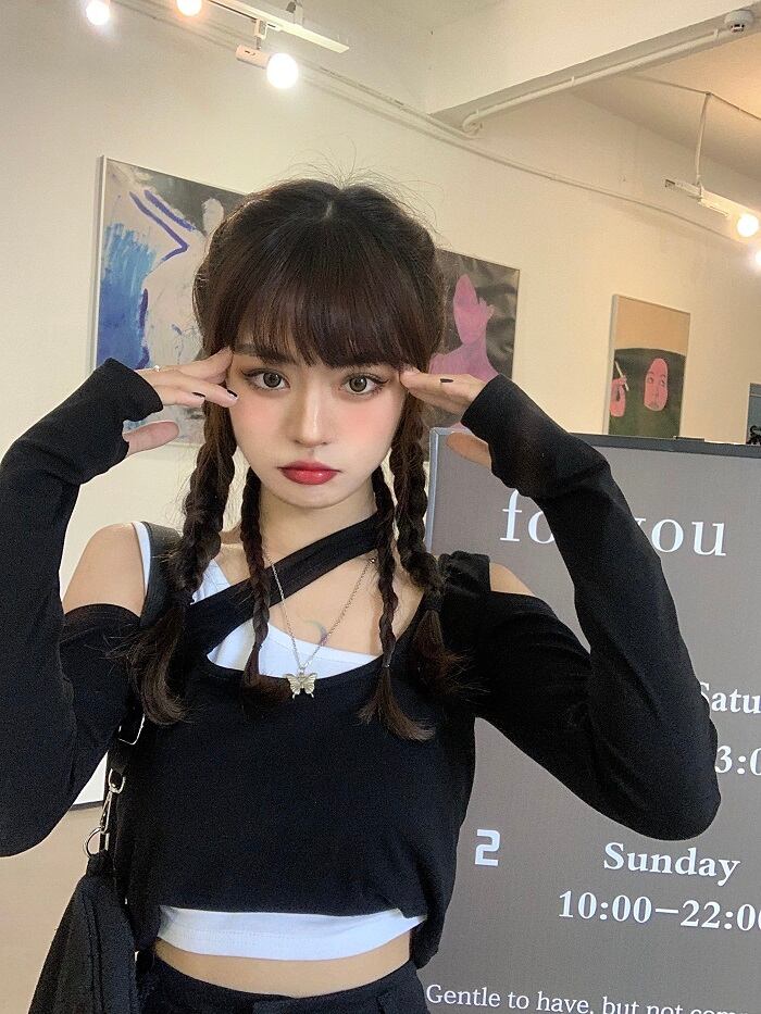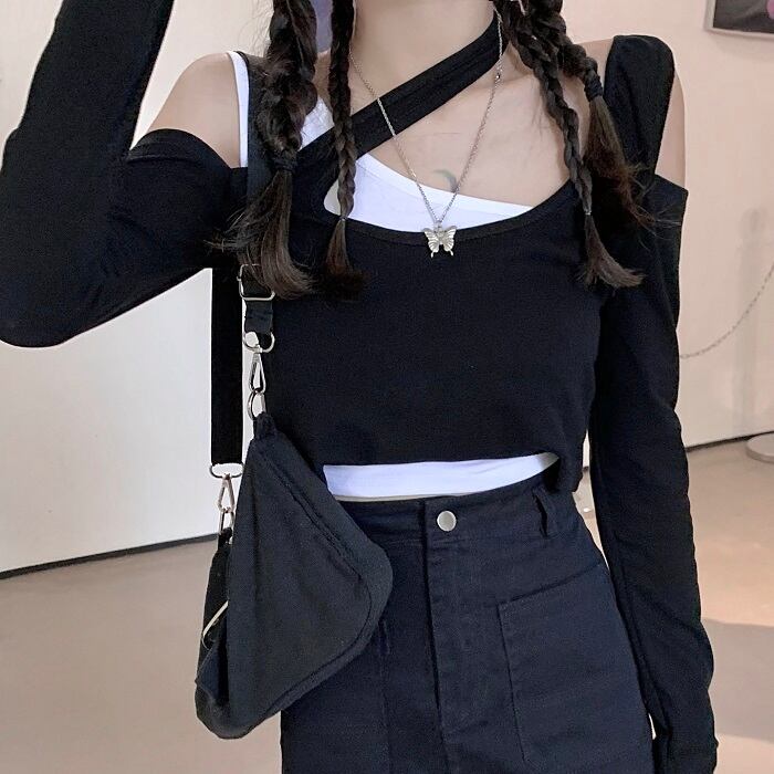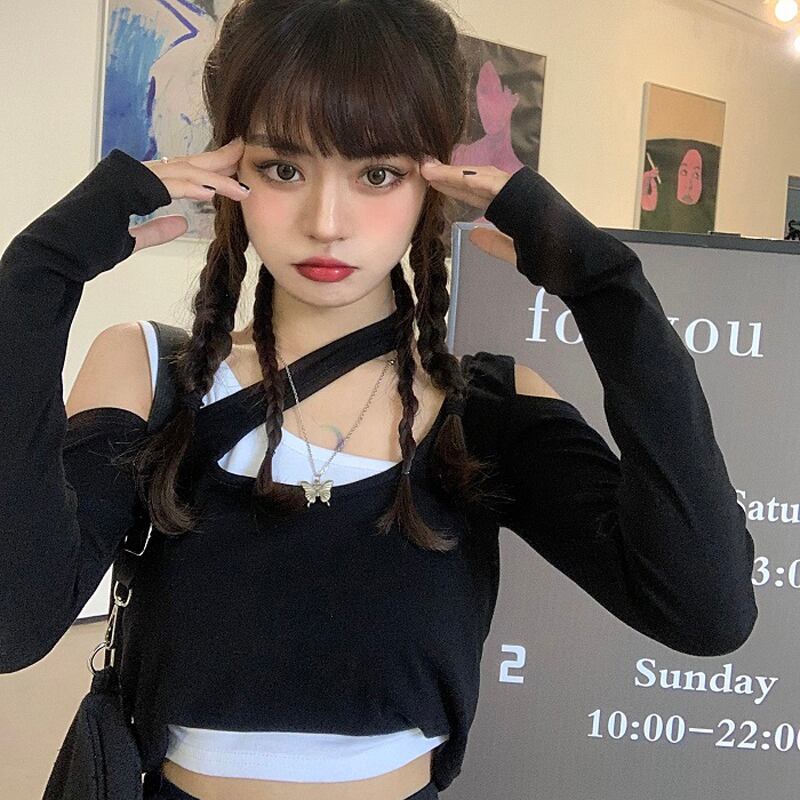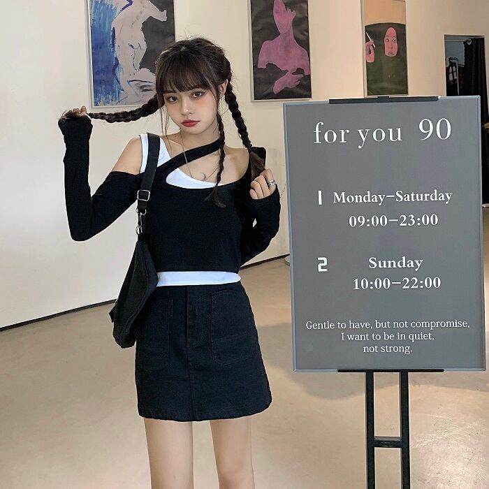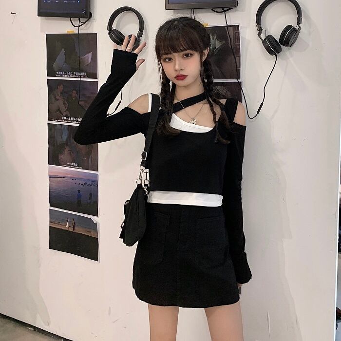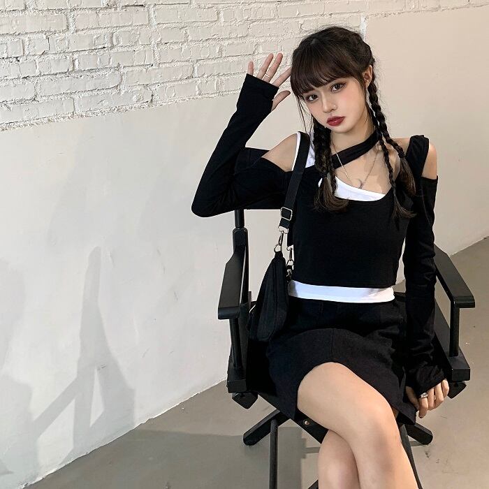 春のジャンピングディスクの婦人服のデザインは、オフショルダーのTシャツのクールな偽のツーピースジャズボトミングトップインを計画しています スプリング 春物 7460018466391257 | framboise21