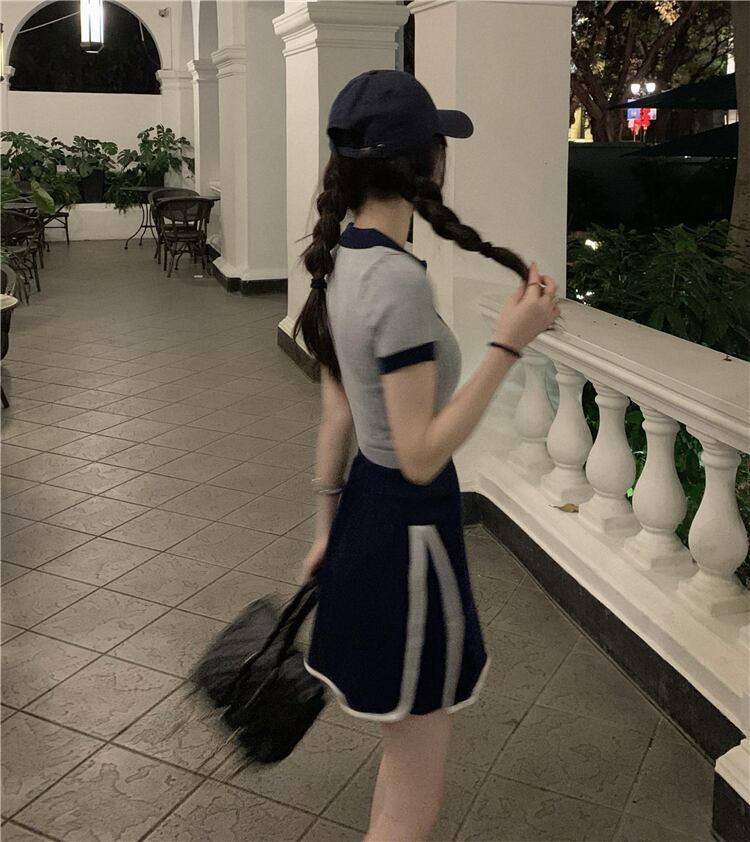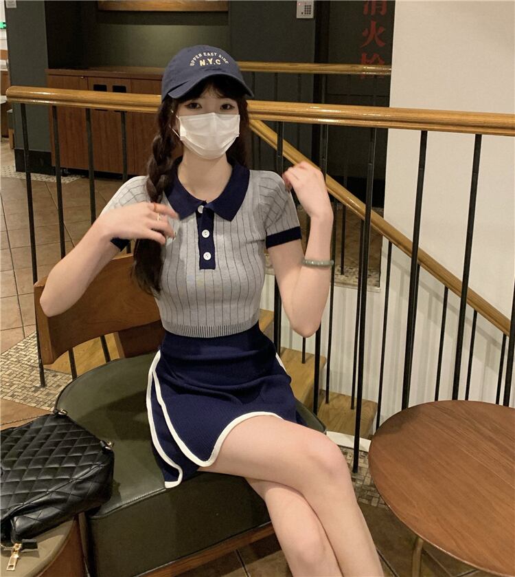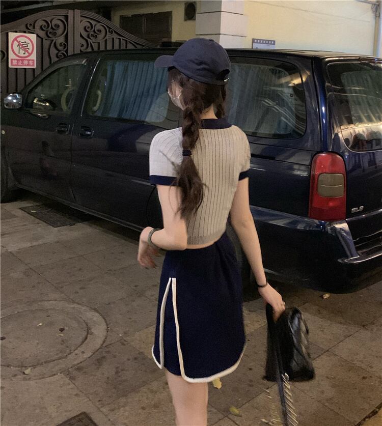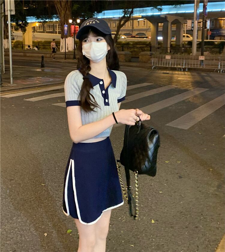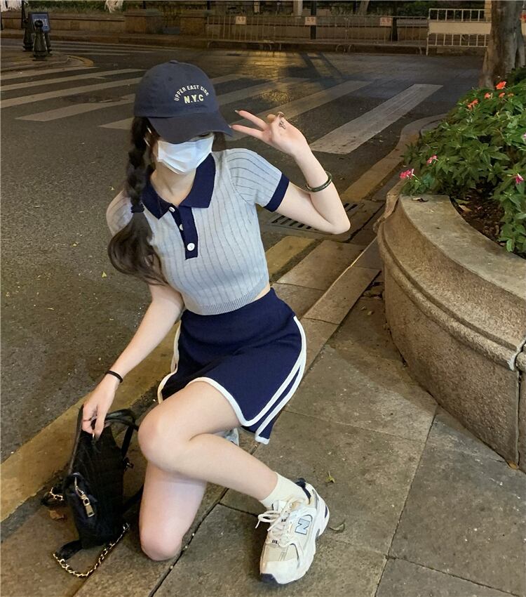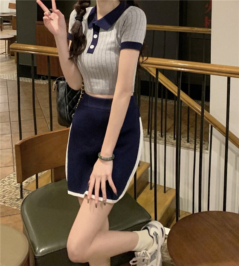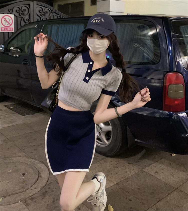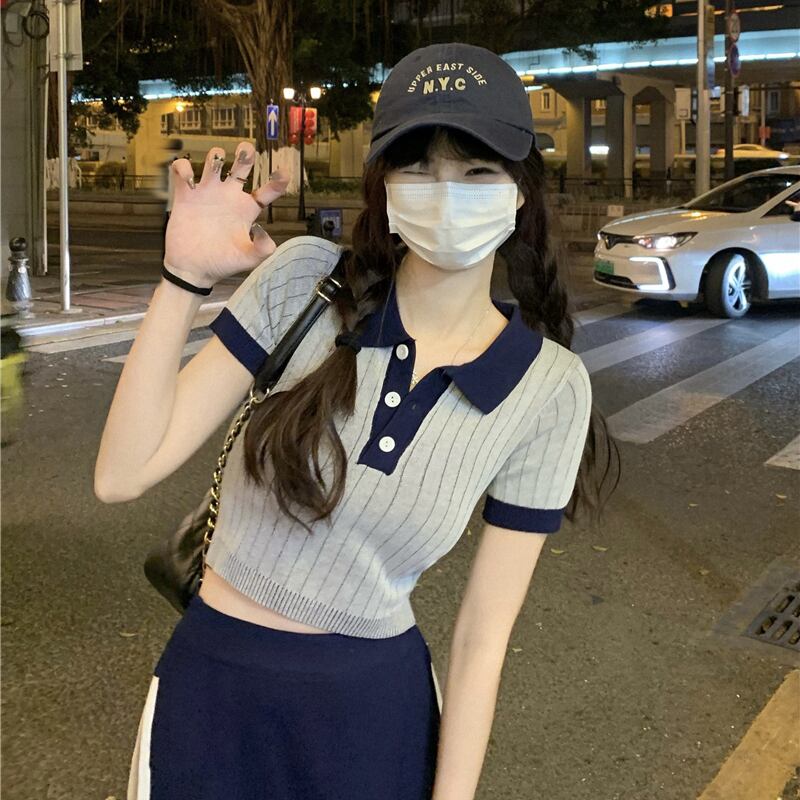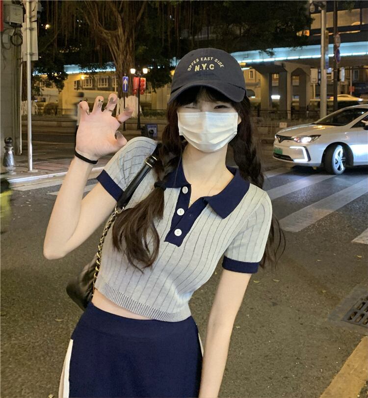 コントラストカラーのニットポロカラーアイスシルク半袖Tシャツレディーストレンディなインハイウエストスリムbmショートシックスウィートでスパイシーなトップサマー ハイウェスト 大人ガーリー キュート カジュアル 夏物 7460068563512238 | framboise21
