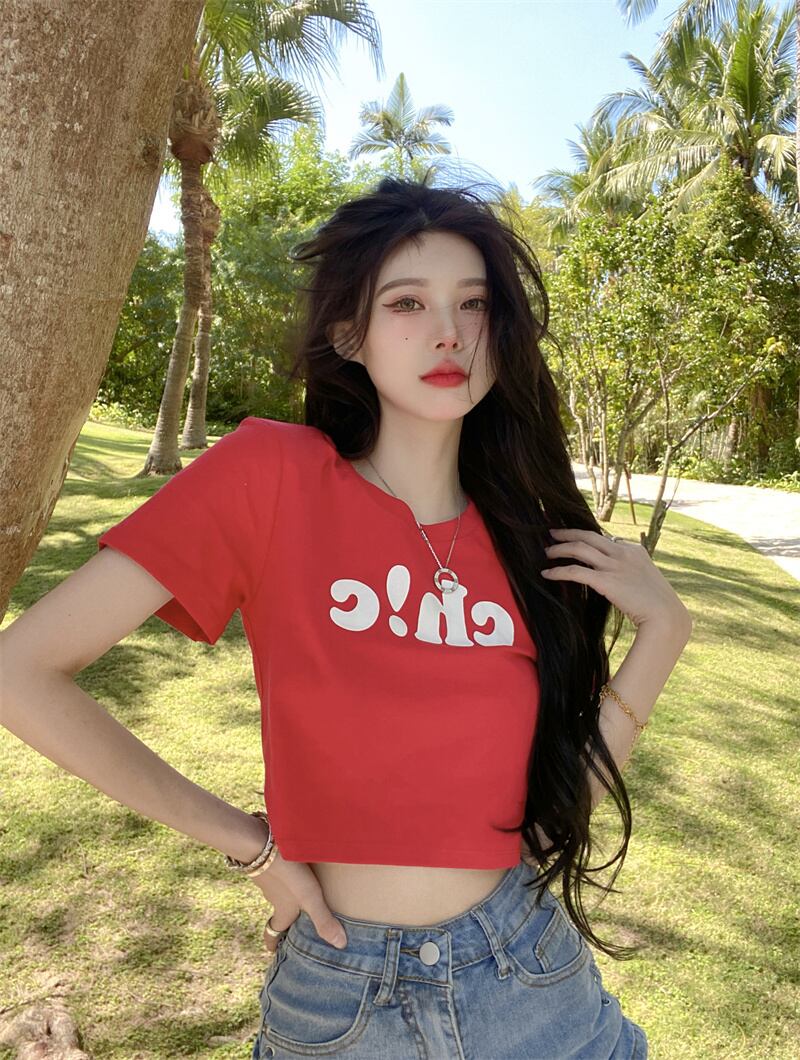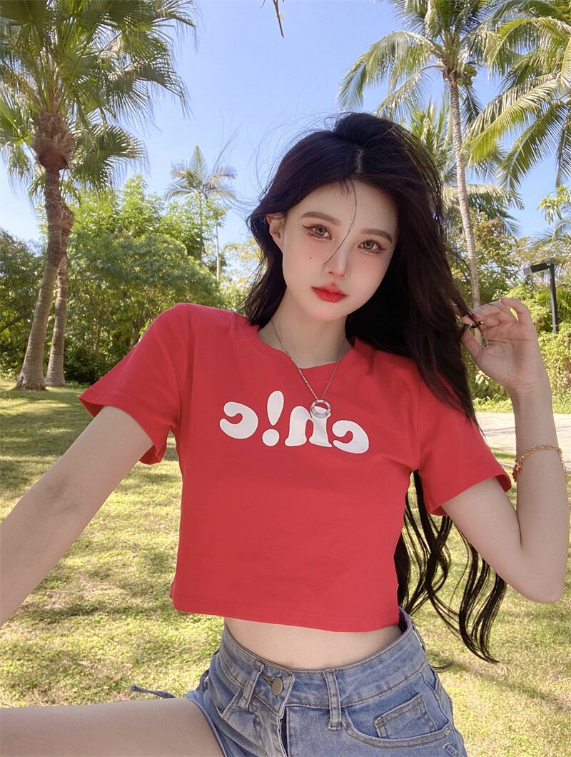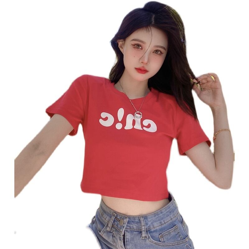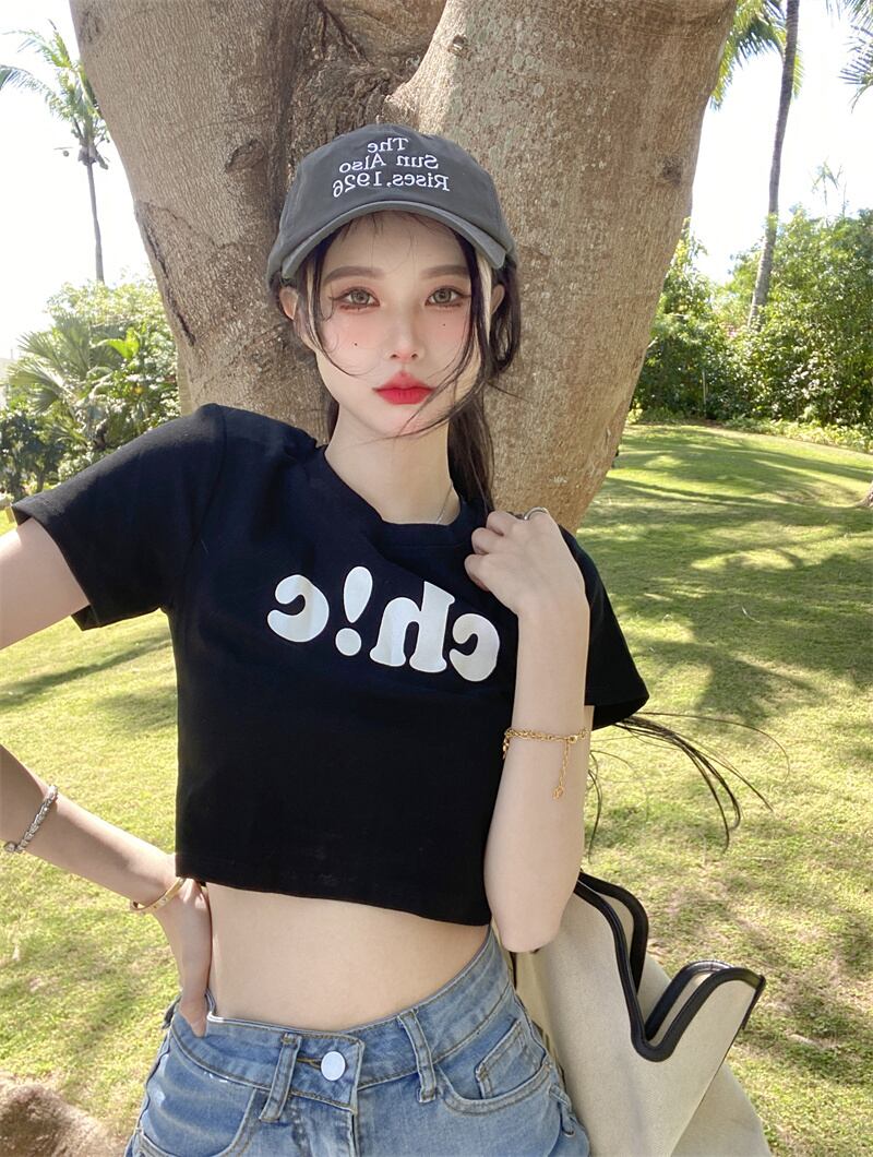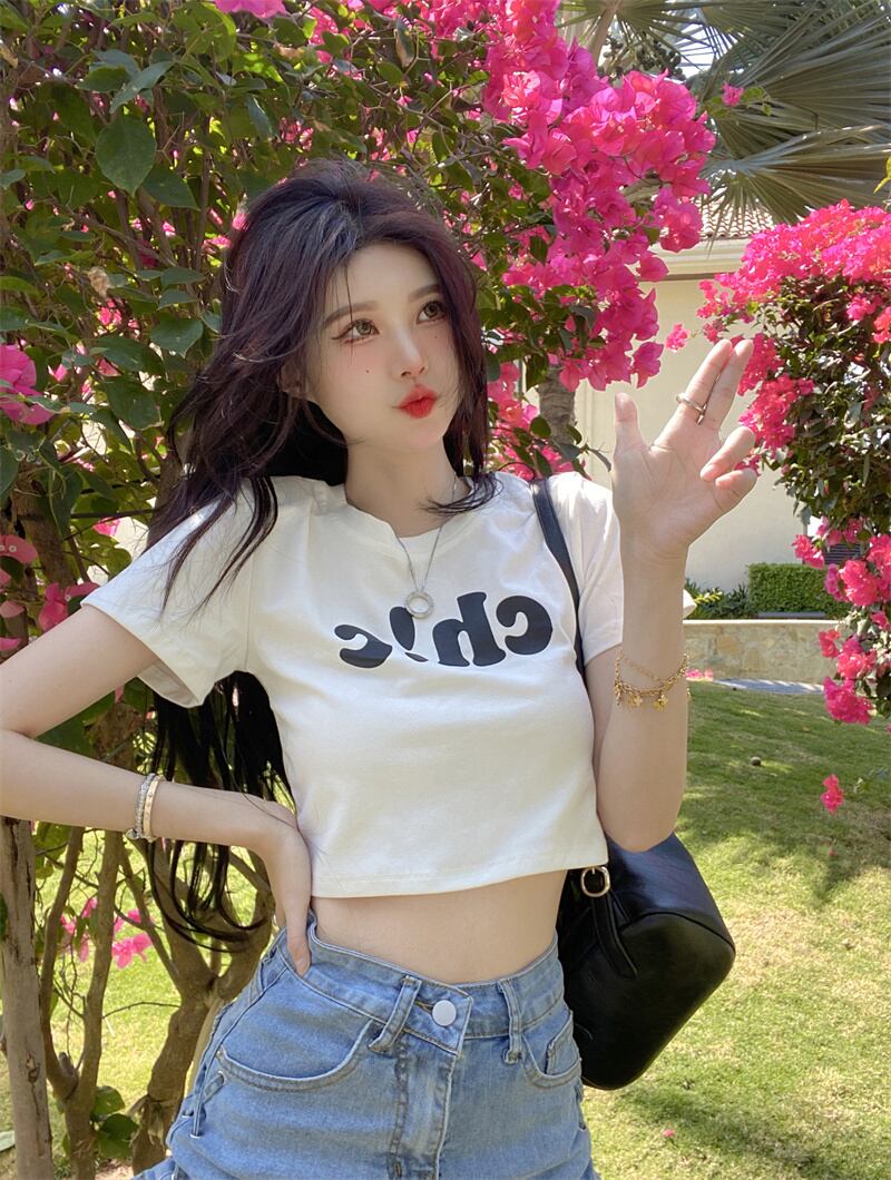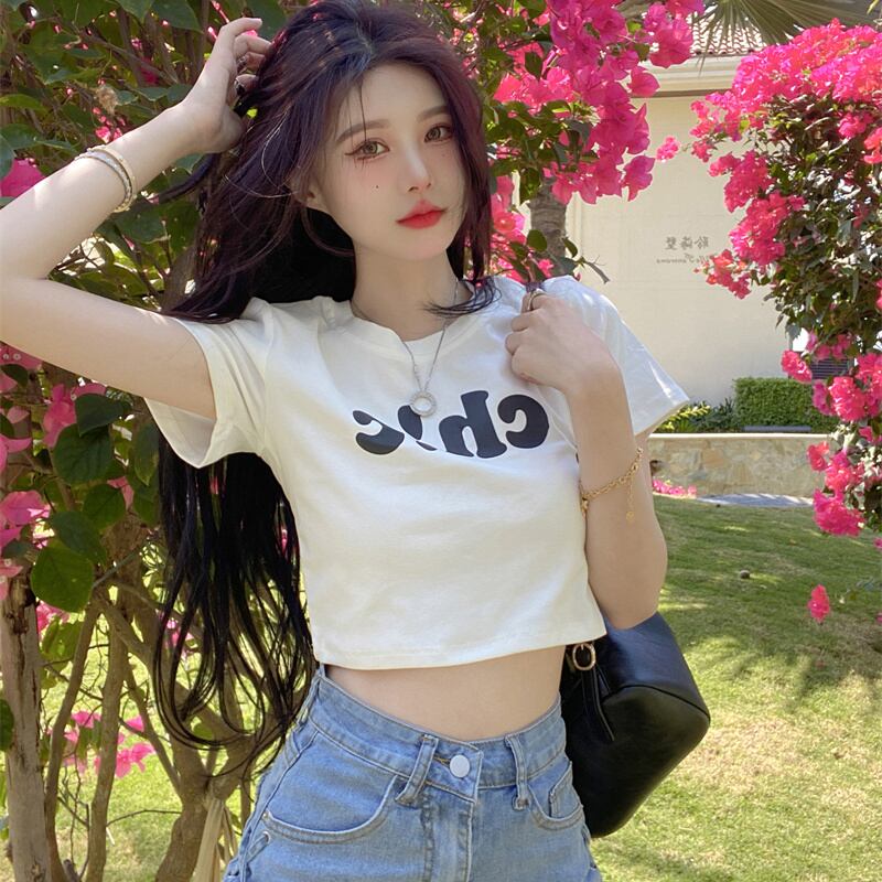 夏の白いショートTシャツの女性の半袖タイトフィットデザインは、小さくて薄い、ハイウエスト、へそ、アメリカンスタイルのフロントショルダートップです ホワイト サマー 夏物 7460052649821692 | framboise21