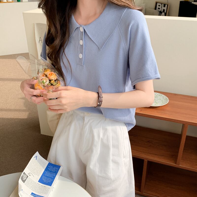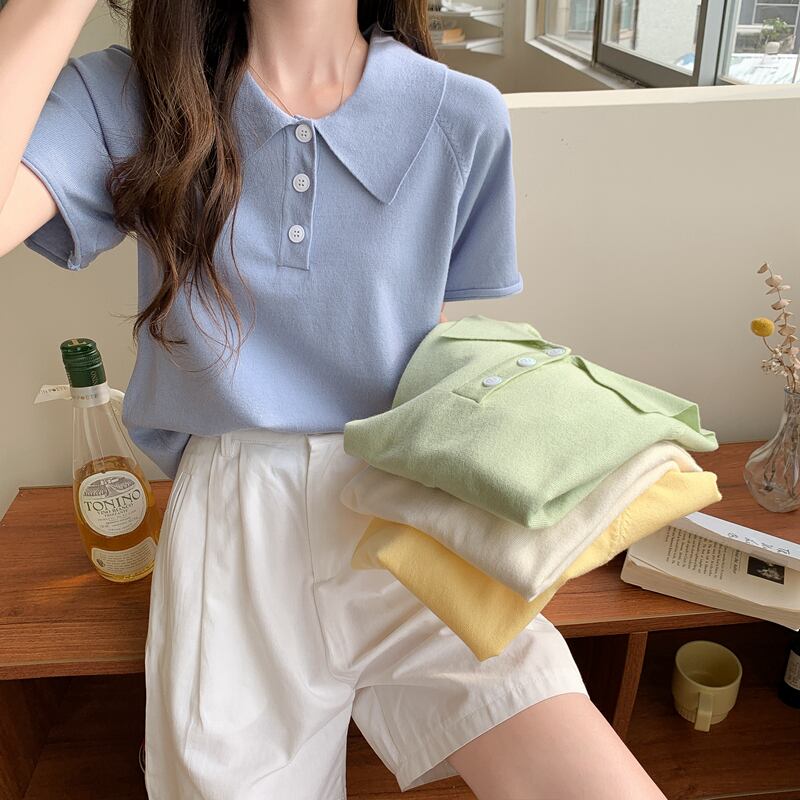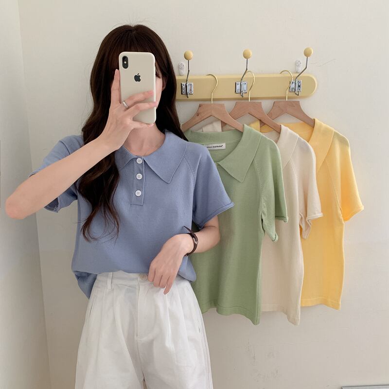 アイスシルク半袖Tシャツ女性の2022年夏の新しいデザインの小さなルーズな薄いセクションの短いニットポロカラーTシャツ ショート サマー 夏物 7460058527670244 | framboise21