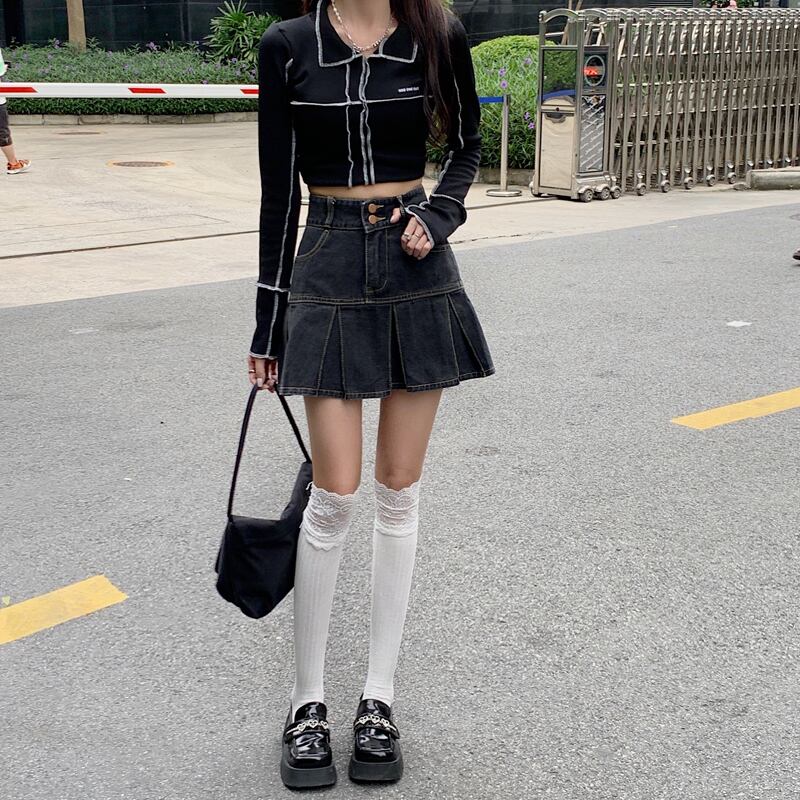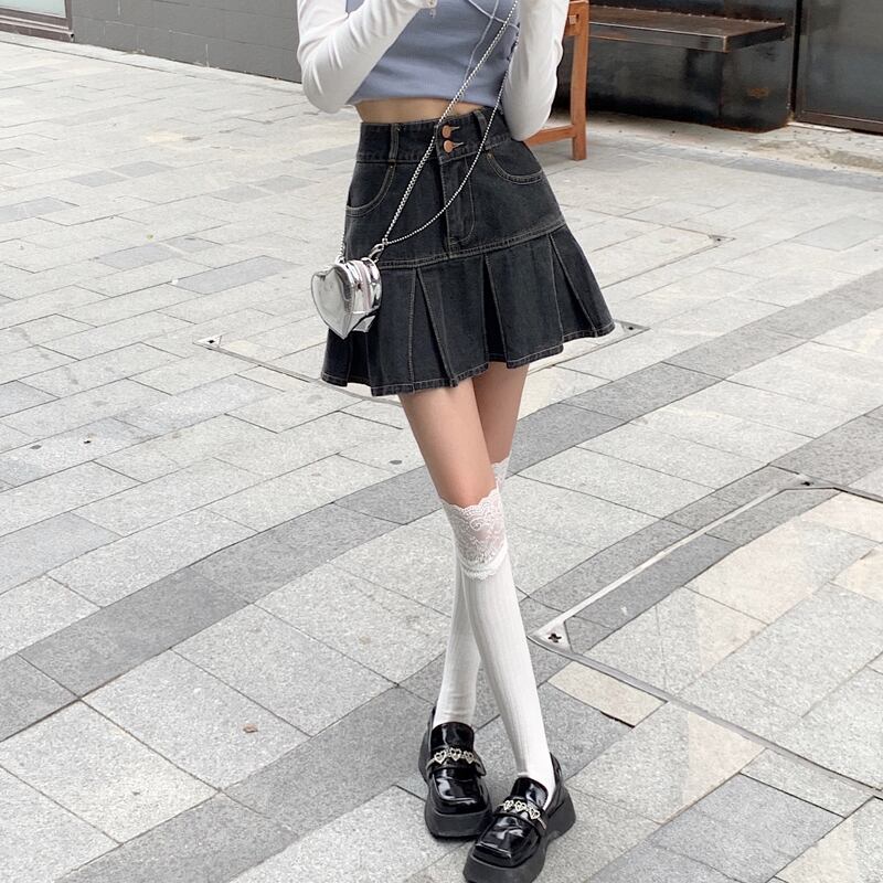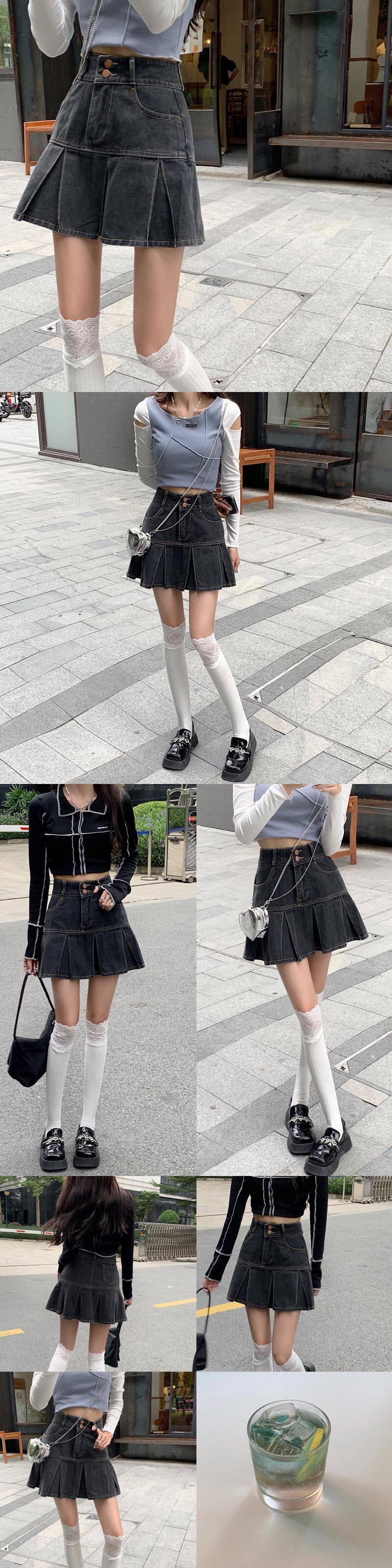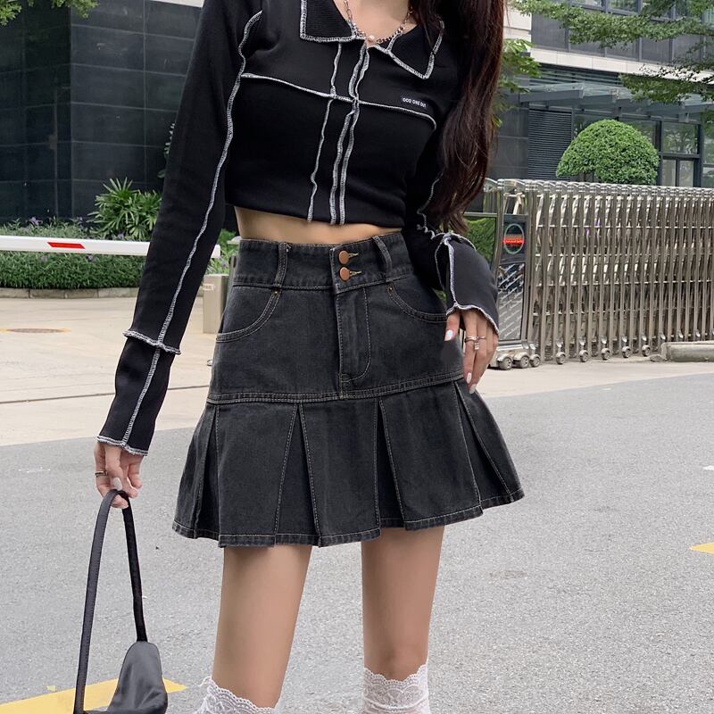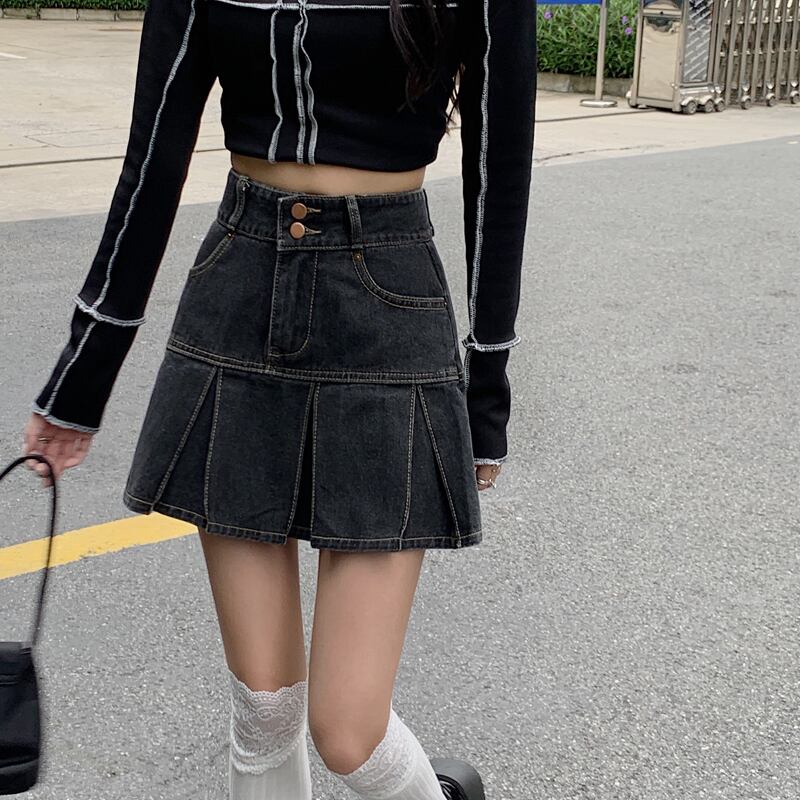 デニムスカート女性の夏の薄いプリーツヒップスカートのデザインは薄く、ハイウエストのAラインショートスカートで裏打ちされています ハイウェスト サマー 夏物 7460034506339366 | framboise21