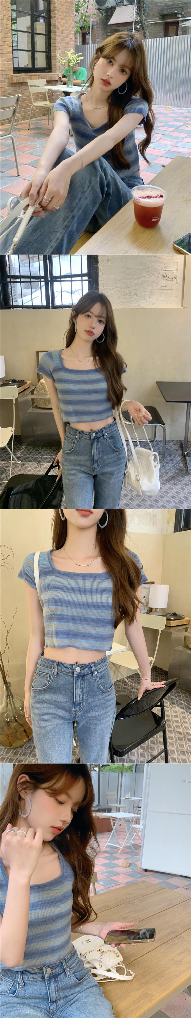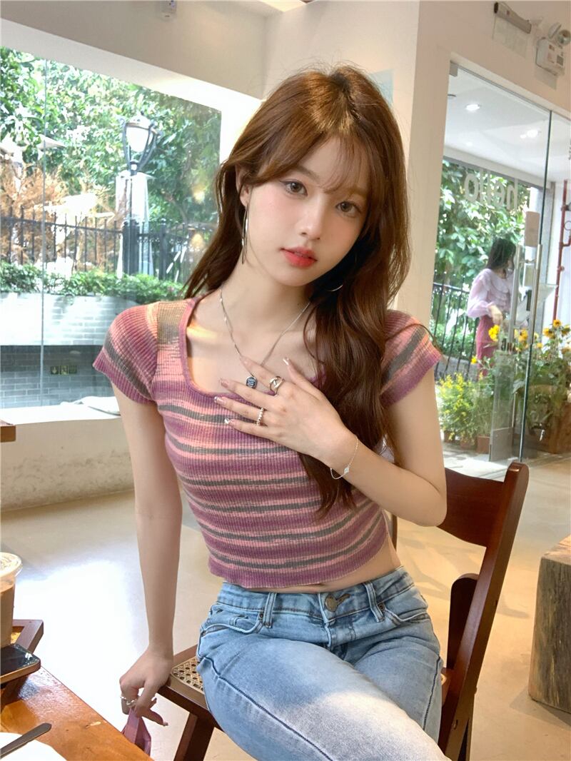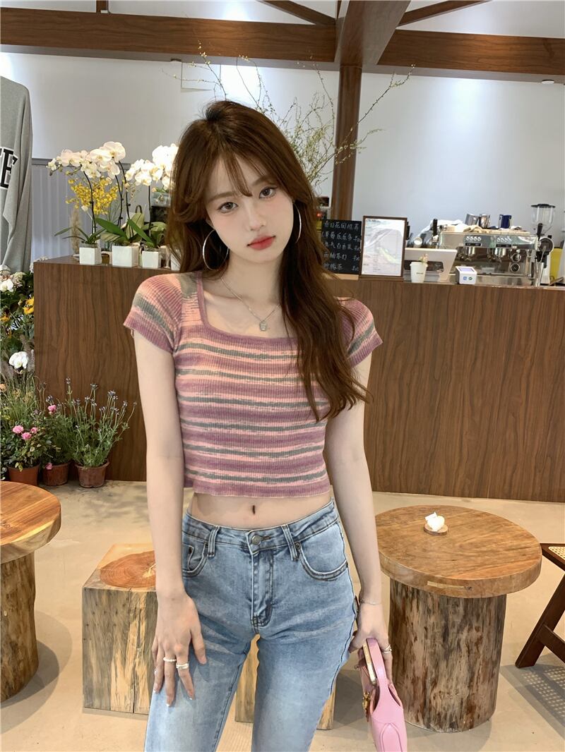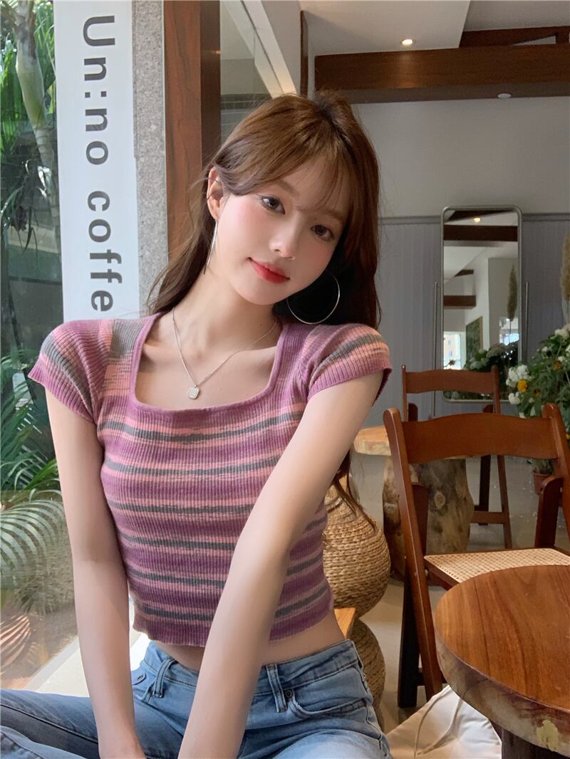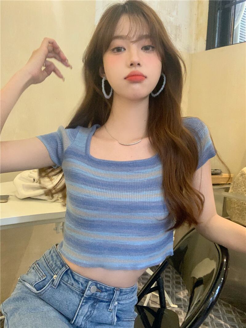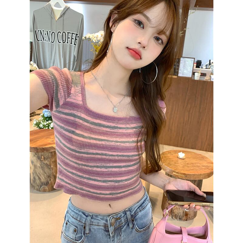 ニット半袖Tシャツ女性の2022年夏の新しい純粋な欲望のデザイン甘くてスパイシーなショートアイスシルクストライプスクエアネックトップ 大人ガーリー スウィート キュート カジュアル サマー 夏物 ピュア スクウェア 7460088910524751 | framboise21