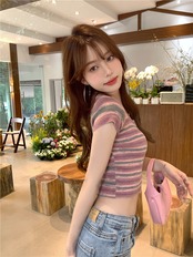 ニット半袖Tシャツ女性の2022年夏の新しい純粋な欲望のデザイン甘くてスパイシーなショートアイスシルクストライプスクエアネックトップ 大人ガーリー スウィート キュート カジュアル サマー 夏物 ピュア スクウェア 7460088910524751