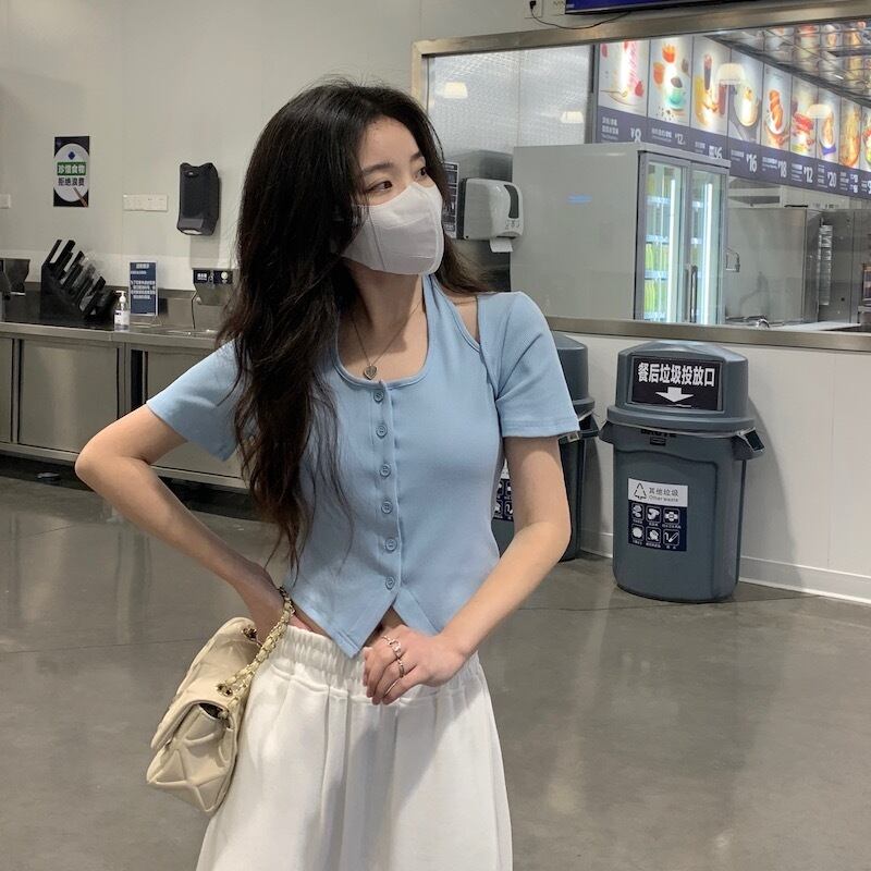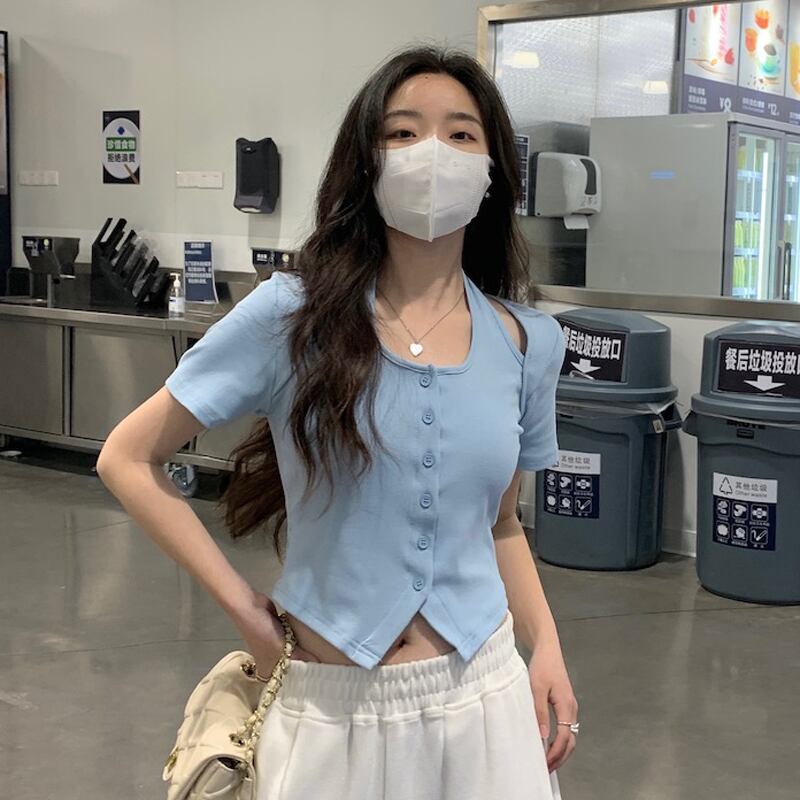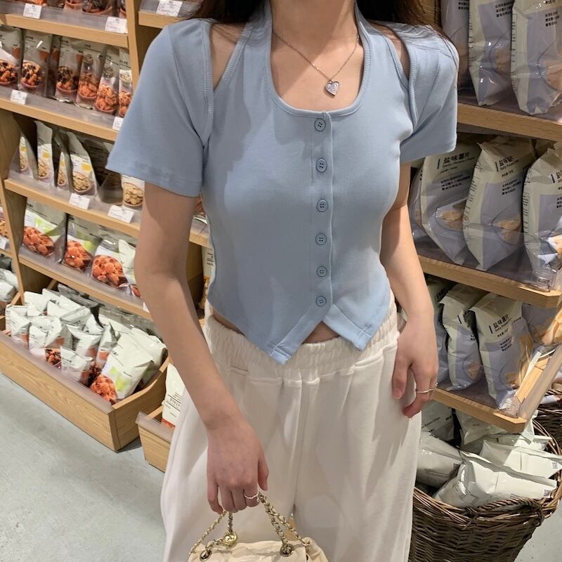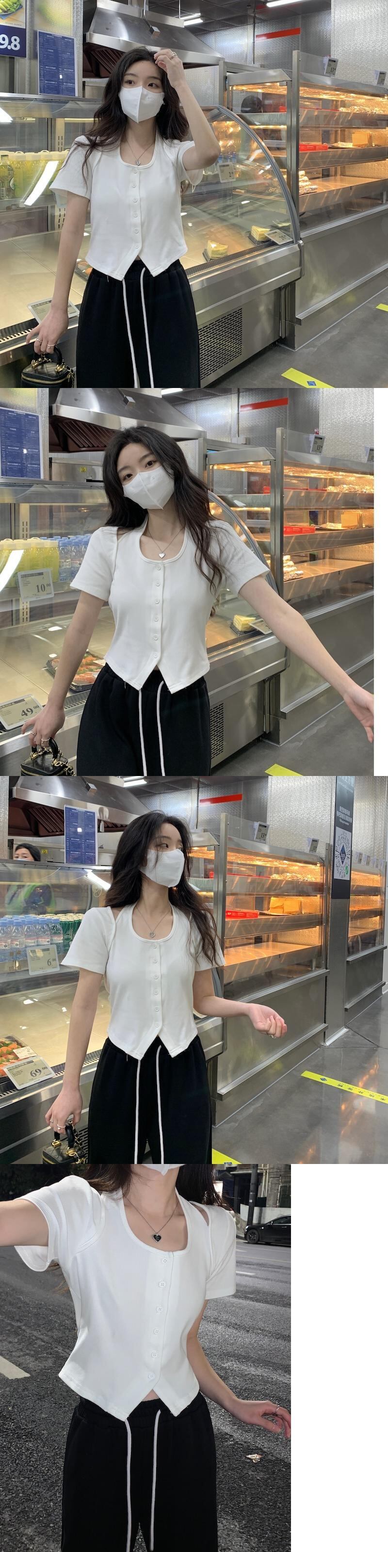 フロントショルダー半袖Tシャツレディースサマーホワイトショートトップ甘くてスパイシーなデザインの不規則なフェイクツーピースホルターシャツ 大人ガーリー スウィート キュート カジュアル 夏物 7460037873250947 | framboise21