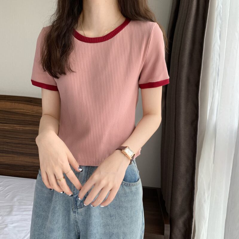 コントラストカラースリミングニッチアイスシルクTシャツサマー半袖レディースデザインセンスのエインスタイルオールマッチショートシックトップインタイド 夏物 7460055133986737 | framboise21