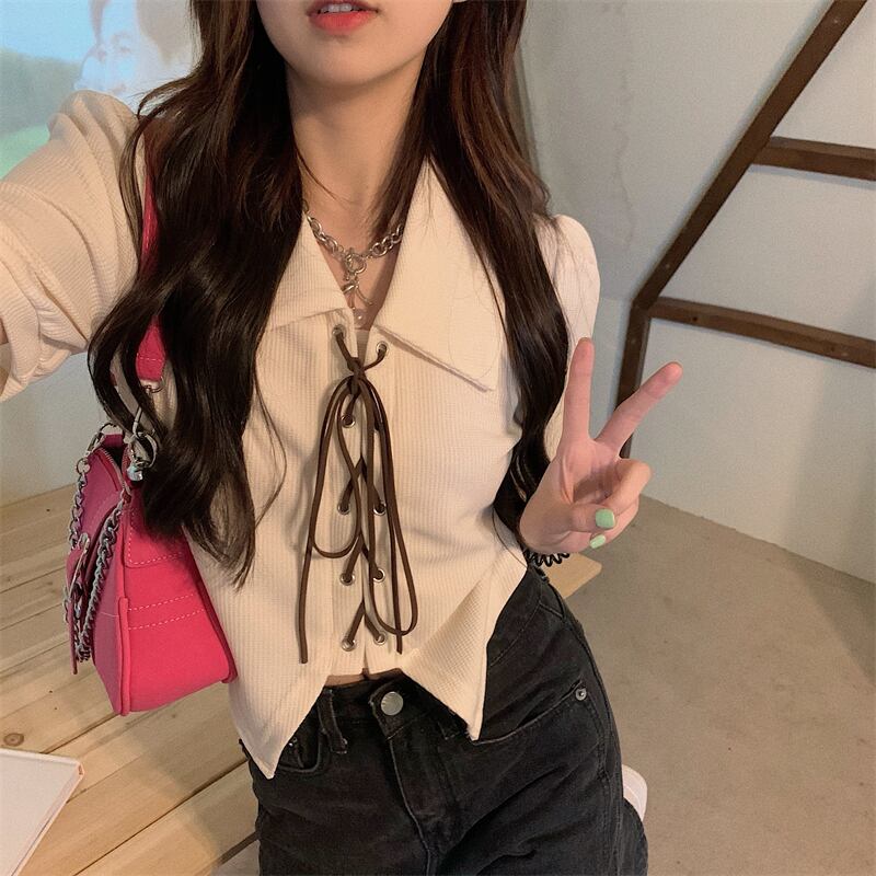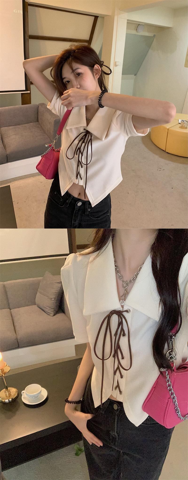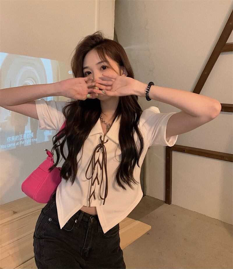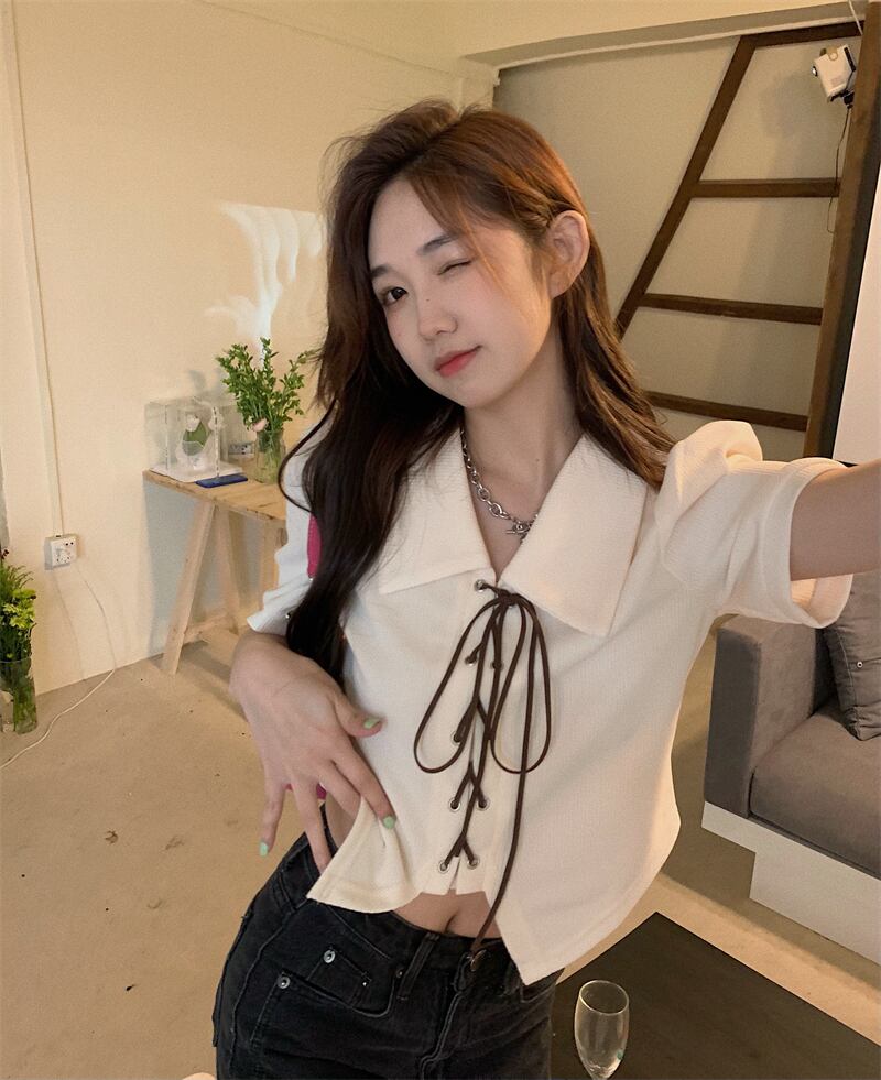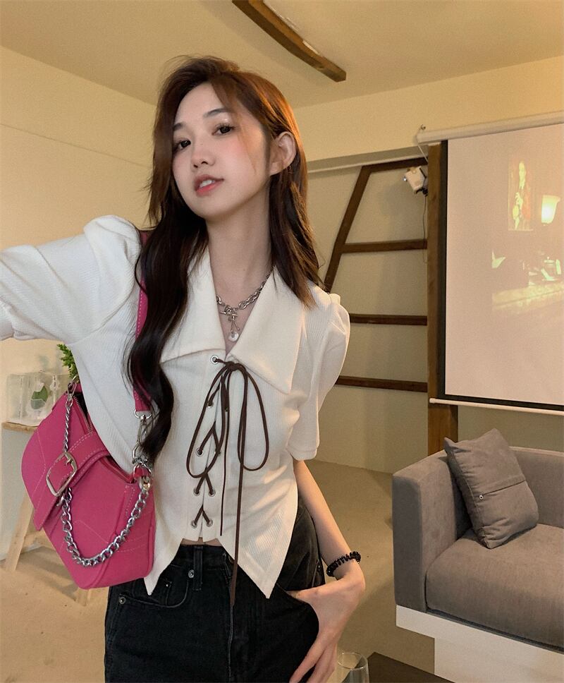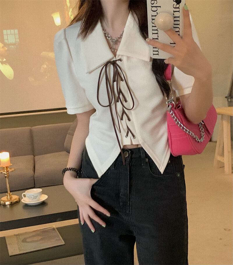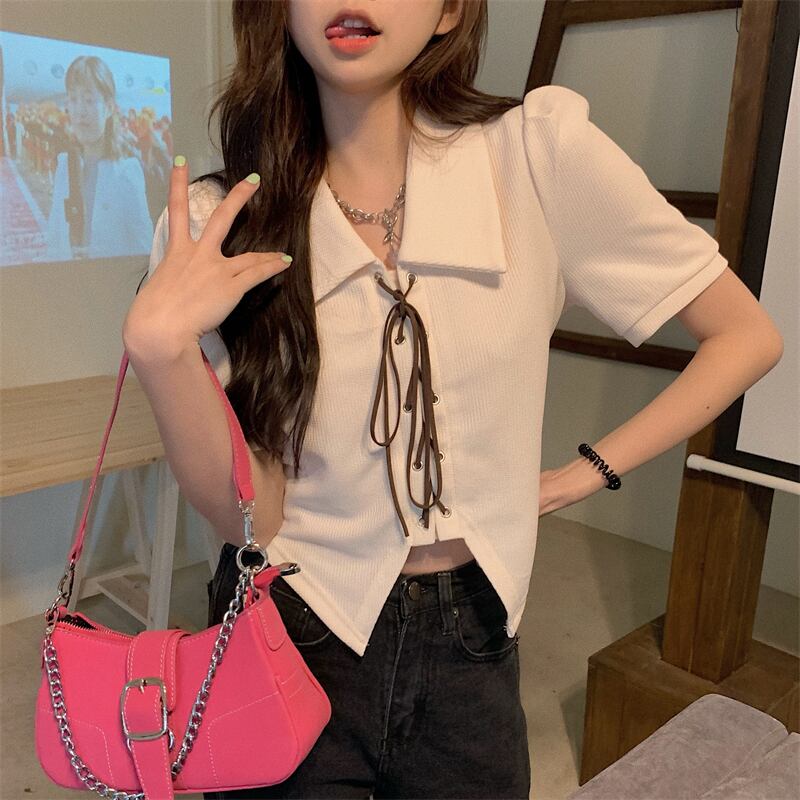 ニッチな甘さとスパイシーな薄手のパフスリーブポロシャツの感覚を持つ半袖シャツ女性の夏の不規則なショートトップ 大人ガーリー スウィート キュート カジュアル サマー 夏物 7460052582281721 | framboise21