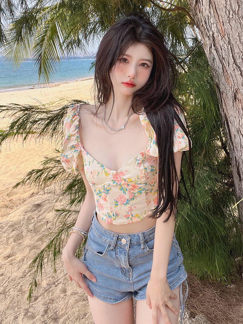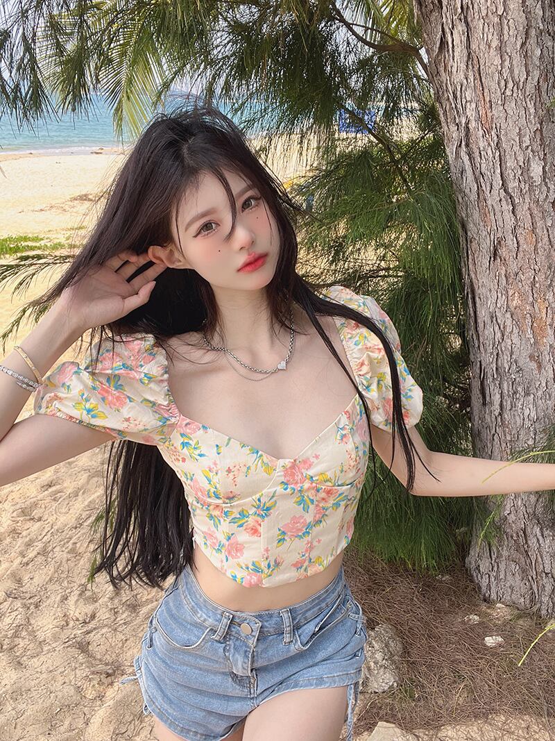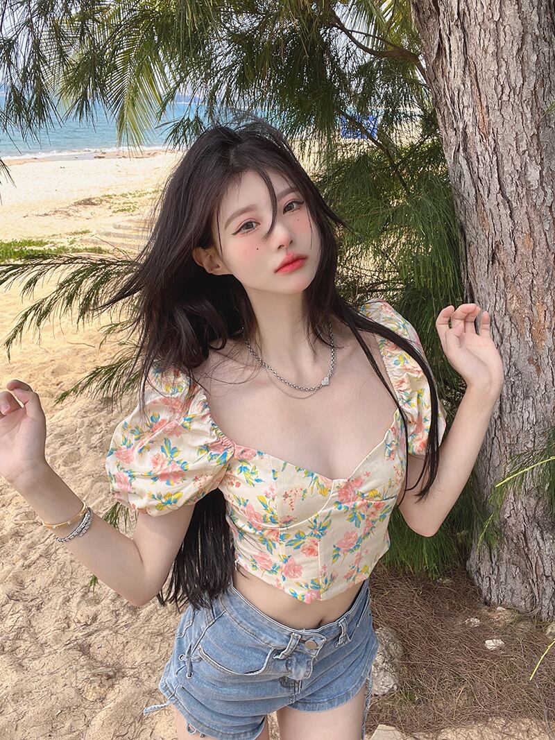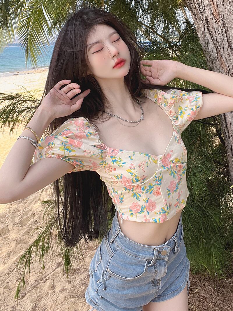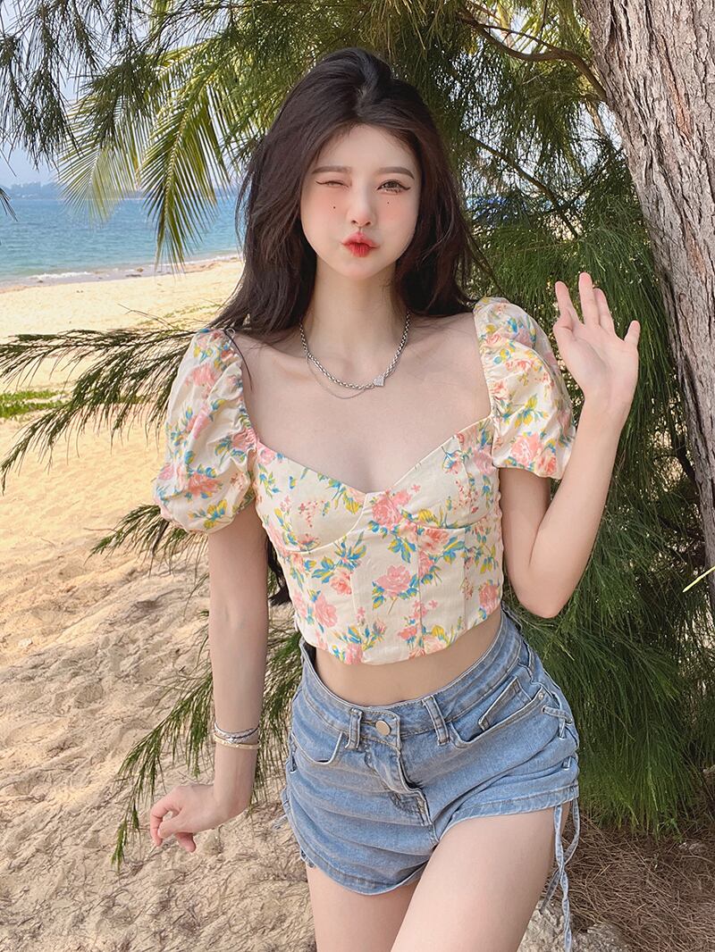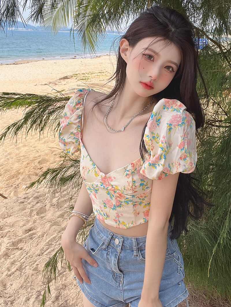 夏のデザインセンスニッチフランスのスーパーフェアリースクエアカラーフローラル半袖シャツ女性の純粋な欲望パフスリーブショートトップ サマー 夏物 花柄 ピュア スクウェア 7460023552975301 | framboise21