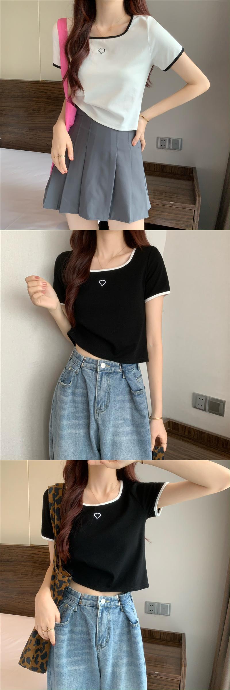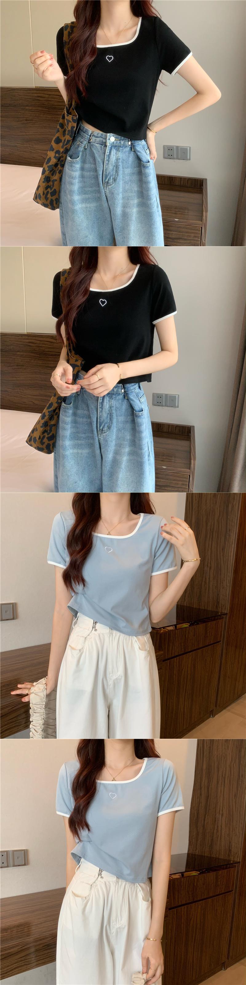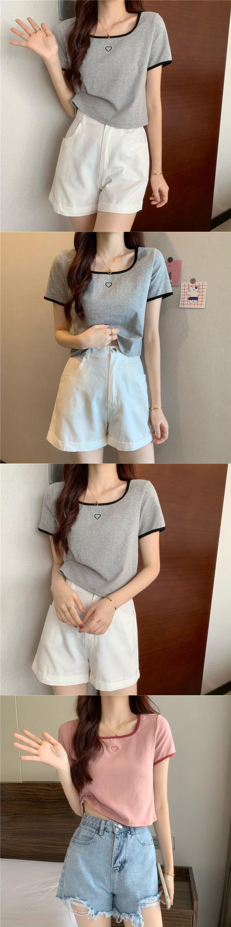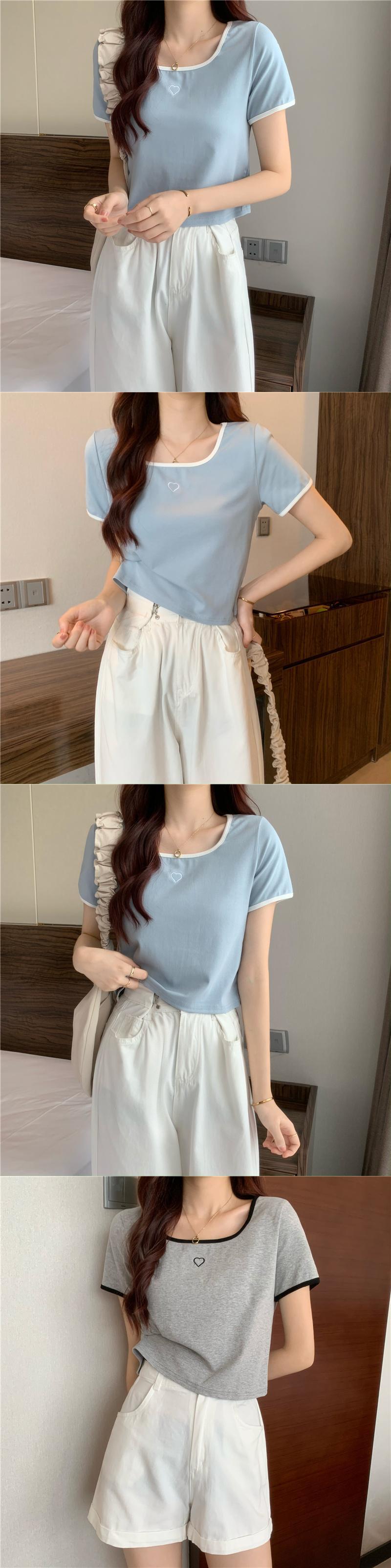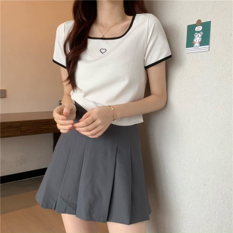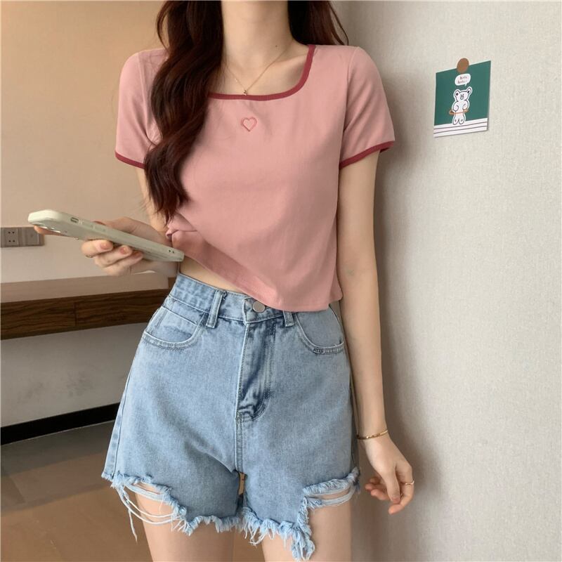 2022年夏の新しいグレーのフロントショルダー半袖Tシャツレディースフレンチデザインハイウエストショートスクエアカラートップイントレンド ハイウェスト サマー 夏物 スクウェア 7460063300018835 | framboise21