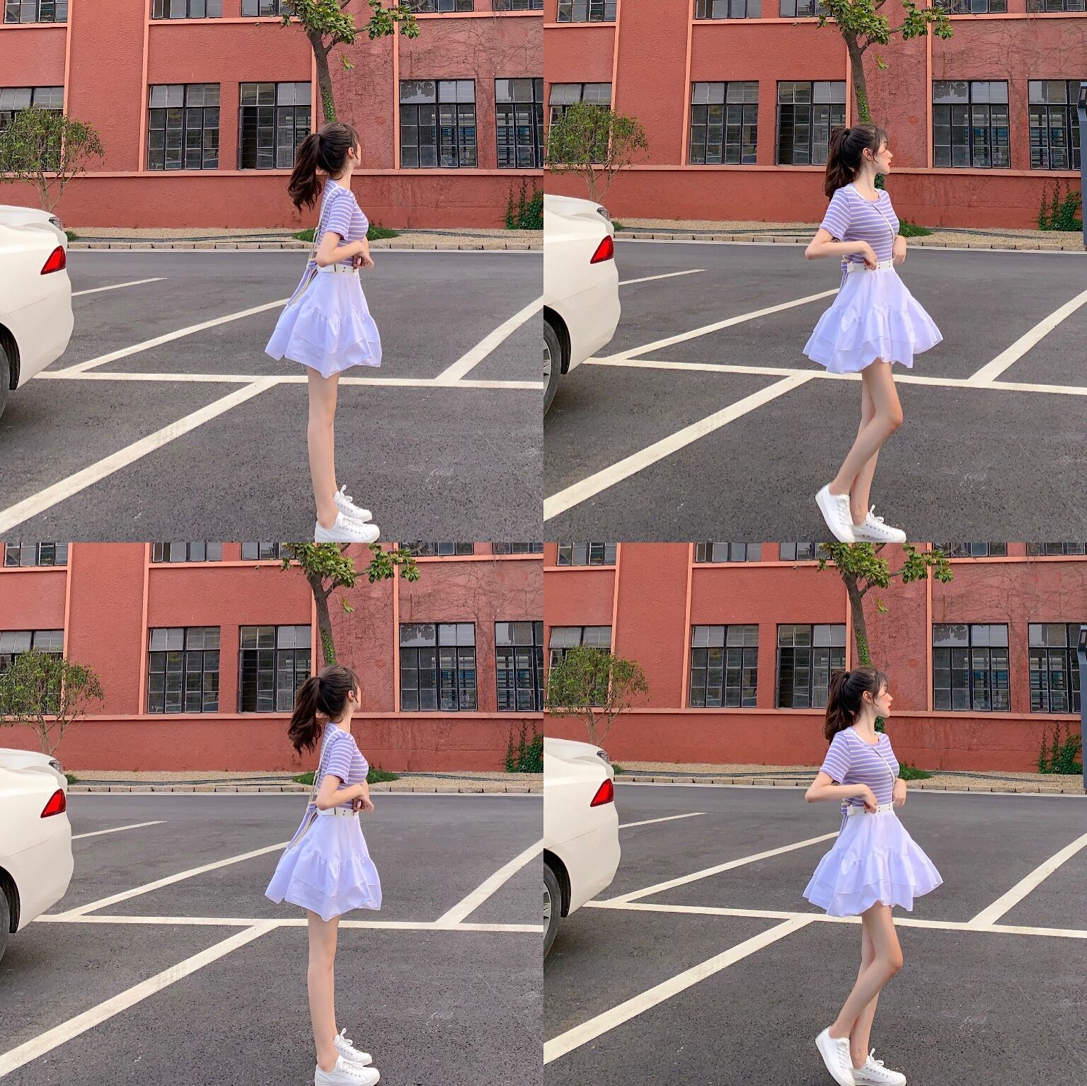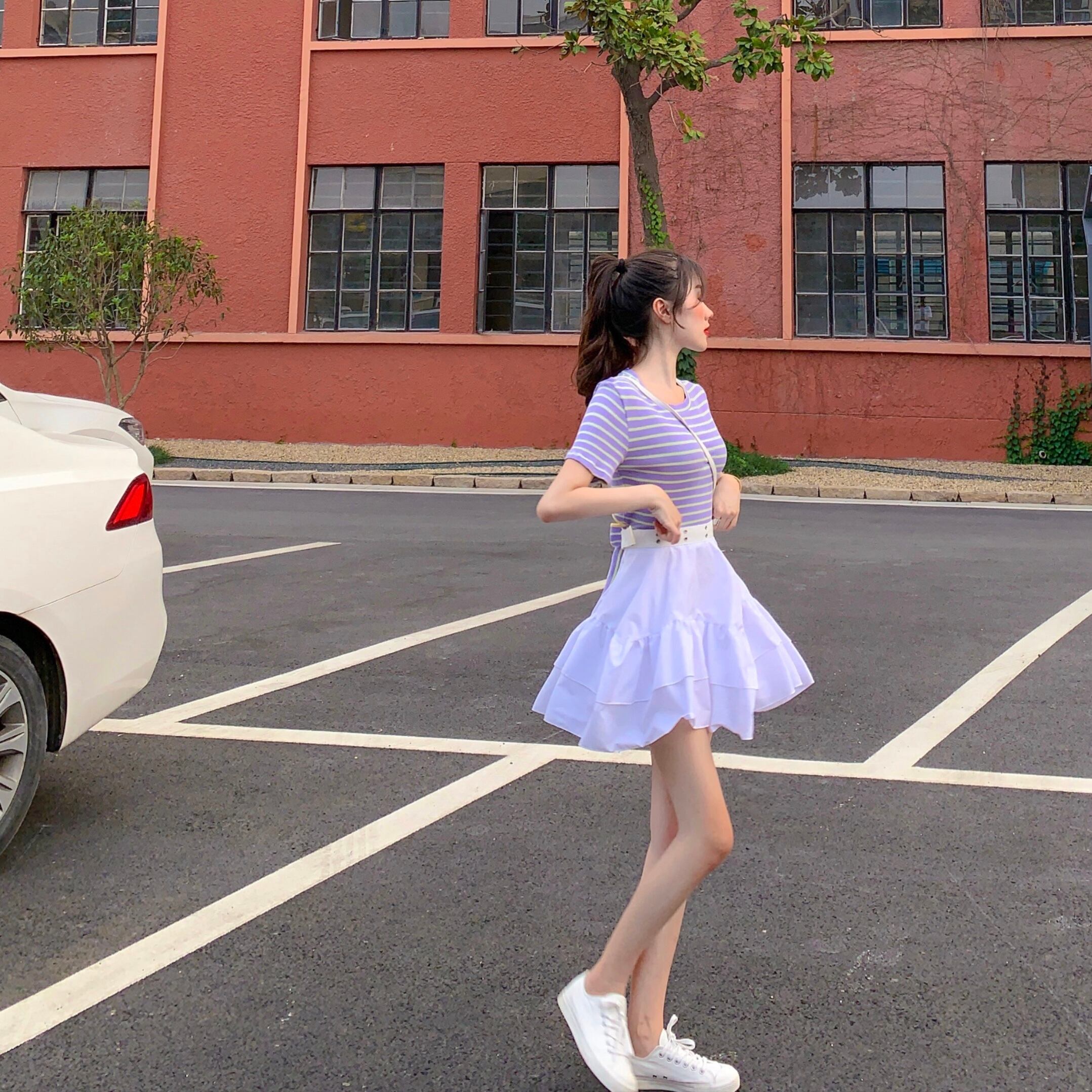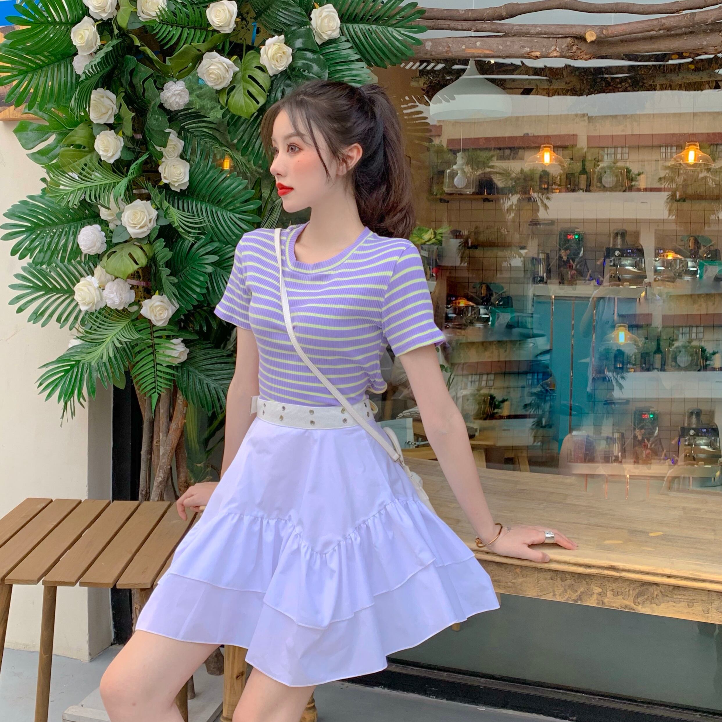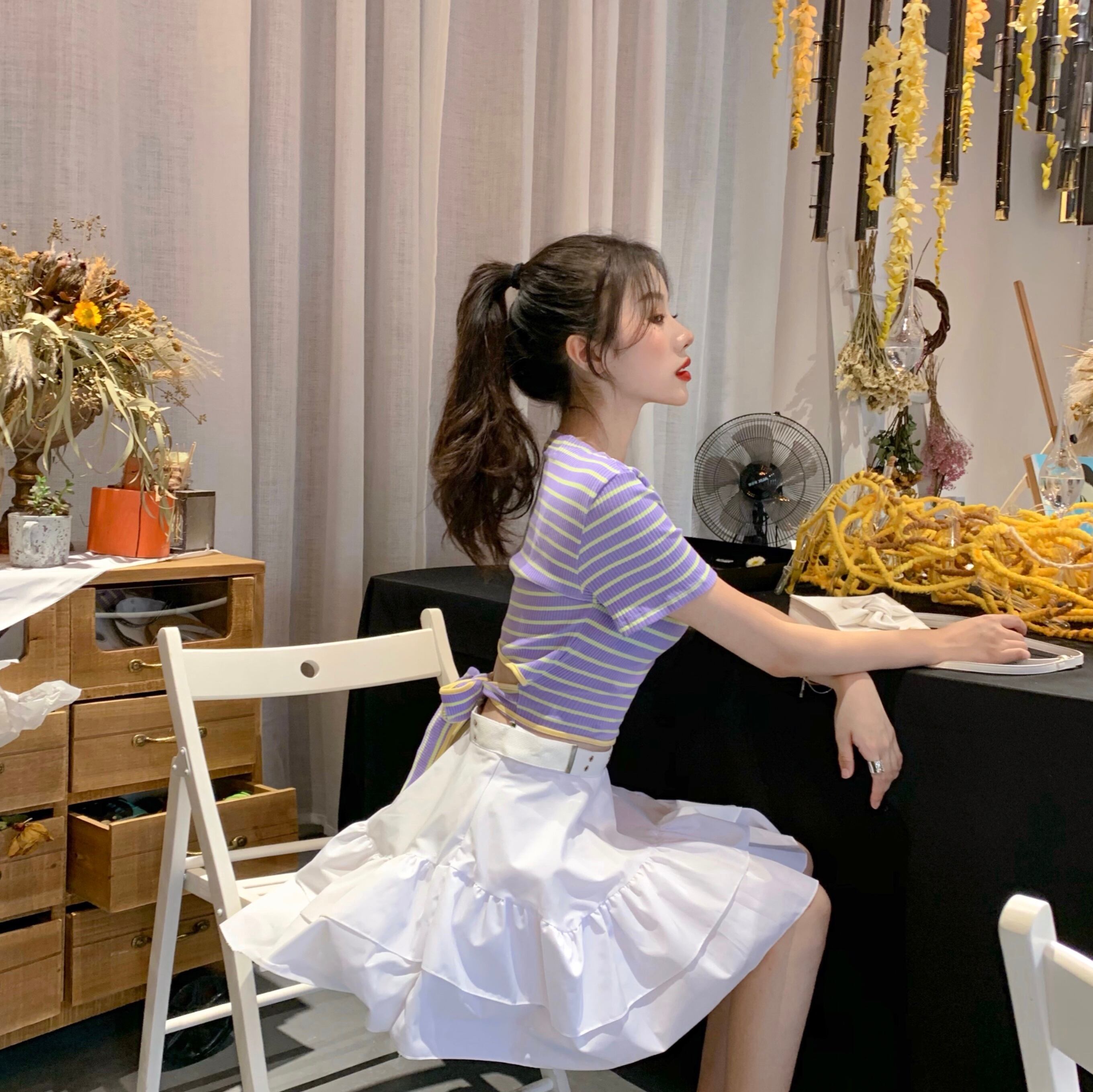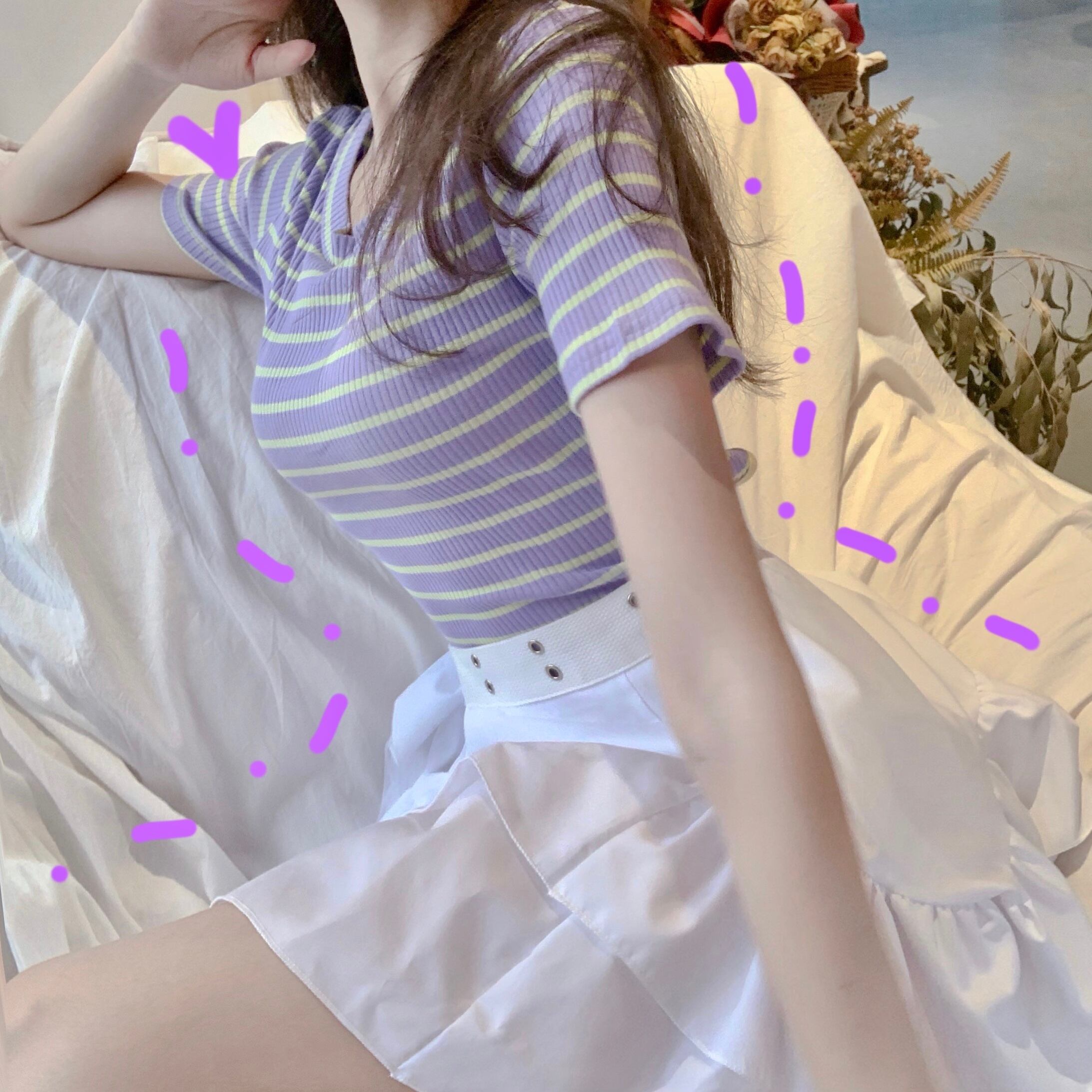 色:ストライプトップ,白いスカート