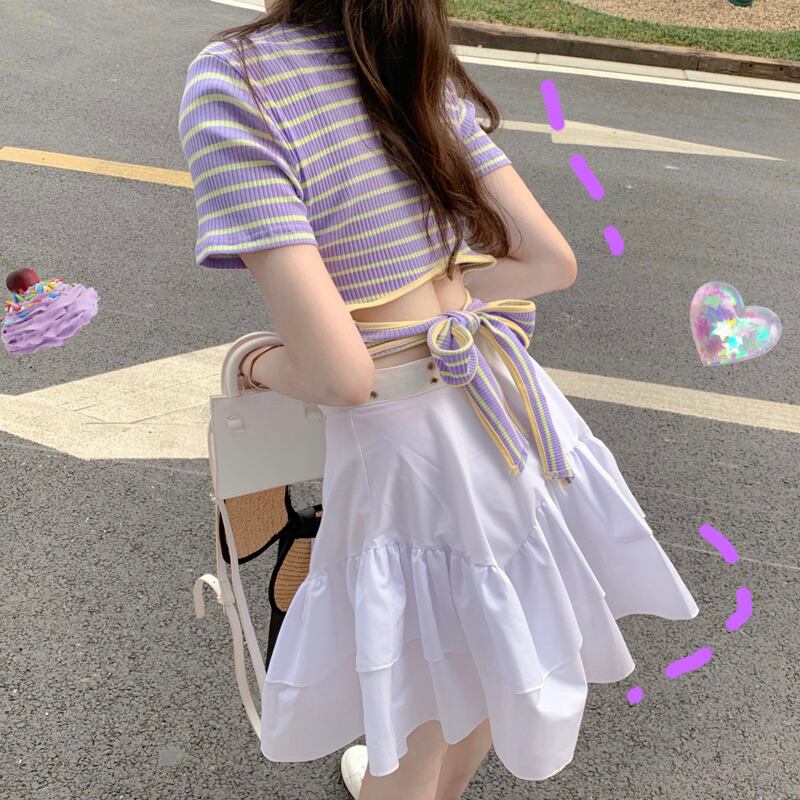 ストライプの半袖Tシャツ女性の2022年夏の新しい小さな新鮮で甘いデザインのハイウエストショートバックレストップイン ハイウェスト 大人ガーリー スウィート キュート カジュアル サマー 夏物 7460076645107338 | framboise21