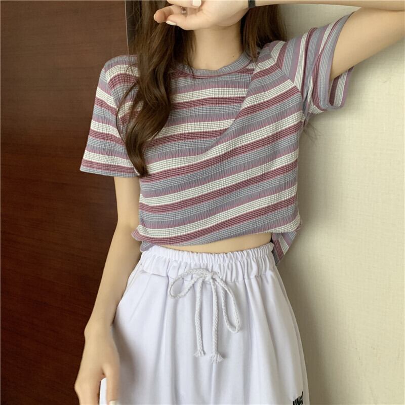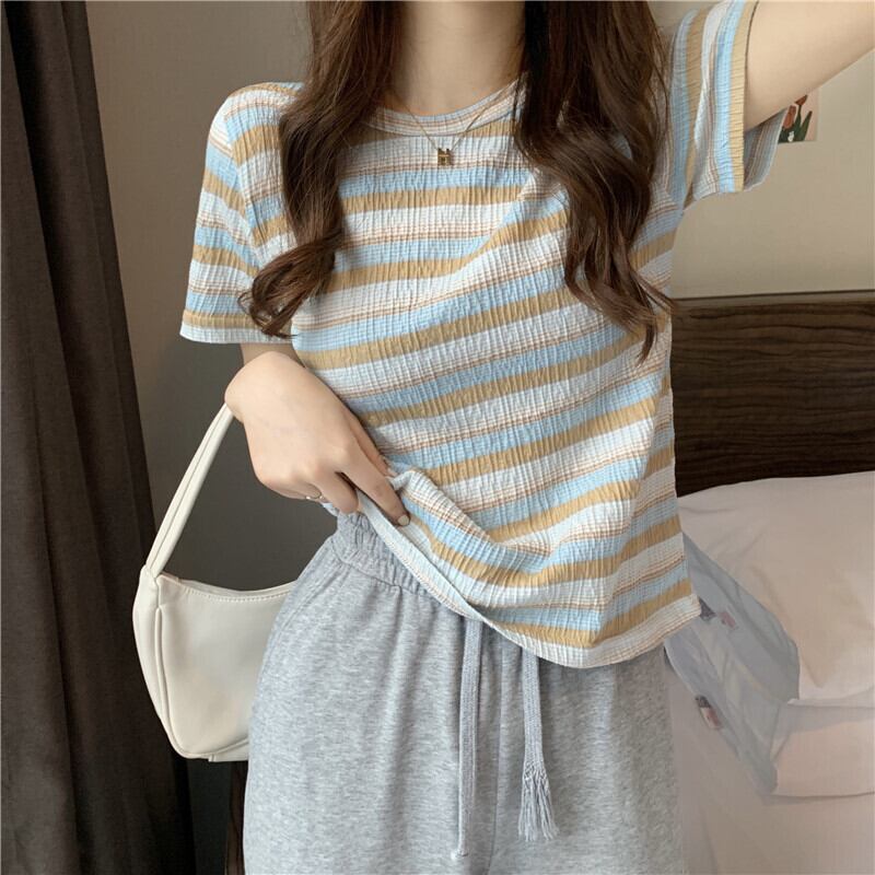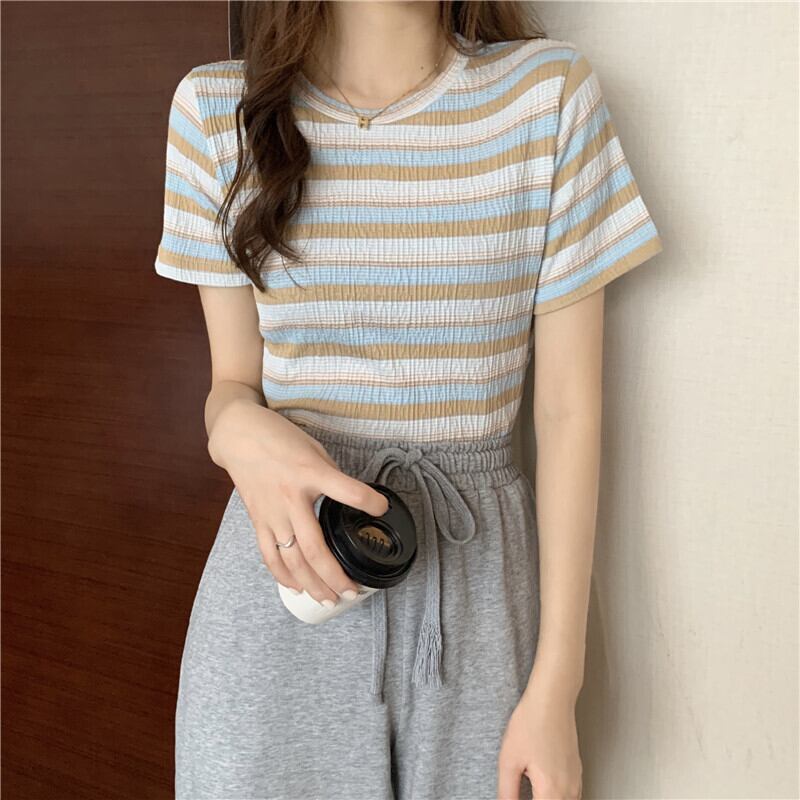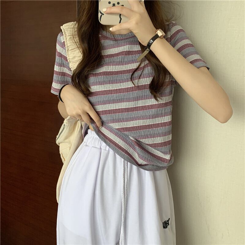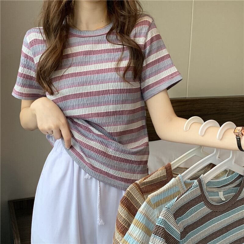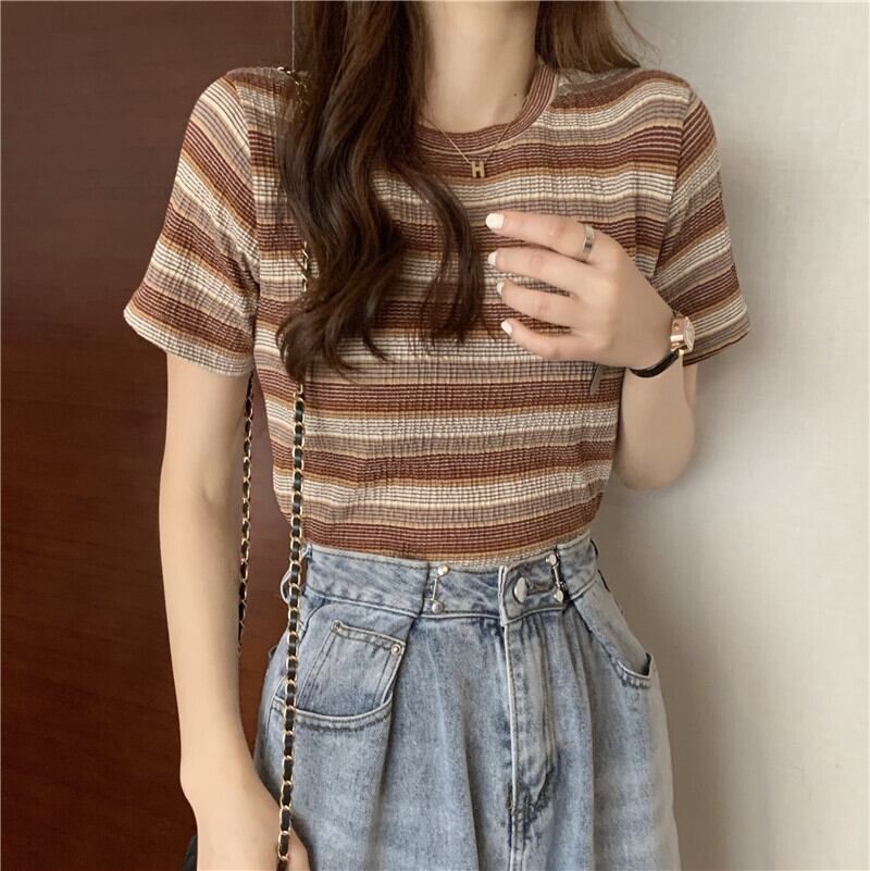 レインボーストライプ半袖Tシャツレディース2022年夏の新しいショートトップレディースデザインセンスニッチオールマッチスモールシャツイン サマー 夏物 7460087119947417 | framboise21