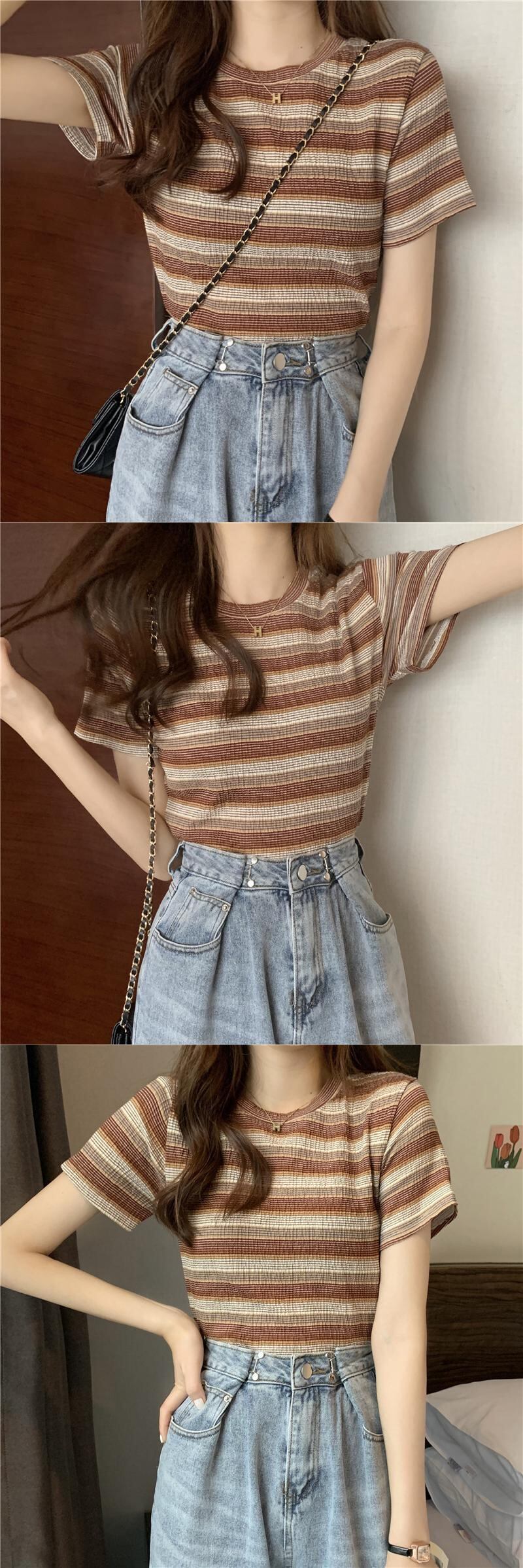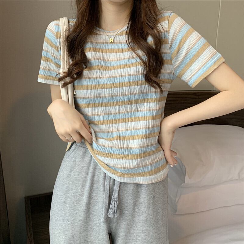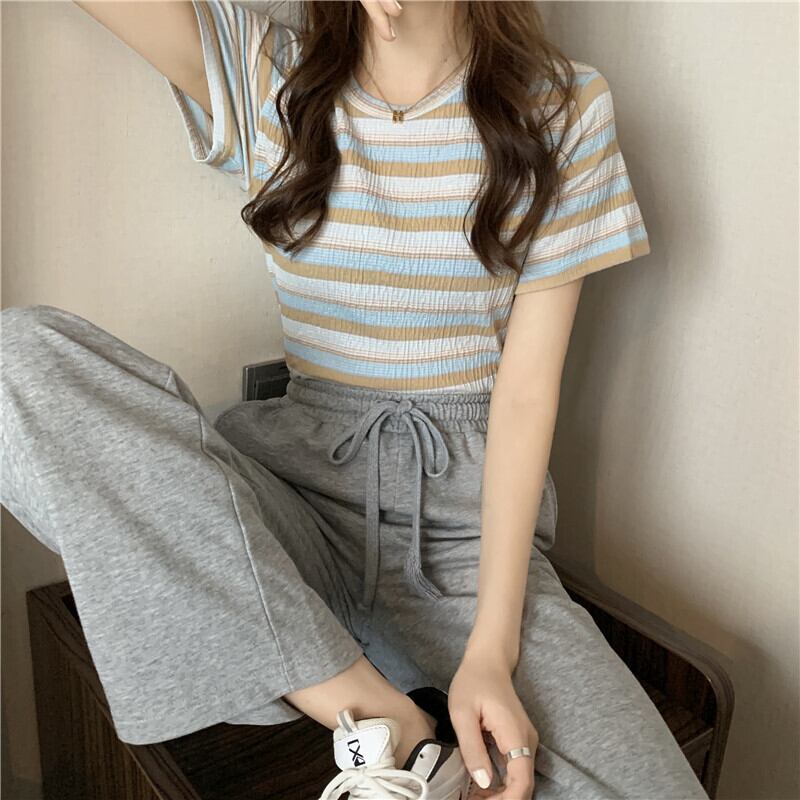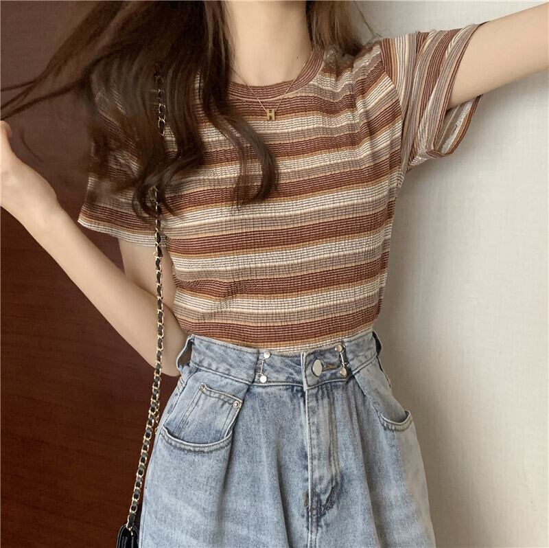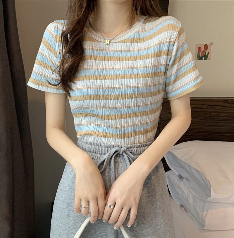 レインボーストライプ半袖Tシャツレディース2022年夏の新しいショートトップレディースデザインセンスニッチオールマッチスモールシャツイン サマー 夏物 7460087119947417 | framboise21