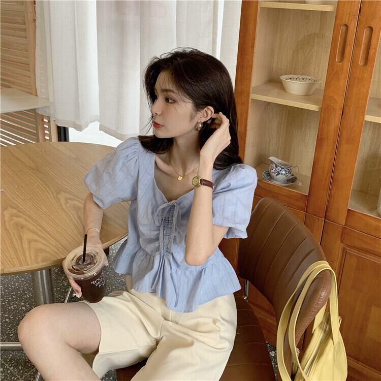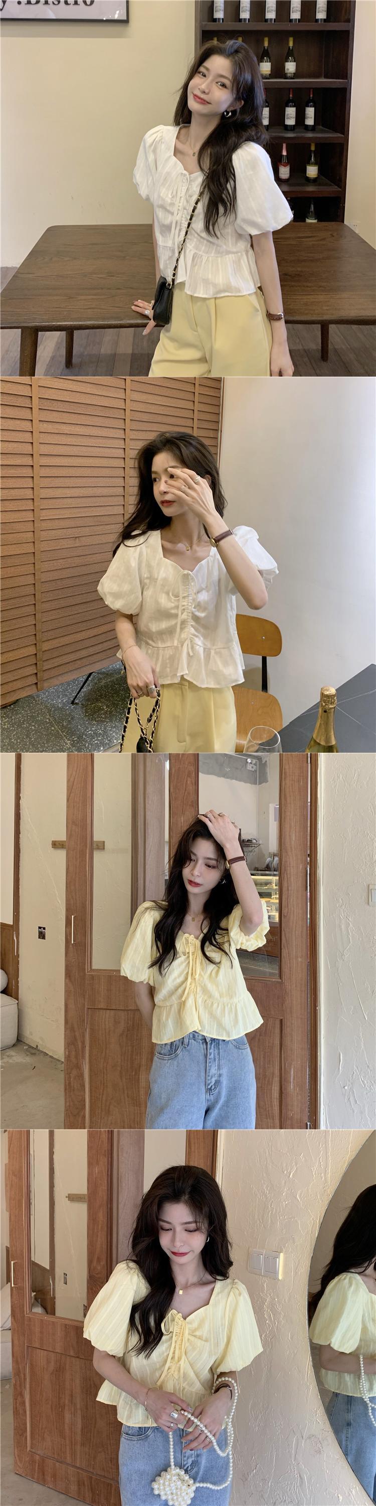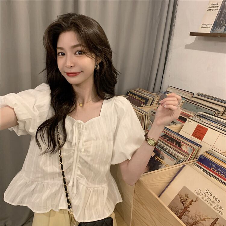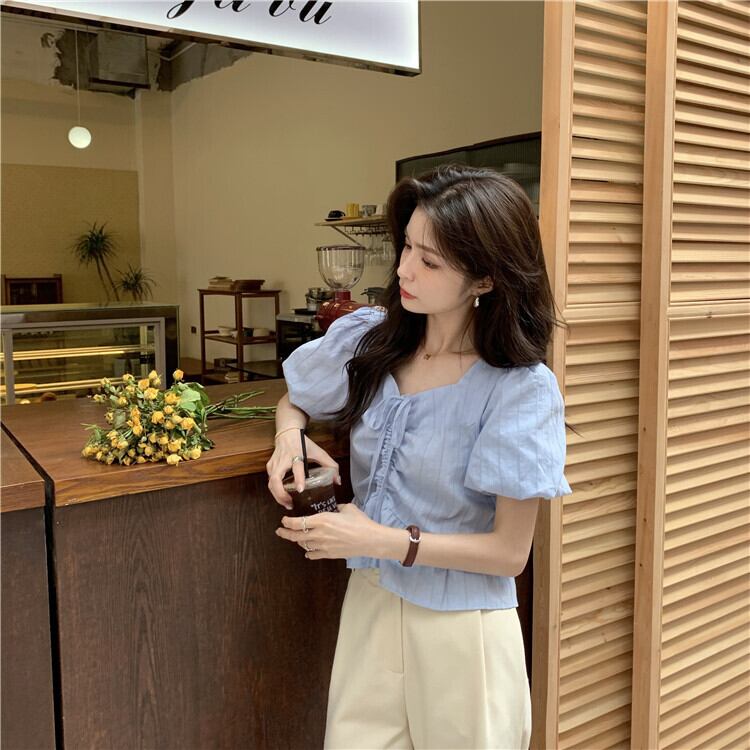 フレンチカラーボーンスクエアカラーホワイトシャツレディースサマーデザインニッチ巾着パフスリーブショートハイウエストトップ女性 ハイウェスト 夏物 スクウェア 7460010973523976 | framboise21