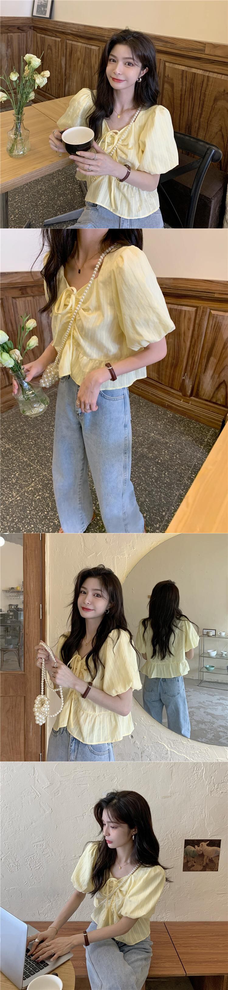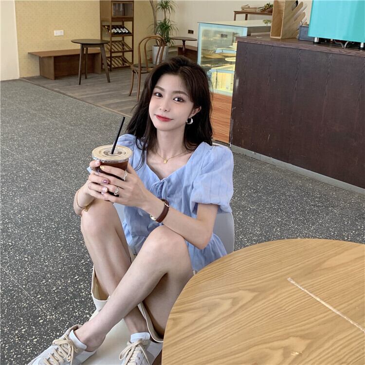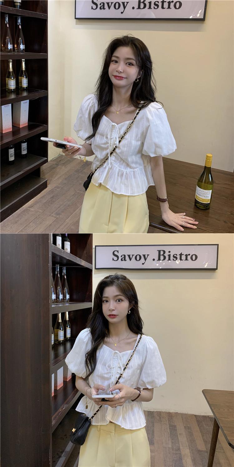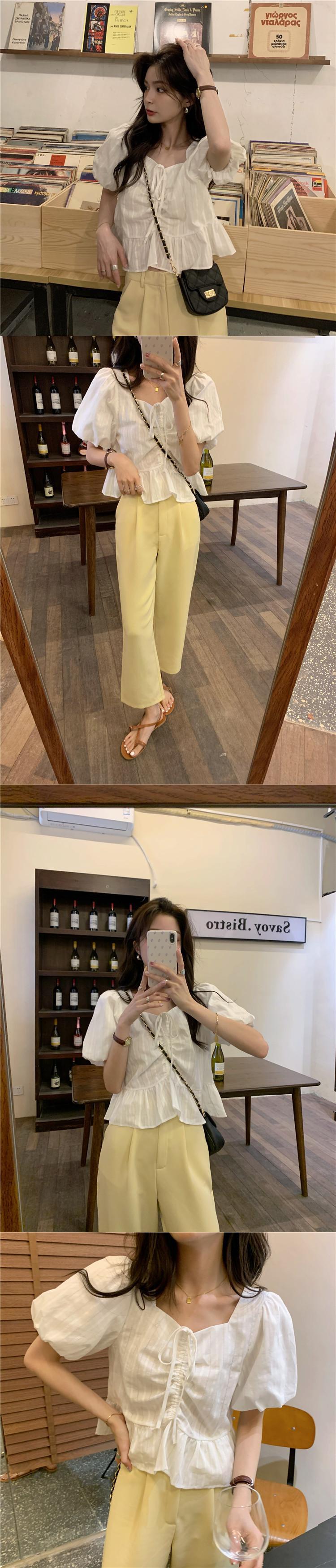 フレンチカラーボーンスクエアカラーホワイトシャツレディースサマーデザインニッチ巾着パフスリーブショートハイウエストトップ女性 ハイウェスト 夏物 スクウェア 7460010973523976 | framboise21