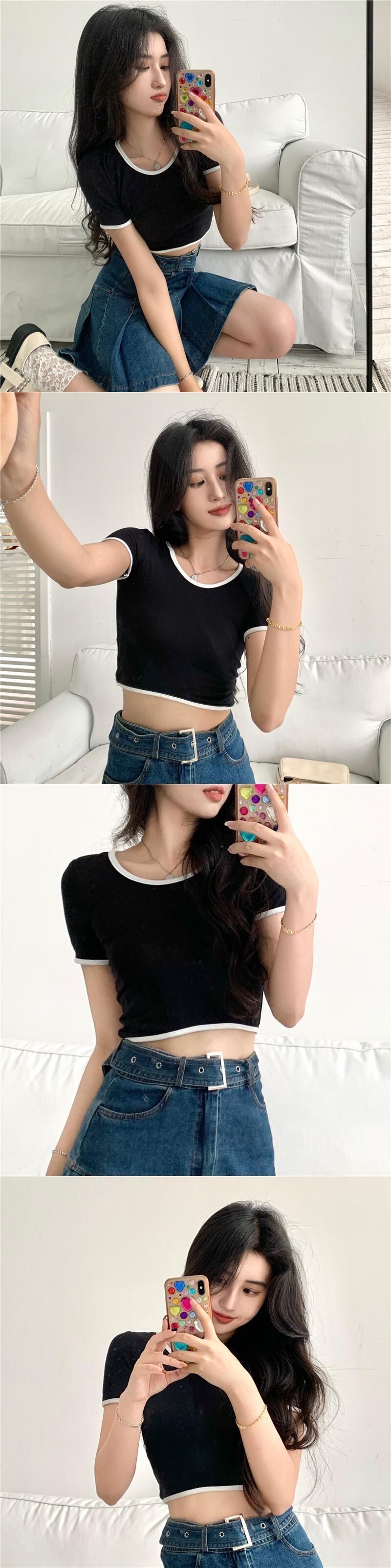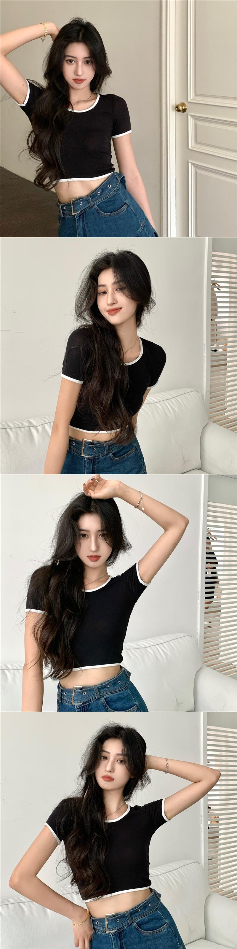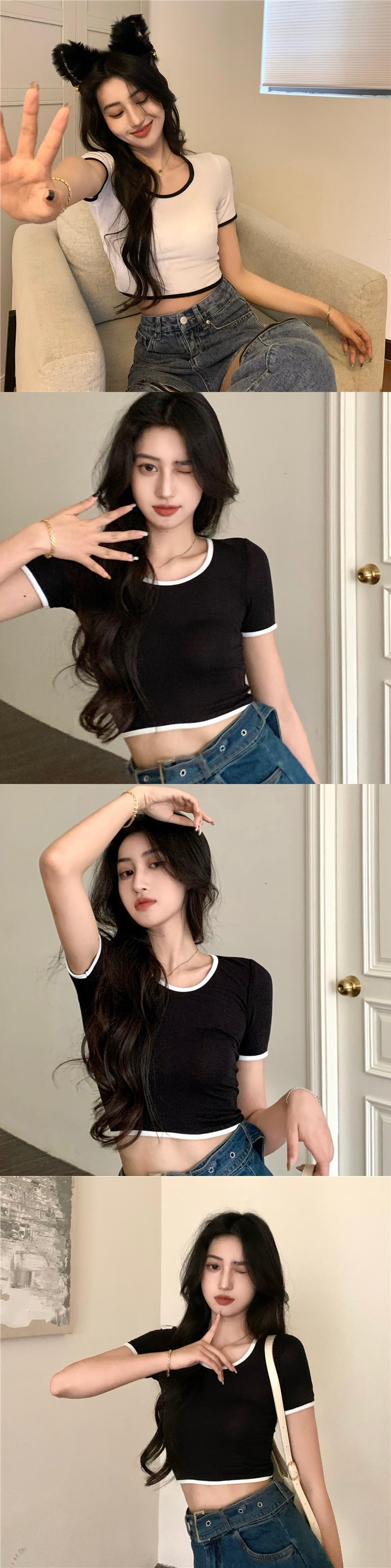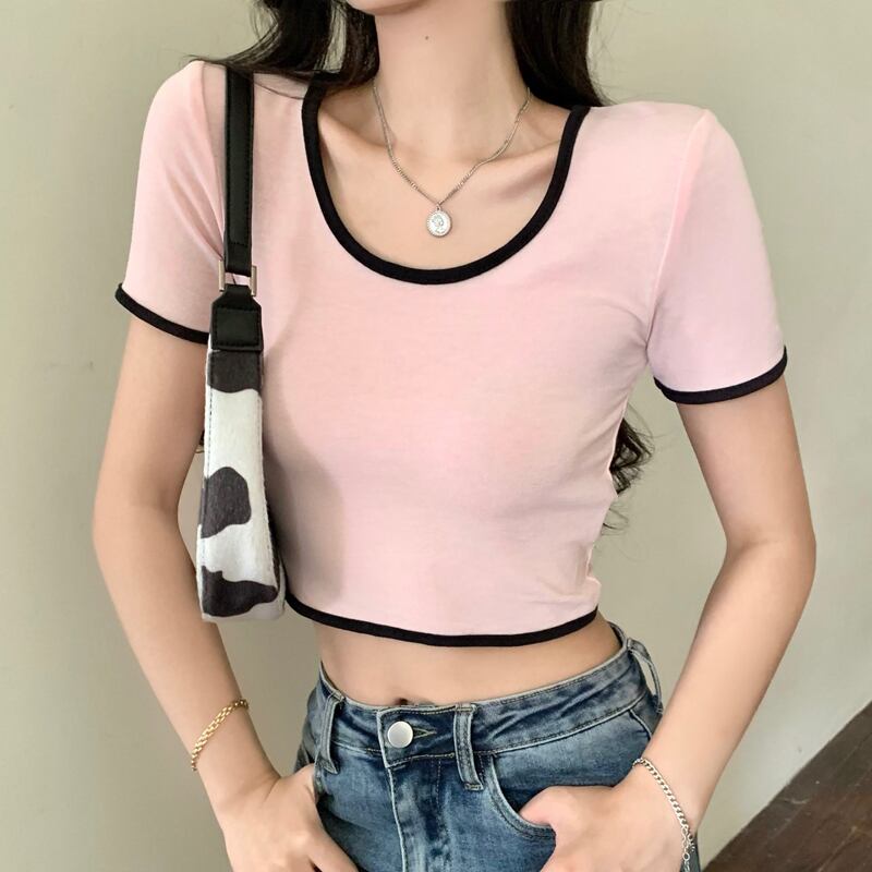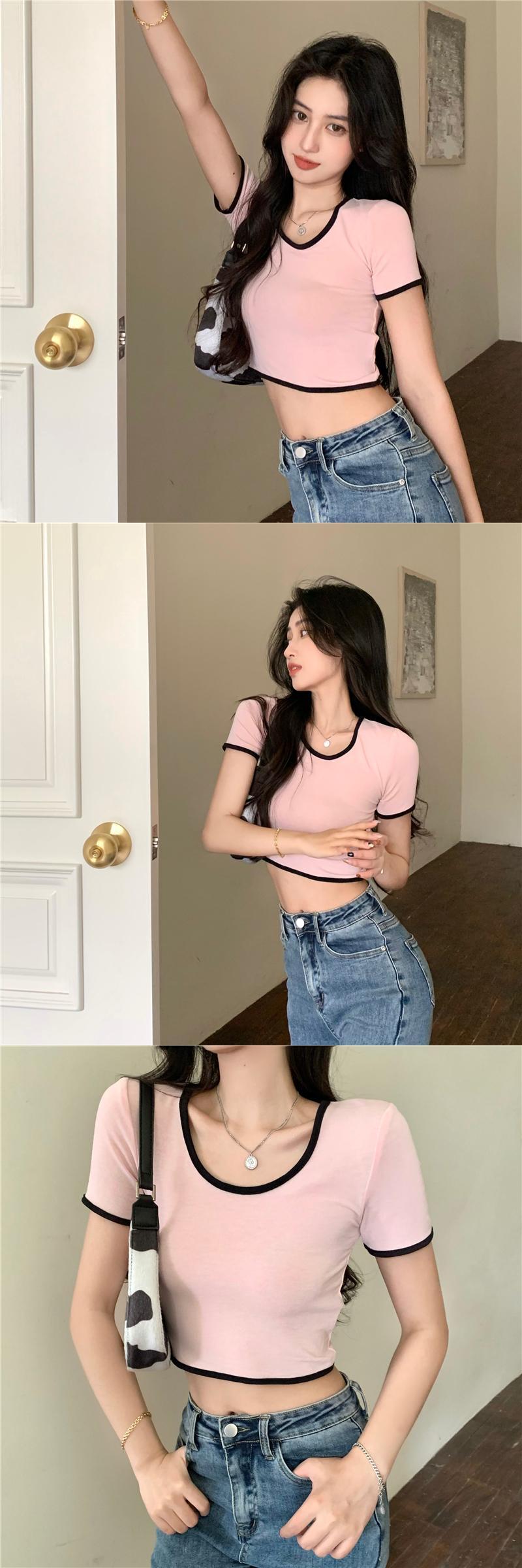 ホットピンクのショートTシャツ女性の夏の半袖タイトフィットデザイン小さなUネックフロントショルダー薄いハイウエストクロップドトップ ハイウェスト サマー 夏物 7460087669766728 | framboise21