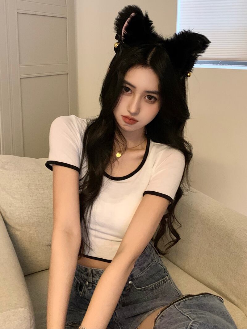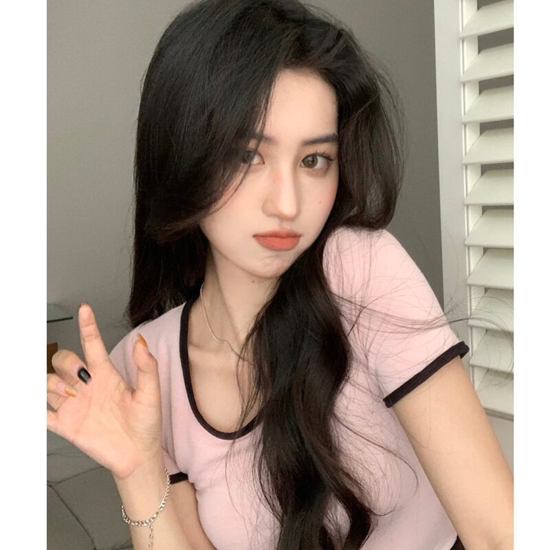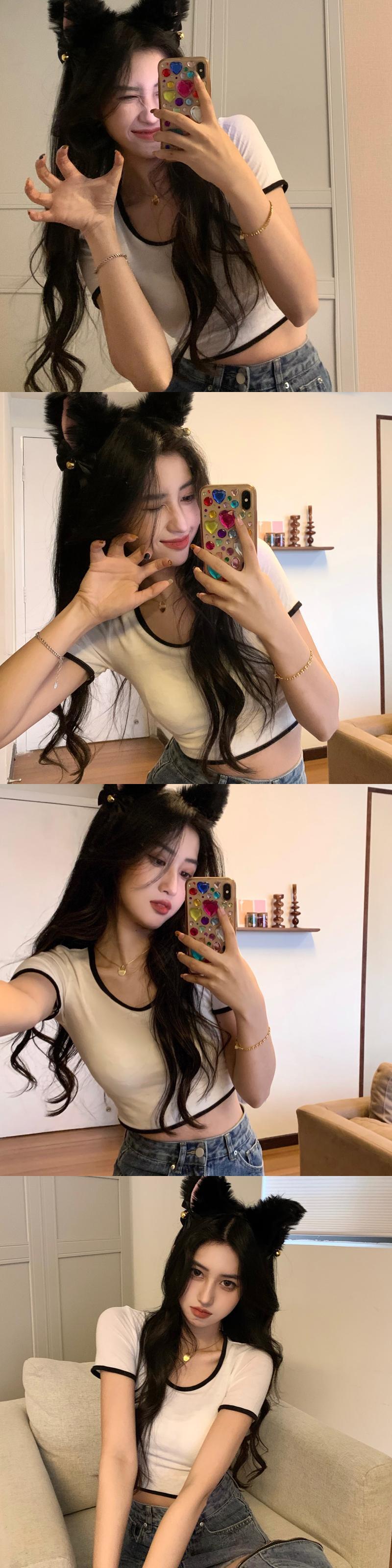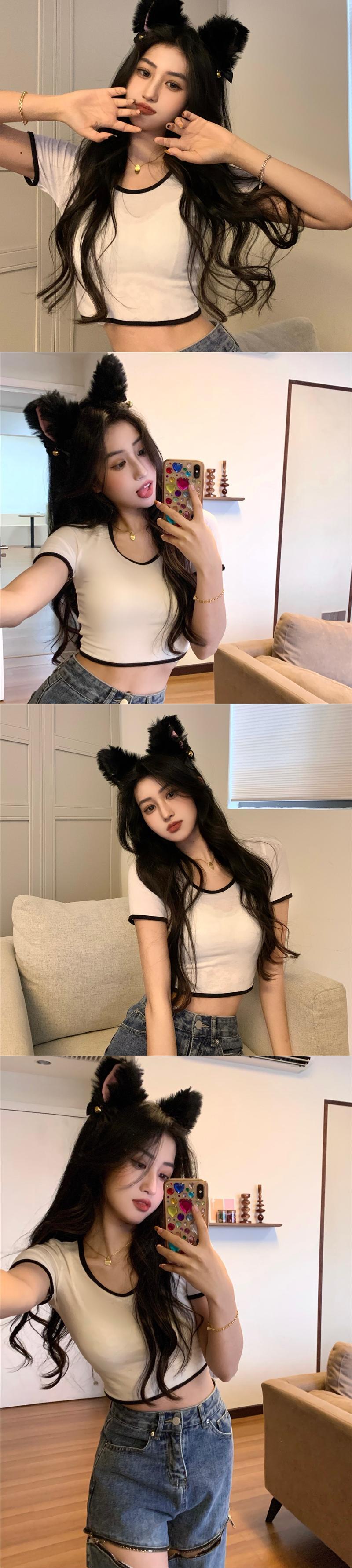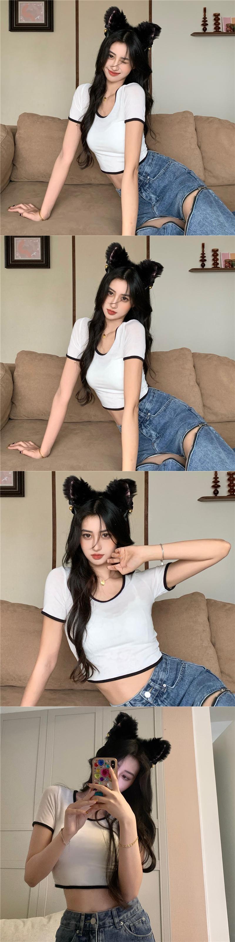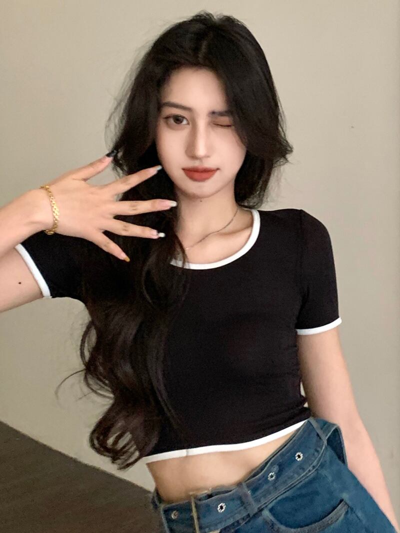 ホットピンクのショートTシャツ女性の夏の半袖タイトフィットデザイン小さなUネックフロントショルダー薄いハイウエストクロップドトップ ハイウェスト サマー 夏物 7460087669766728 | framboise21