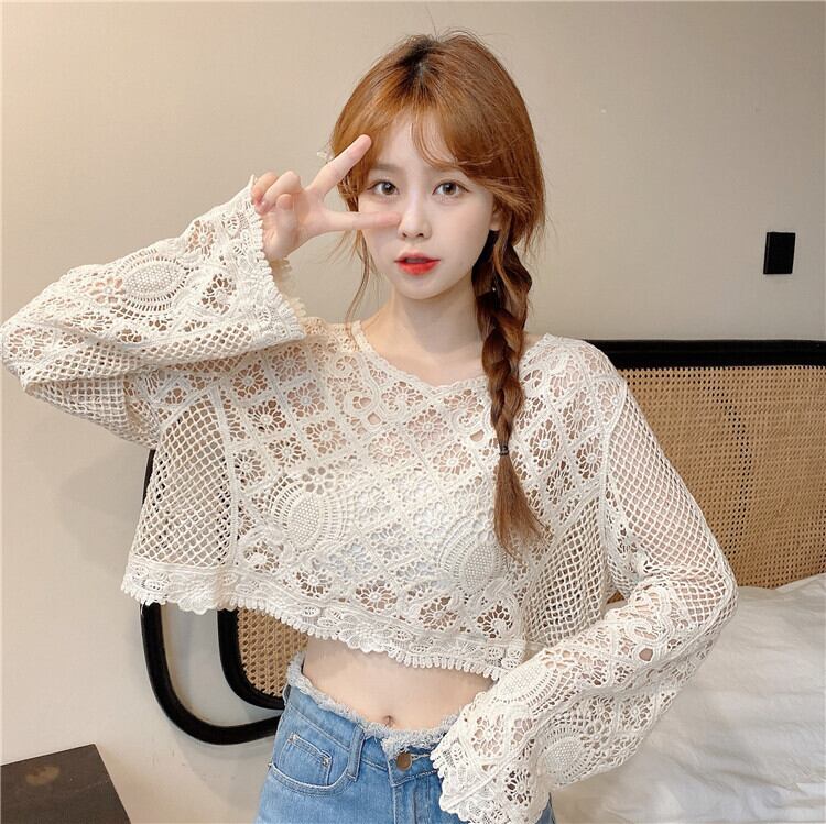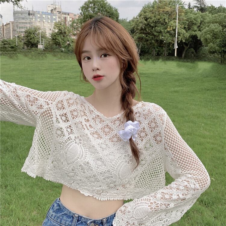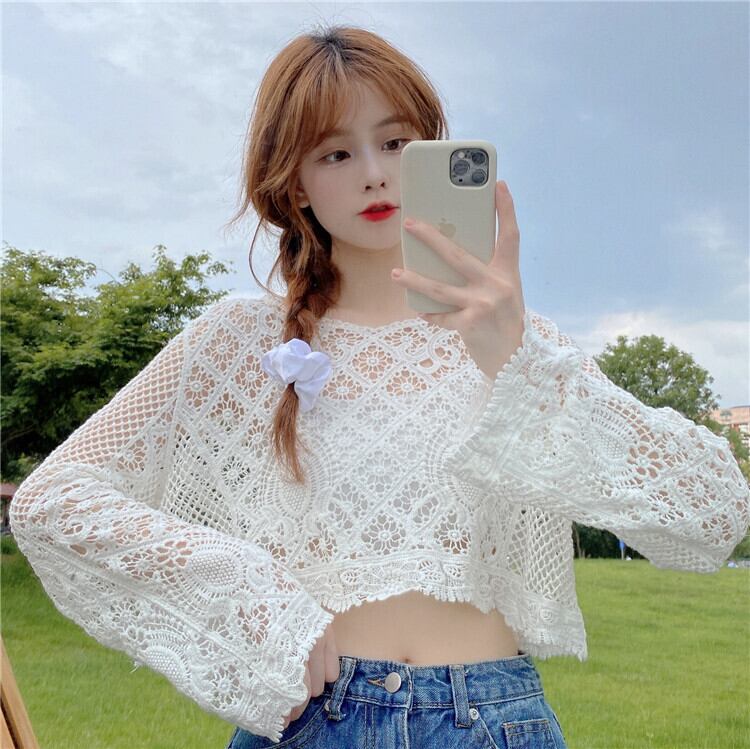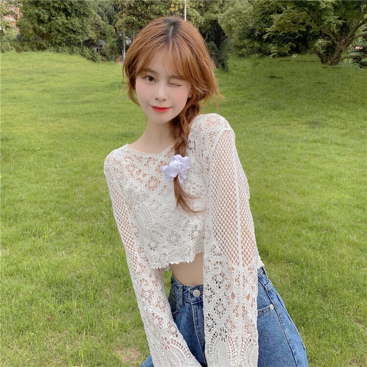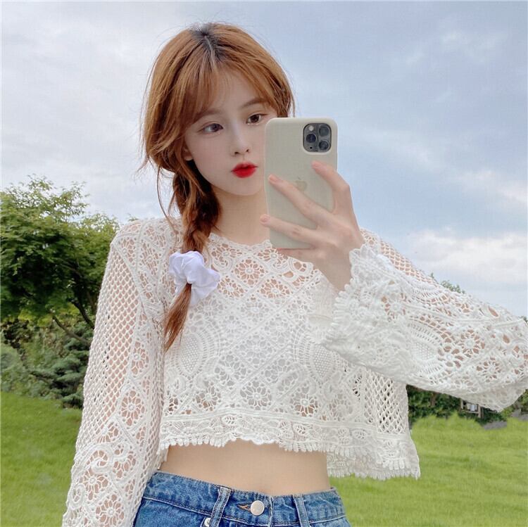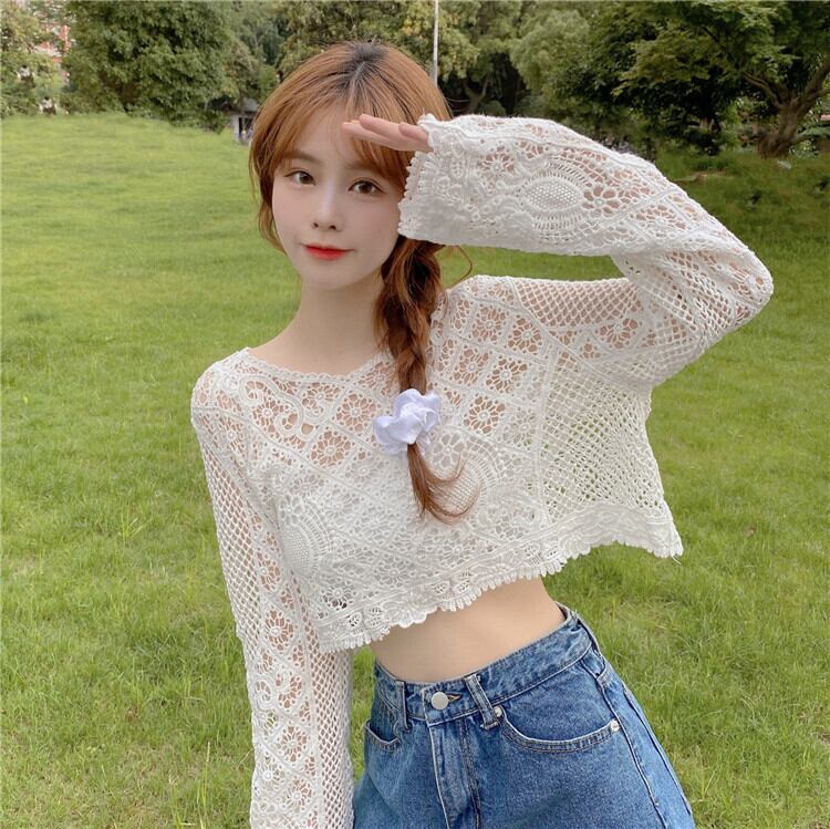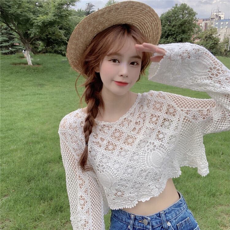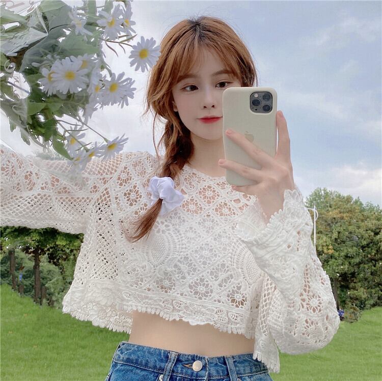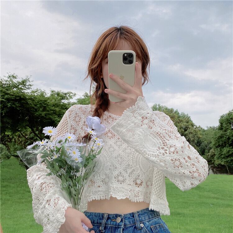ニッチショートブラウス甘い中空の小さなシャツ薄いニットの日焼け止めシャツルーズプルオーバーレースシャツ女性の夏のトップス 大人ガーリー スウィート キュート カジュアル サマー 夏物 7460084838208506 | framboise21