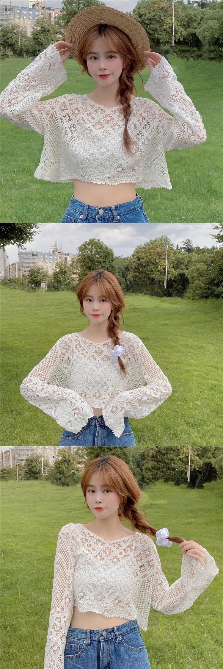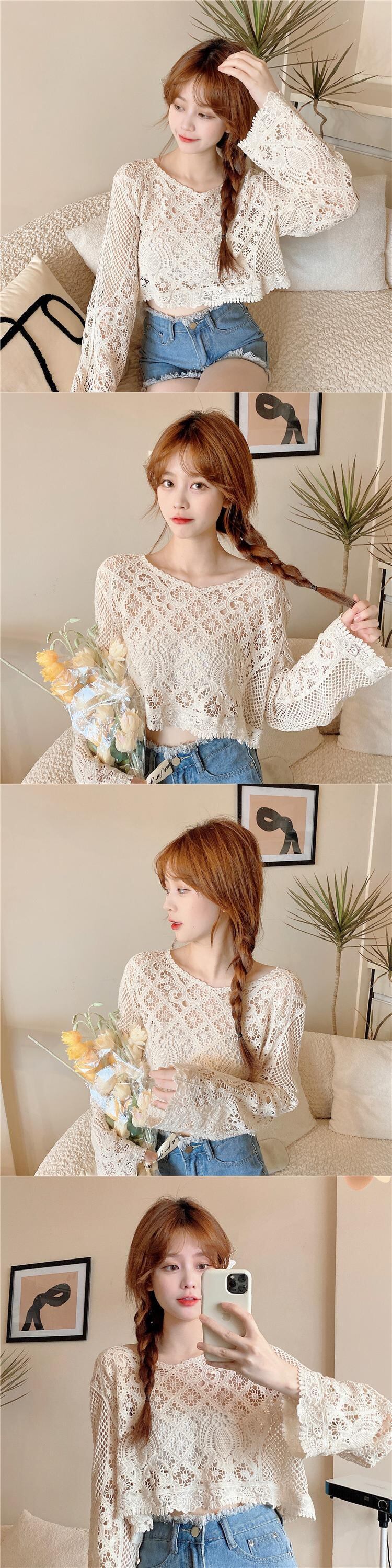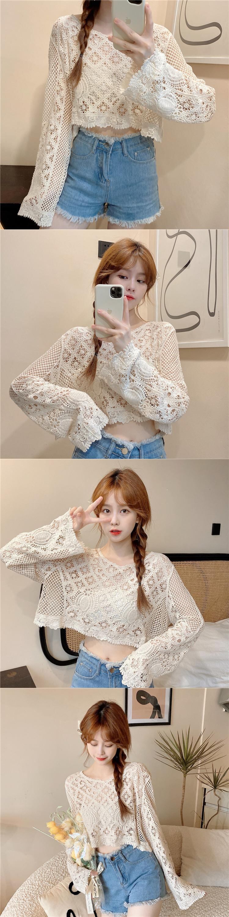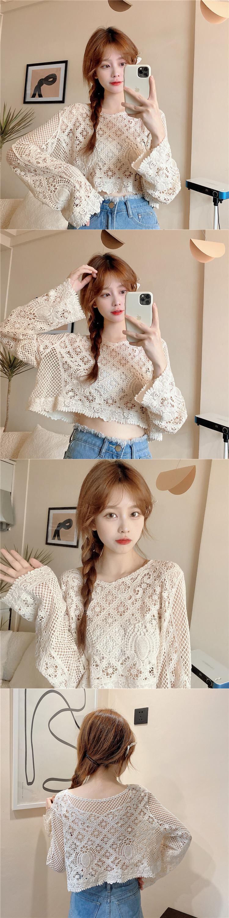ニッチショートブラウス甘い中空の小さなシャツ薄いニットの日焼け止めシャツルーズプルオーバーレースシャツ女性の夏のトップス 大人ガーリー スウィート キュート カジュアル サマー 夏物 7460084838208506 | framboise21