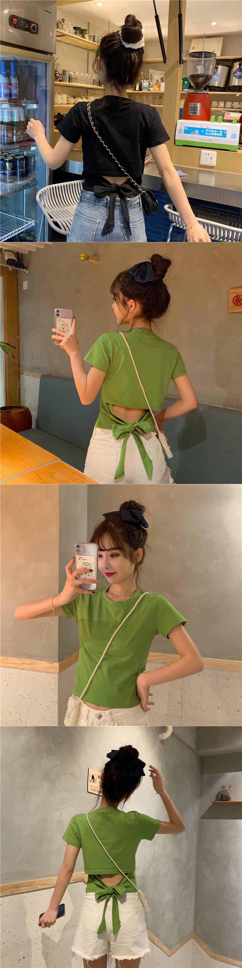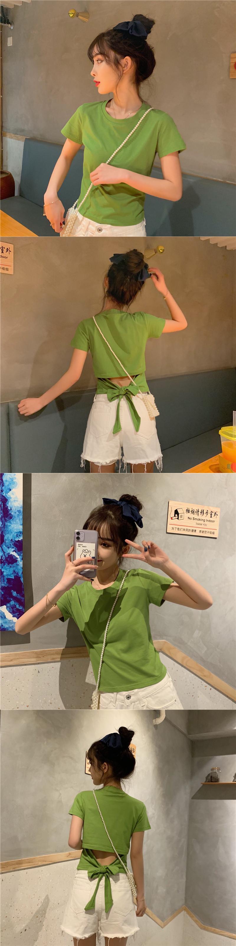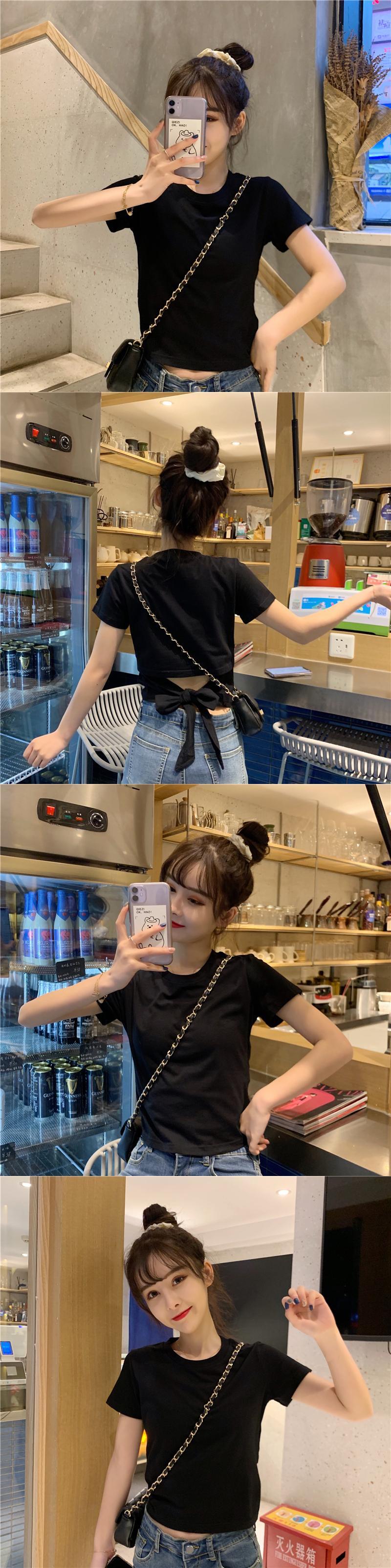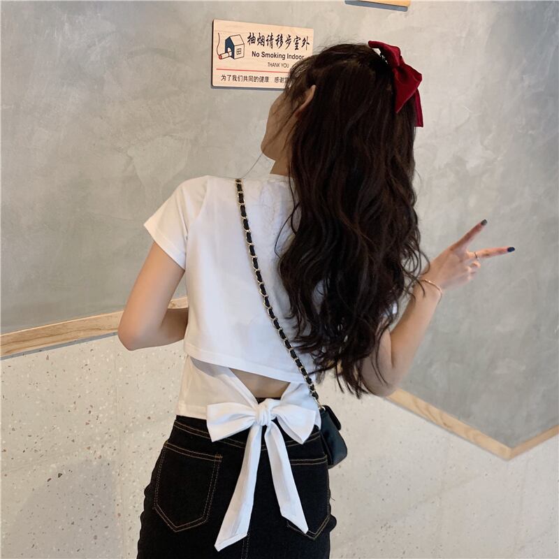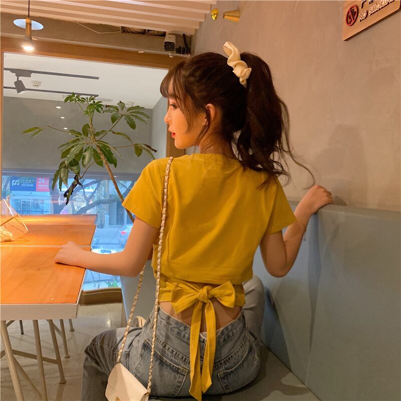 不規則な背中の開いた半袖Tシャツ女性の夏のニッチなデザインの蝶ネクタイハイウエストショートシックなトップ ハイウェスト リボン サマー 夏物 7460071544997302 | framboise21