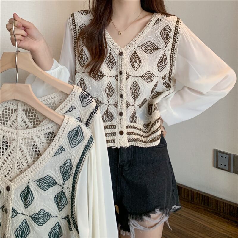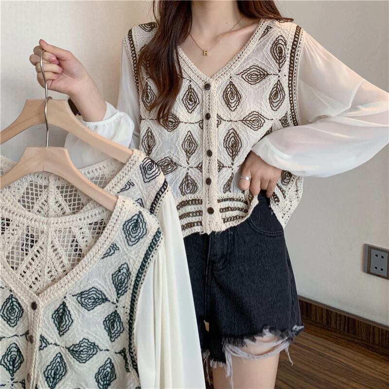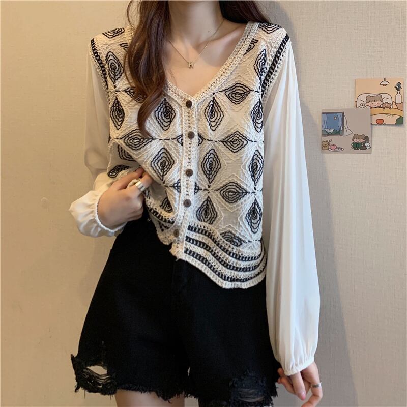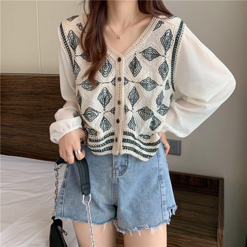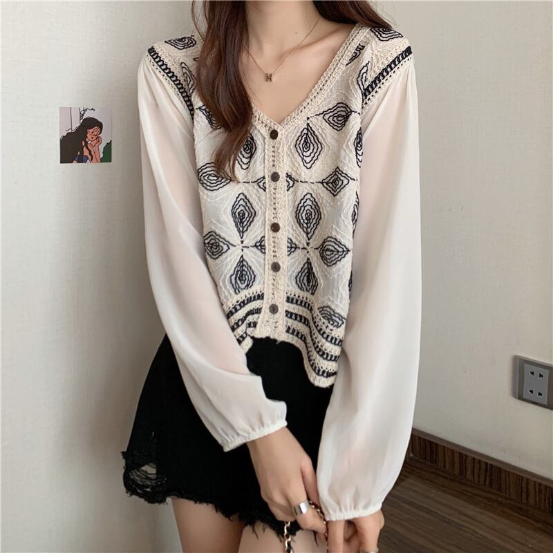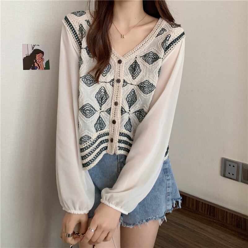 2022年春秋新作ステッチシフォン長袖トップレディースアウターレトロVネックニットセーターニッチシックカーディガン ロング スプリング 春物 オータム 秋物 7460049756184390 | framboise21