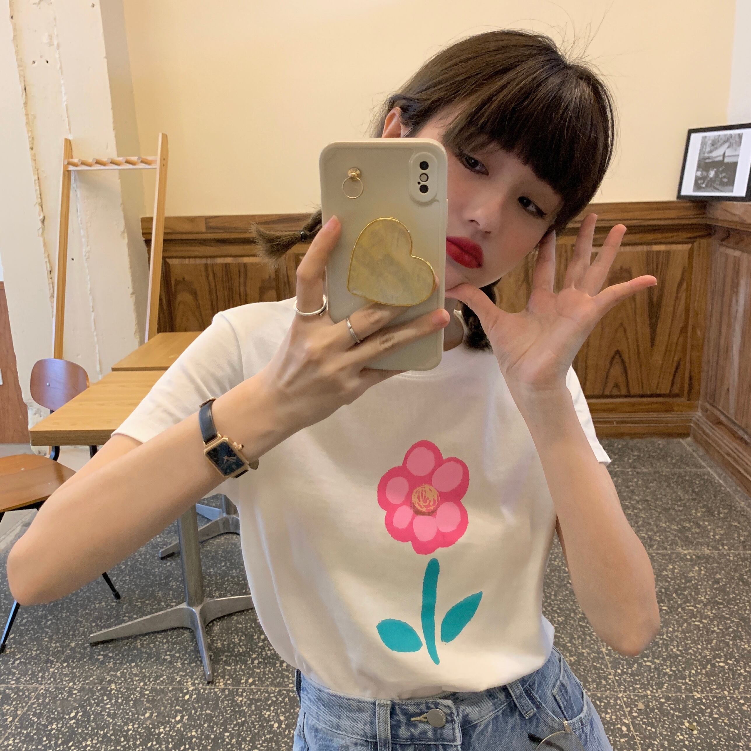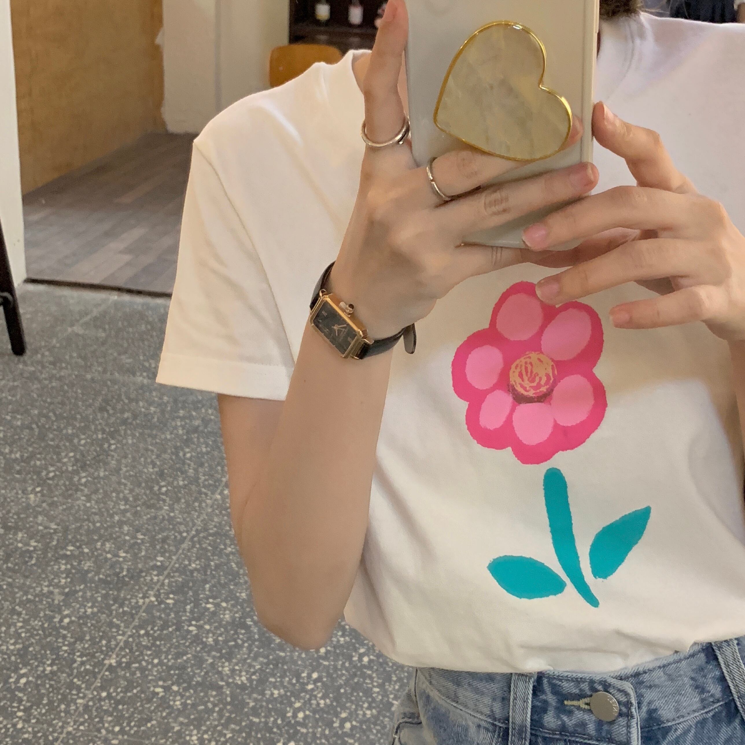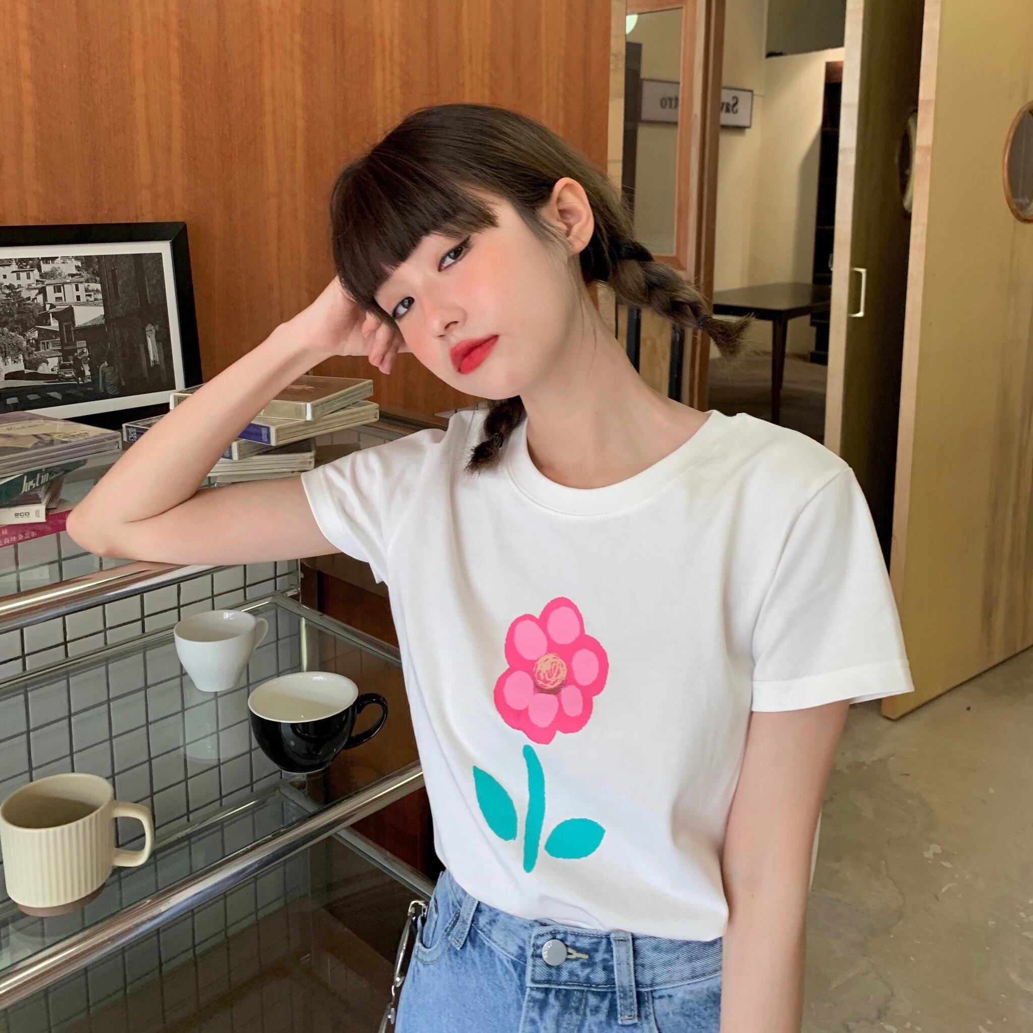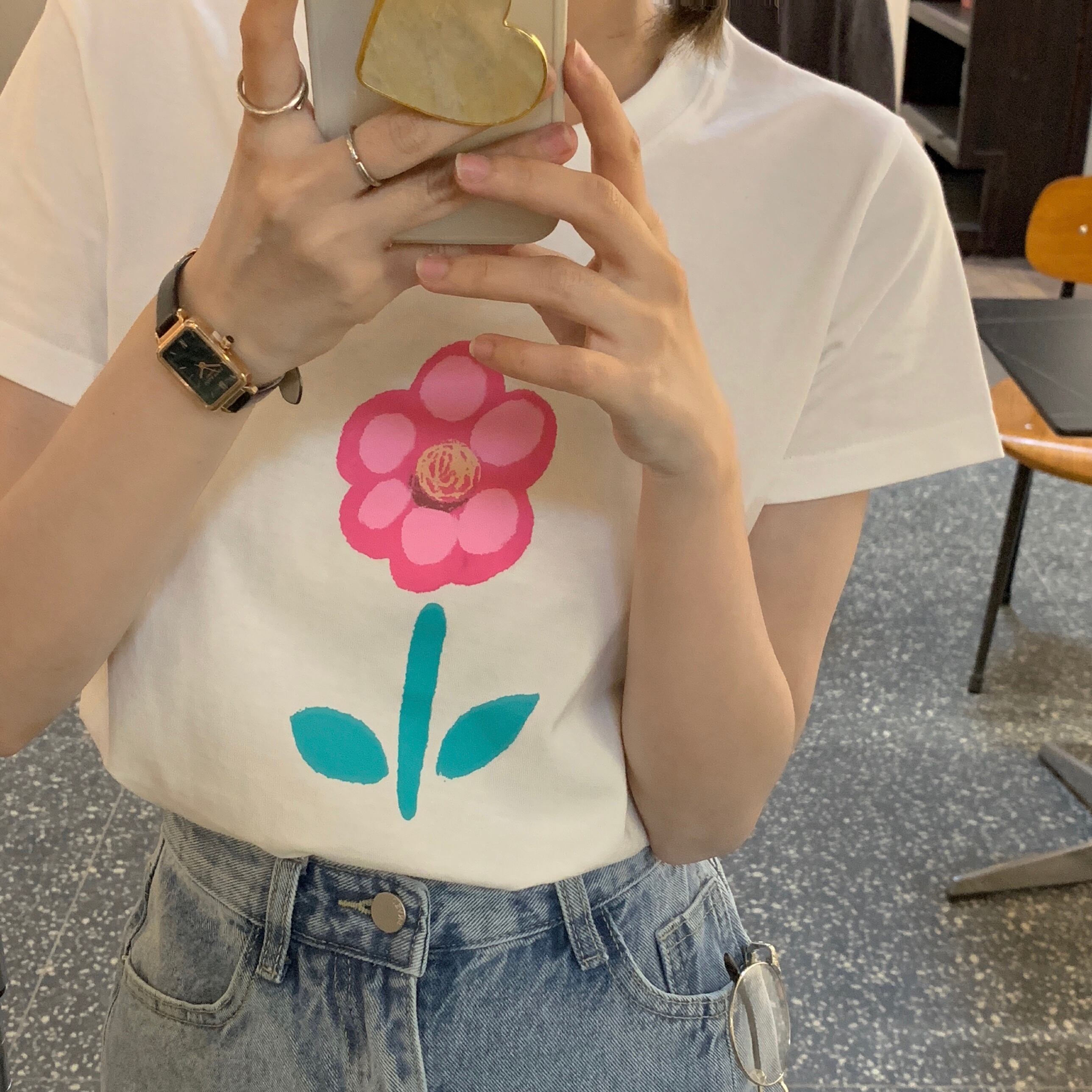 シンプルなフラワープリントの半袖Tシャツの女性の春と夏の小さな丸い首の緩いオールマッチボトミングシャツトップのバージョン スプリング 春物 サマー 夏物 Oネック フラワーデザイン 746006488959655 | framboise21